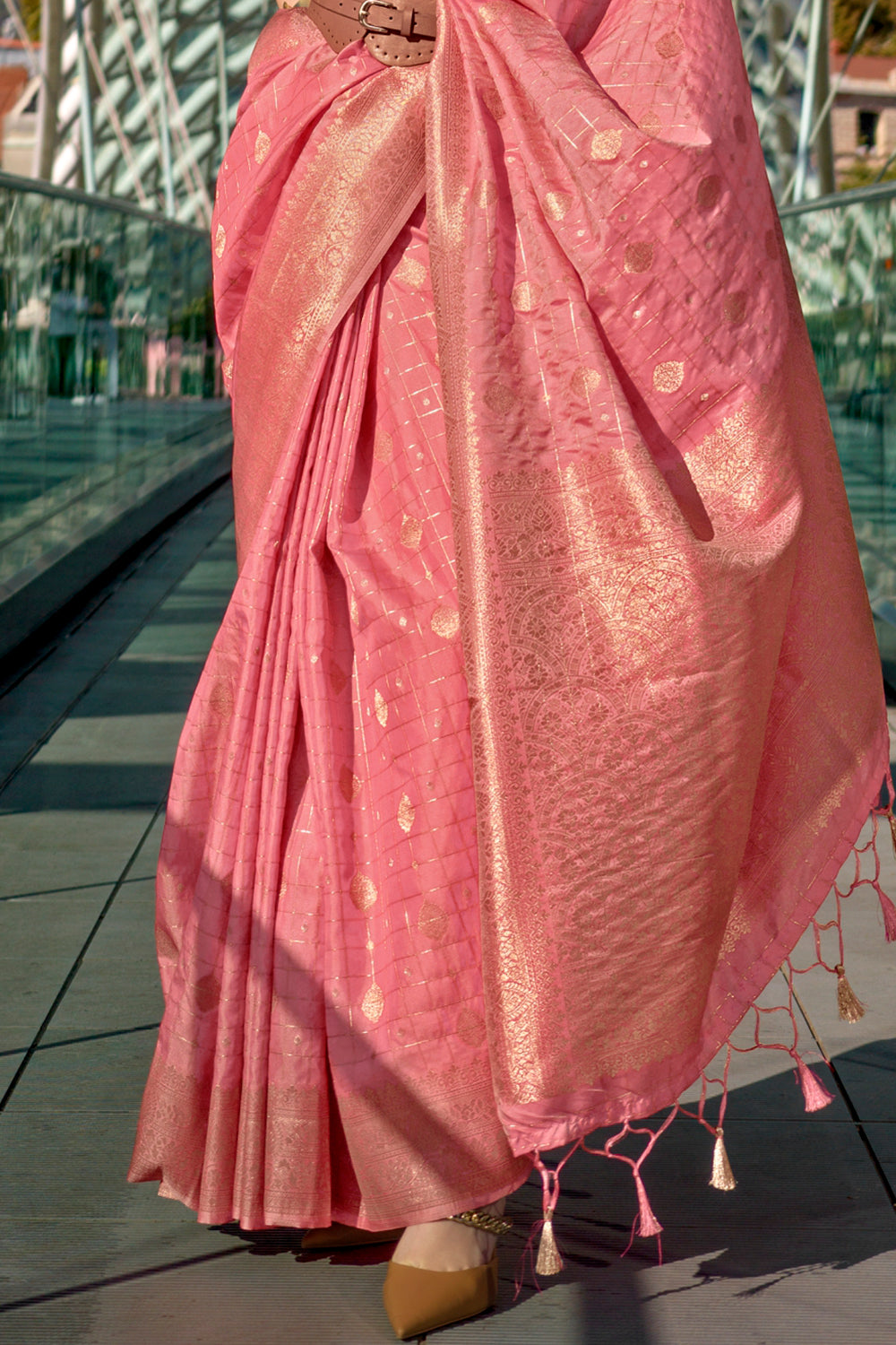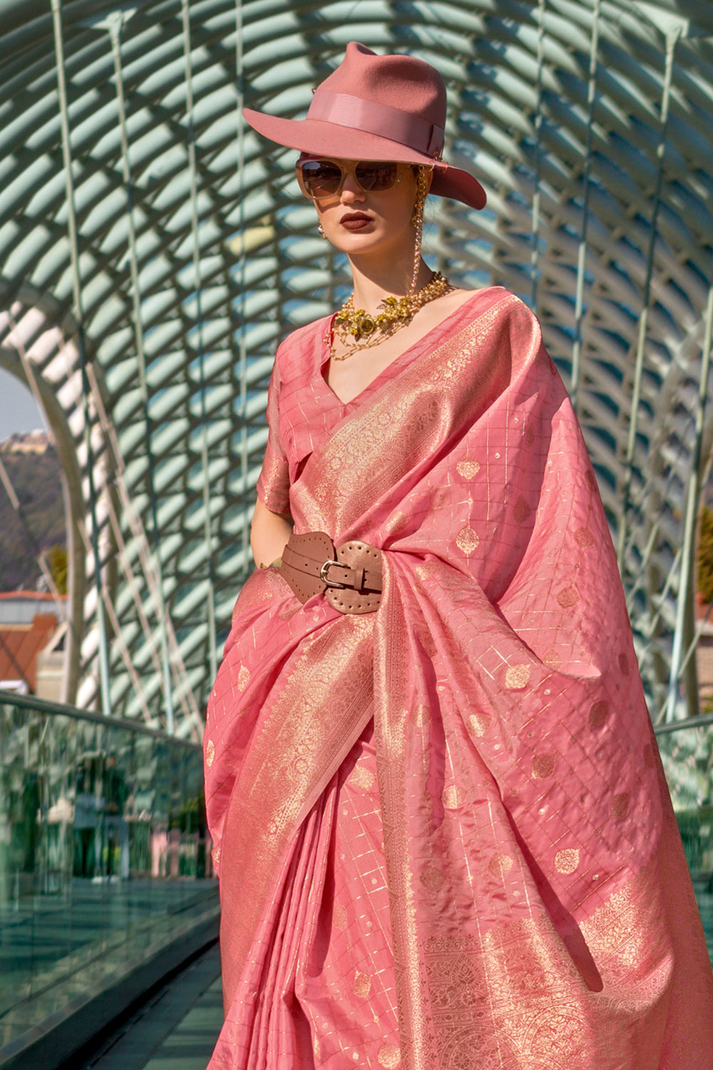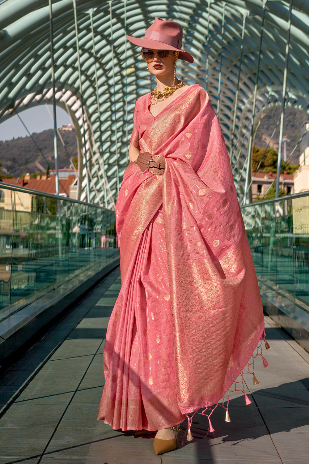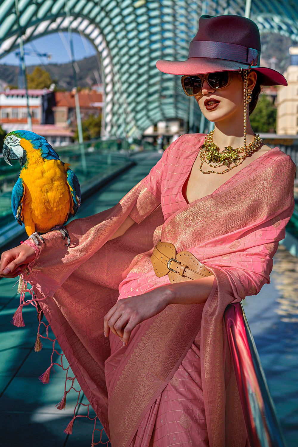 पीच कटन बनारसी और चेक्स साड़ी ब्लाउज के साथ