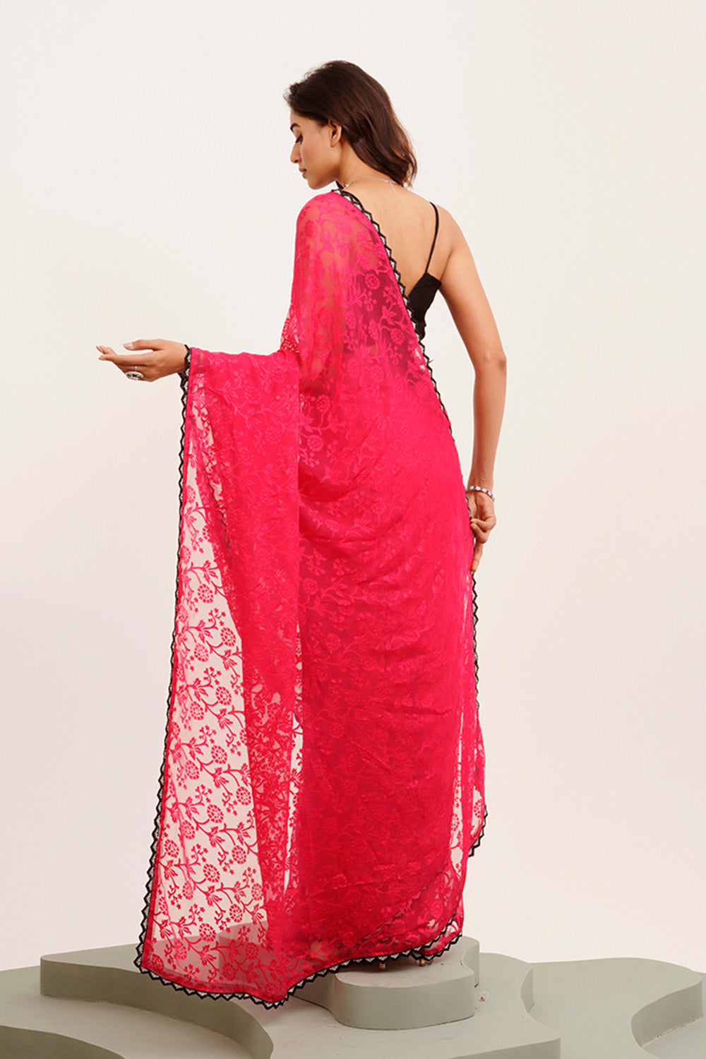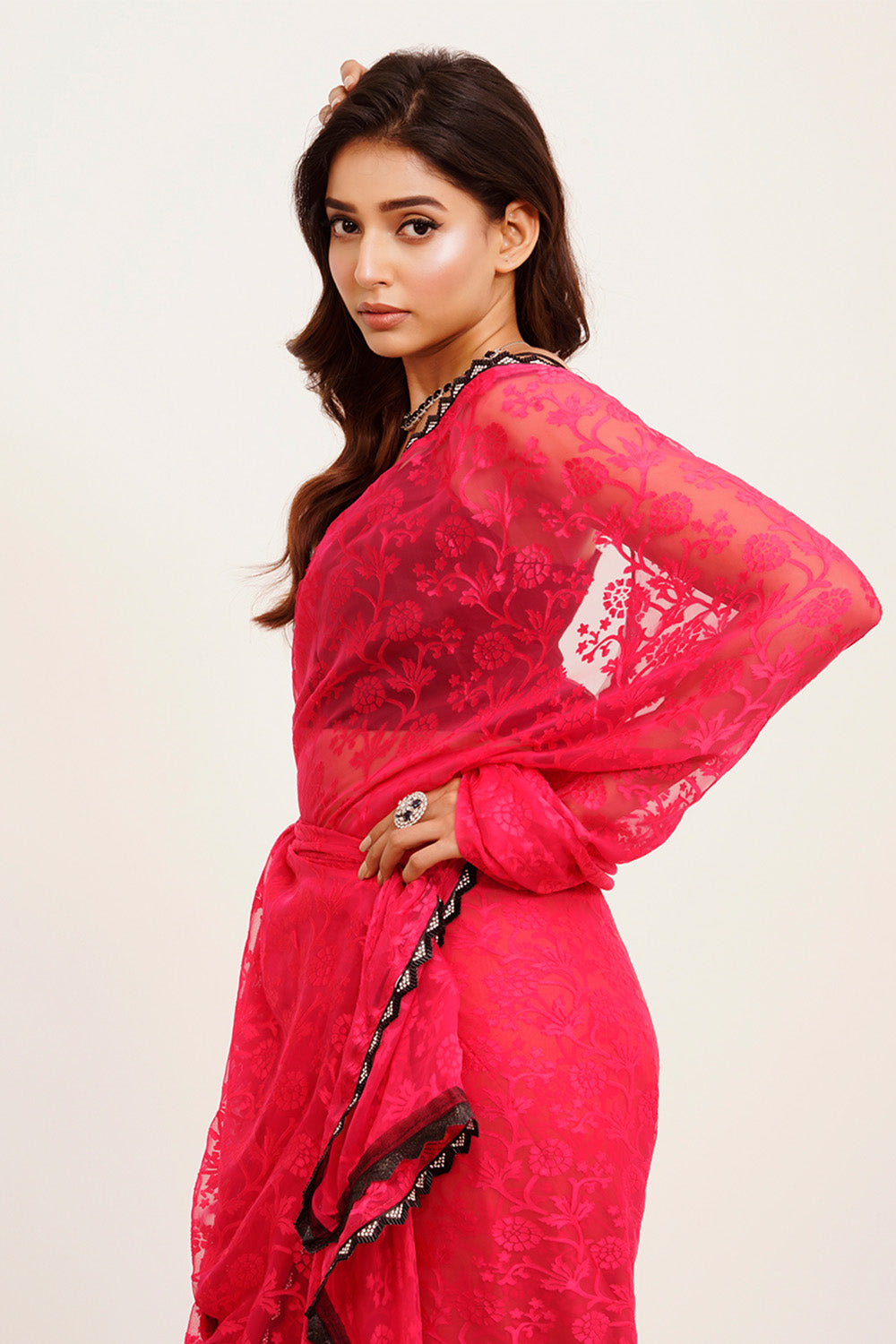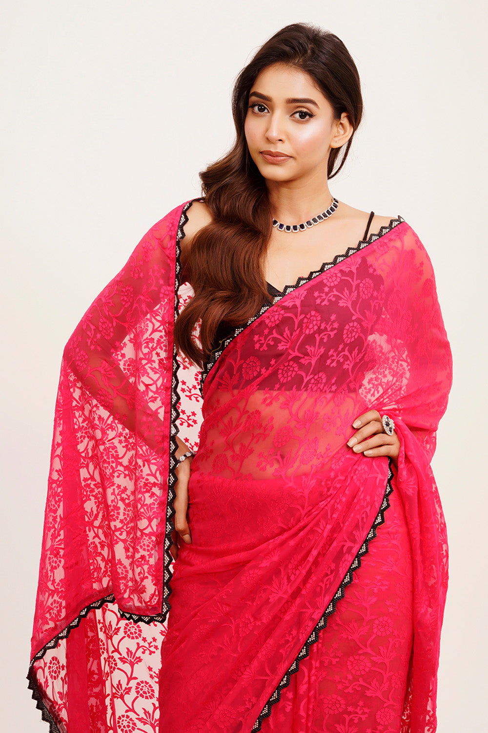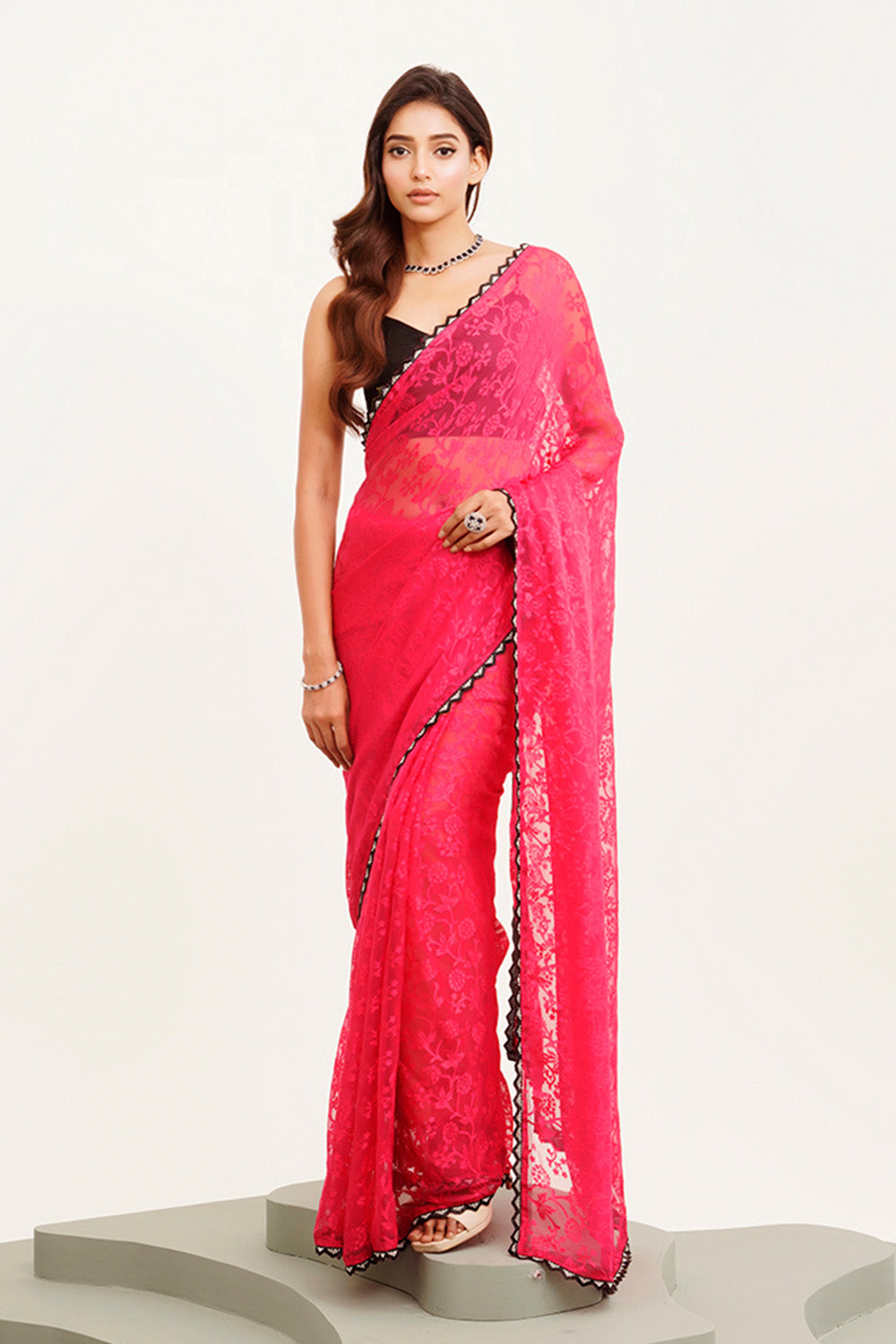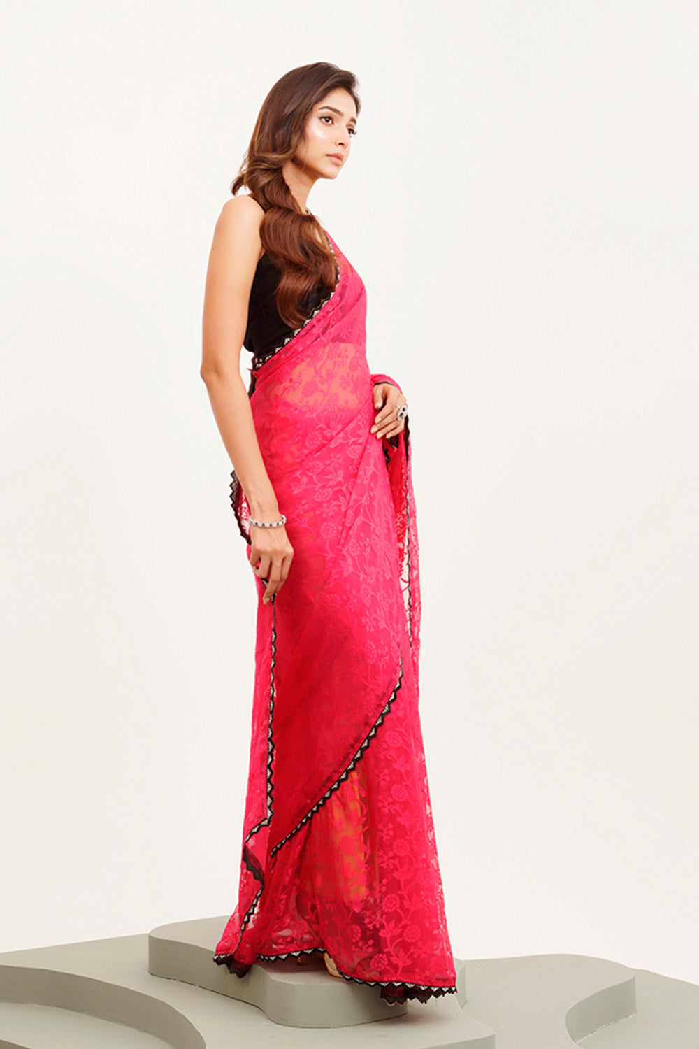 Embrace elegance with this Pink Beads and Stones Saree accompanied by a matching blouse. Crafted with intricate beadwork and sparkling stones, it offers a refined texture and subtle shine, perfect for festive occasions or formal events. The complementary blouse enhances the ensemble's cohesive appeal, ensuring a polished and sophisticated look. Designed for those who appreciate detailed craftsmanship, this saree combines traditional artistry with contemporary elegance.