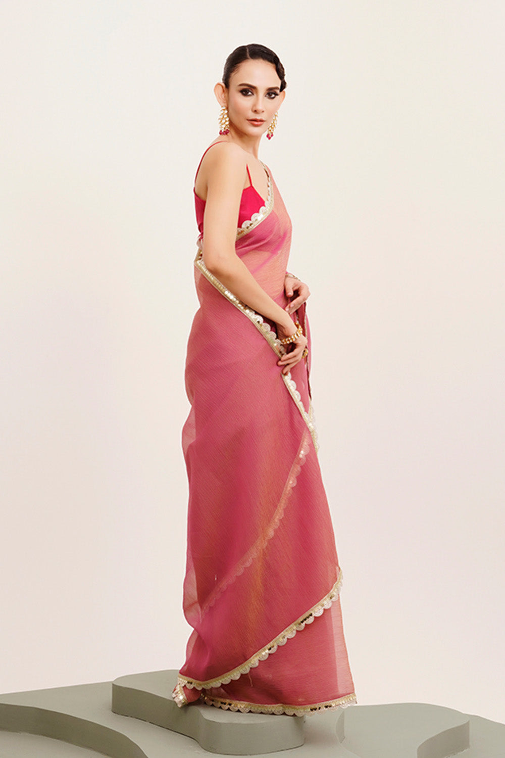 Elevate your traditional wardrobe with this Pink Sequinned Tissue Saree, expertly crafted for a delicate yet dazzling look. The fine tissue fabric ensures a lightweight drape, while intricate sequin work adds subtle sparkle perfect for festive occasions. Included with a matching blouse, this saree offers effortless styling with an elegant finish, making it ideal for celebrations and formal events. Its vibrant pink hue complements a range of accessories, allowing for personalized styling with expert finesse.