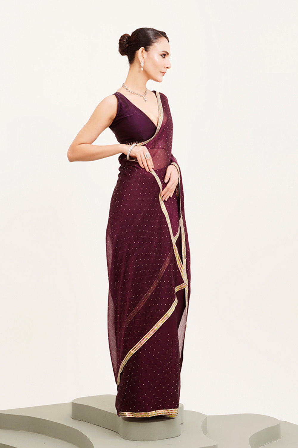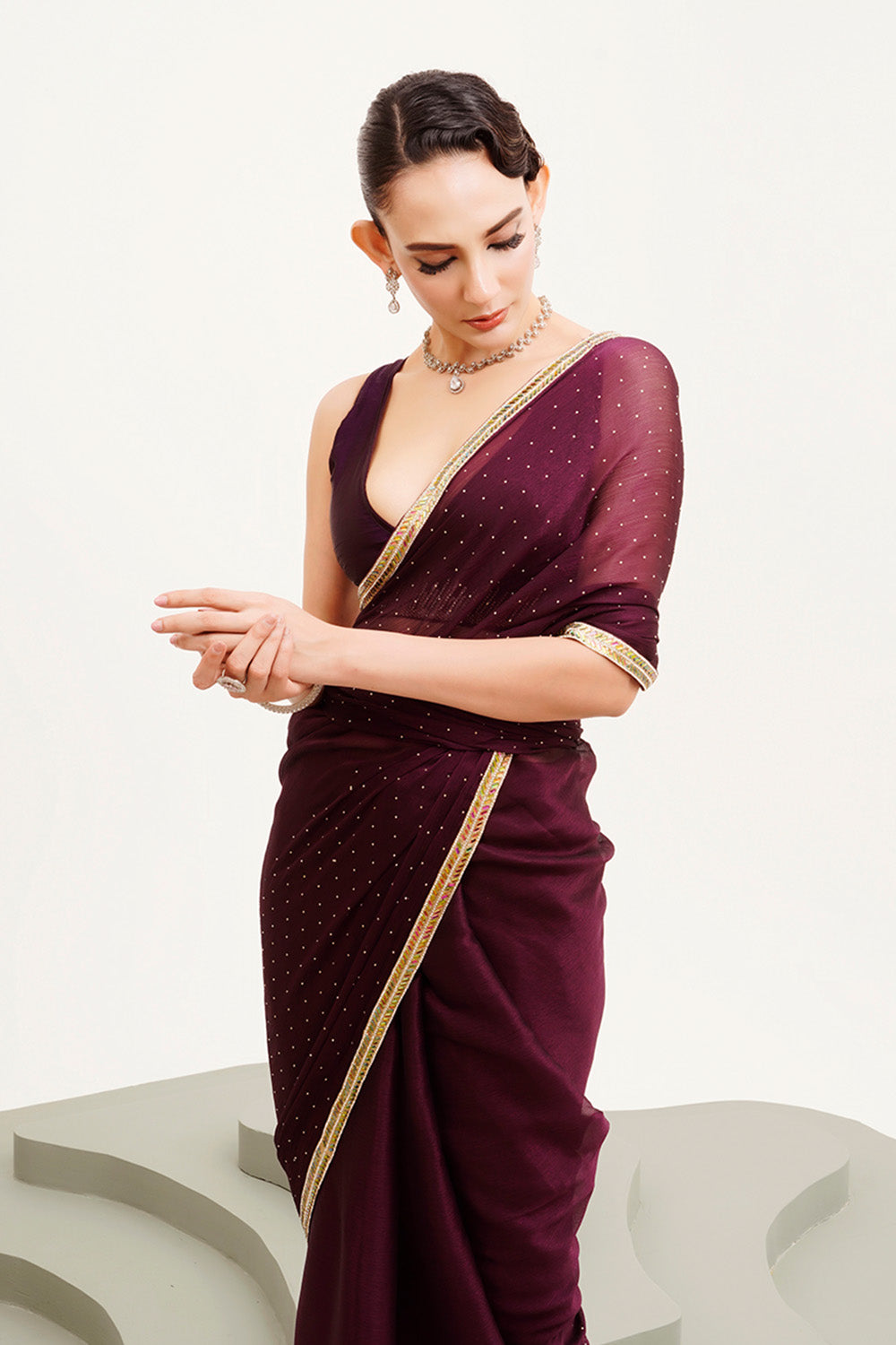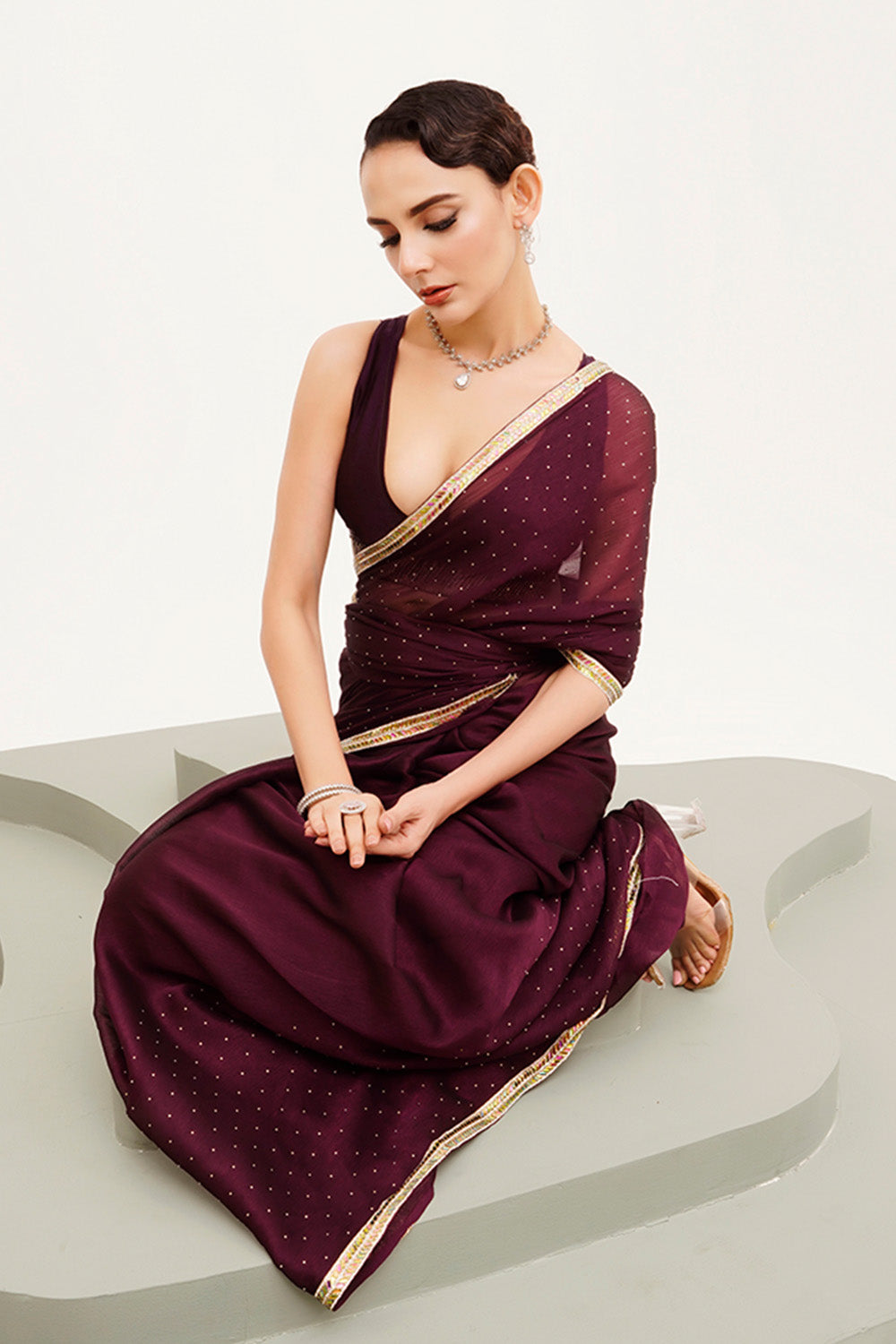 Maroon Beads And Stones Chiffon Saree With Blouse