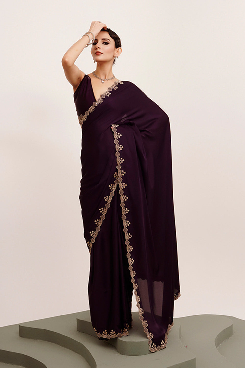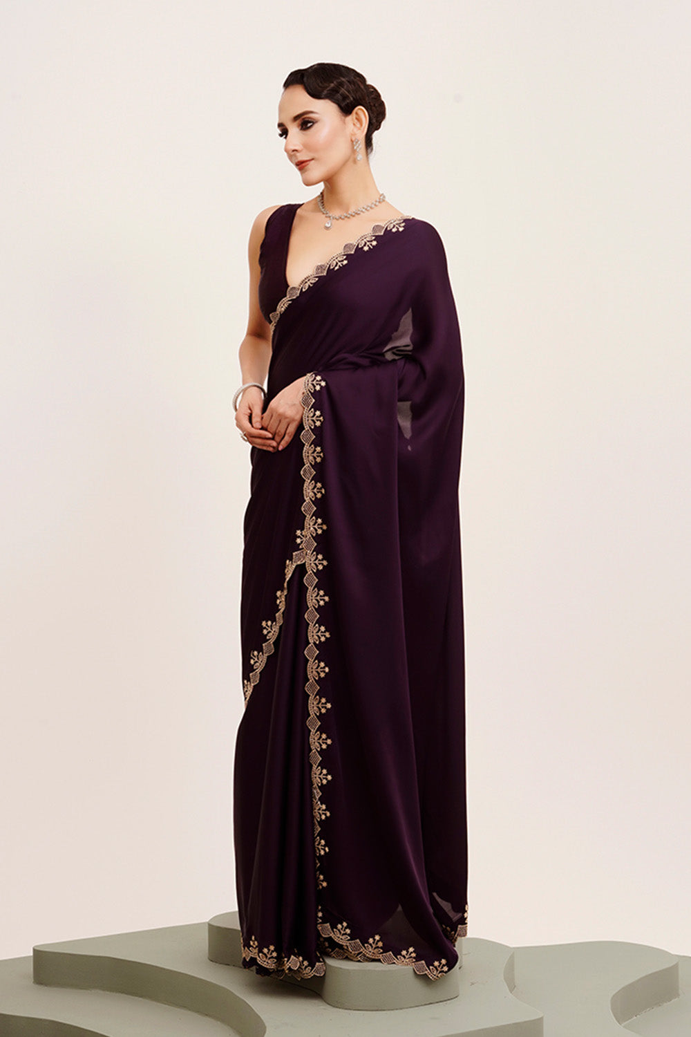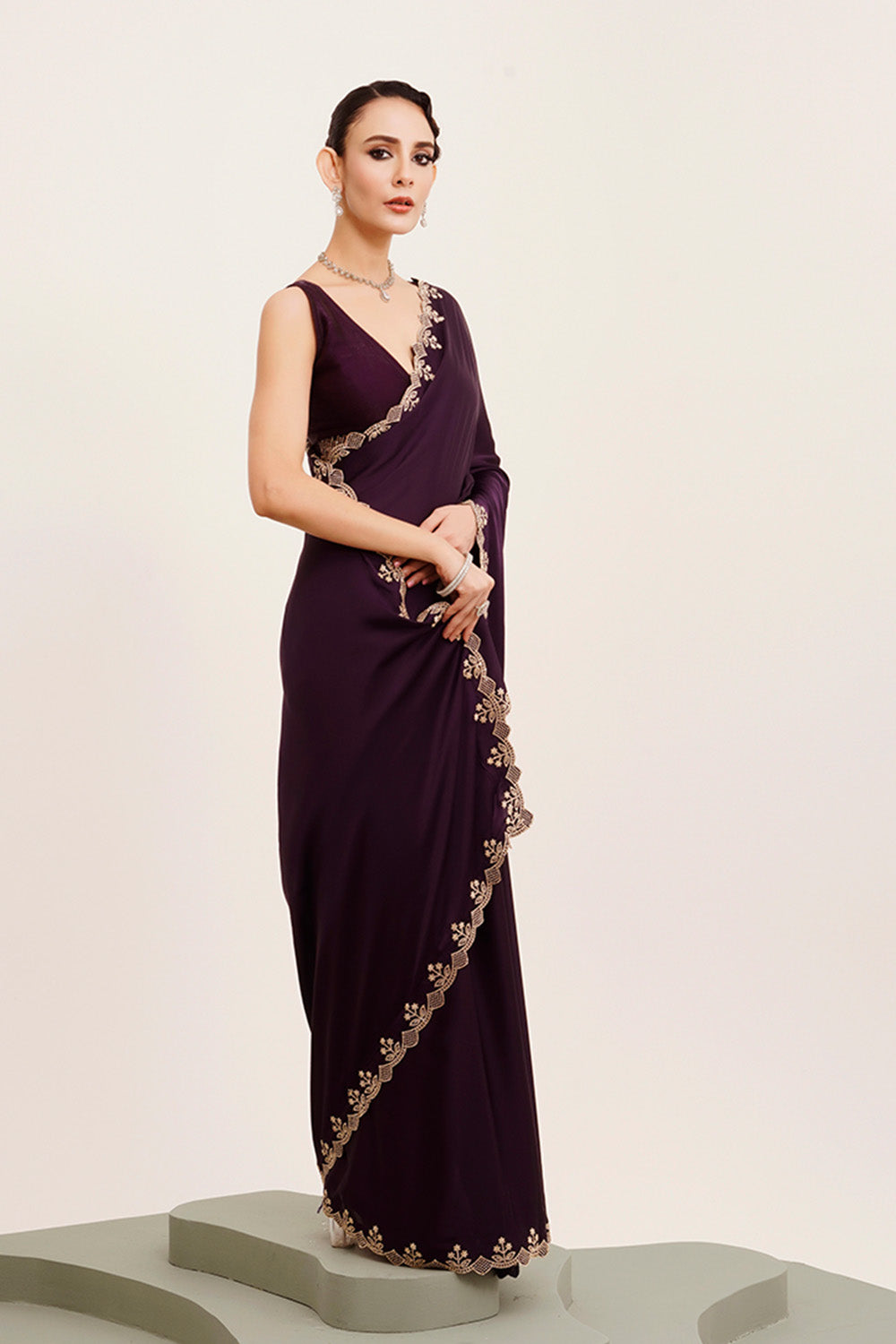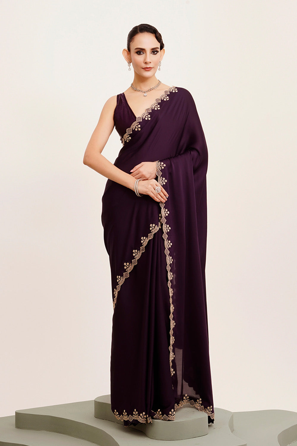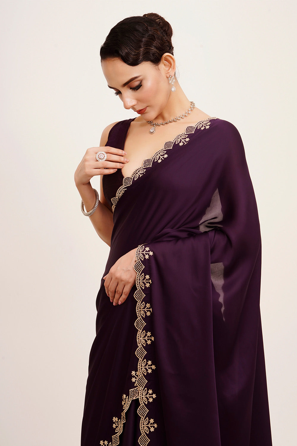Elevate your ethnic wardrobe with this Purple Satin Saree adorned with intricate beads and stones, delivering a refined sparkle. Crafted from smooth satin, it offers a luxurious drape and comfortable wear. The matching blouse complements the saree, creating a cohesive and elegant ensemble suitable for festive occasions and formal events.