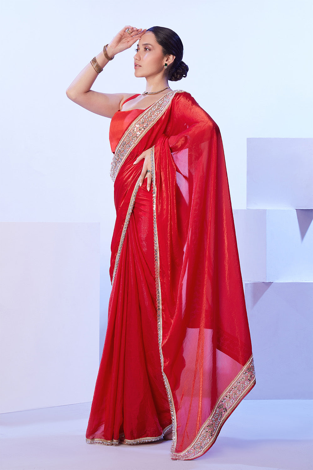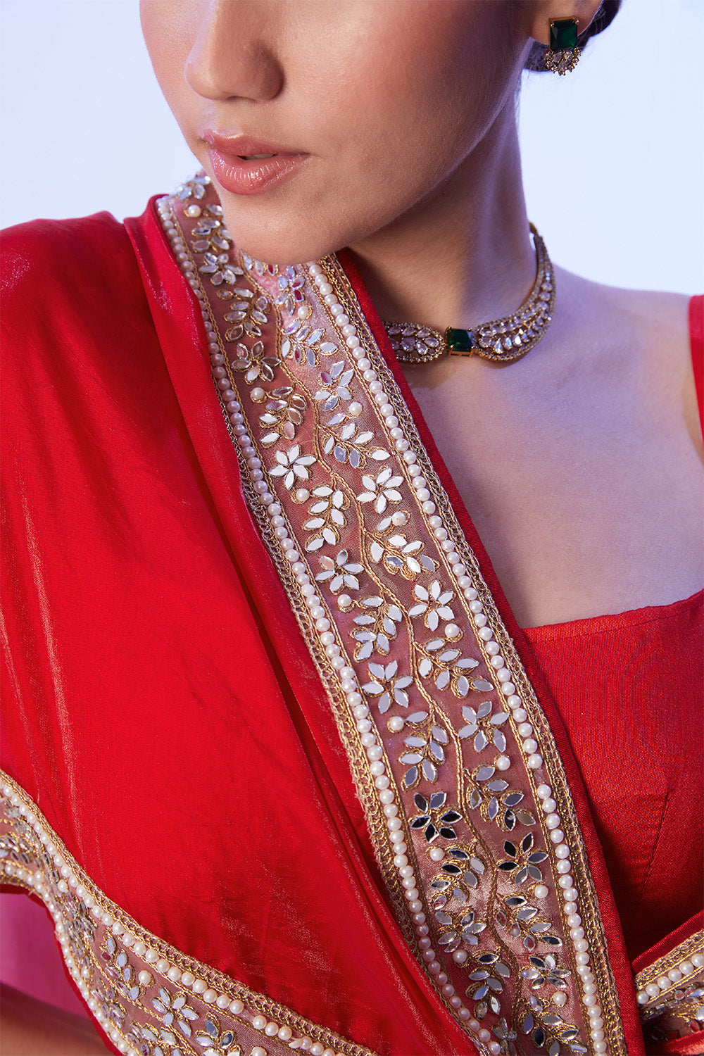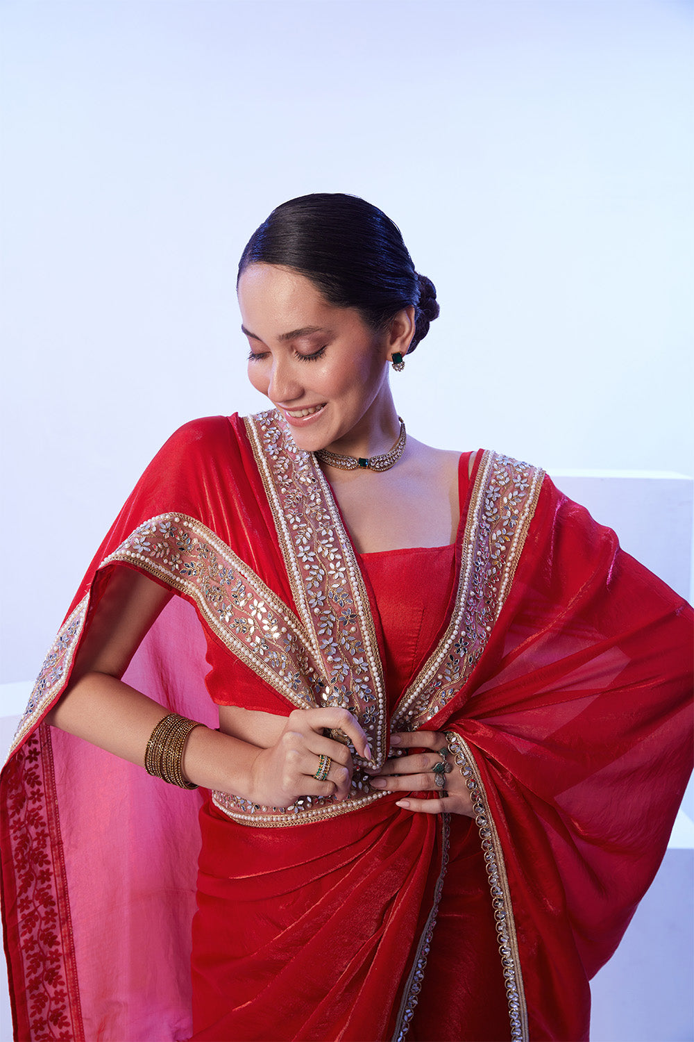 लाल खिलती साटन साड़ी लेस और ब्लाउज के साथ