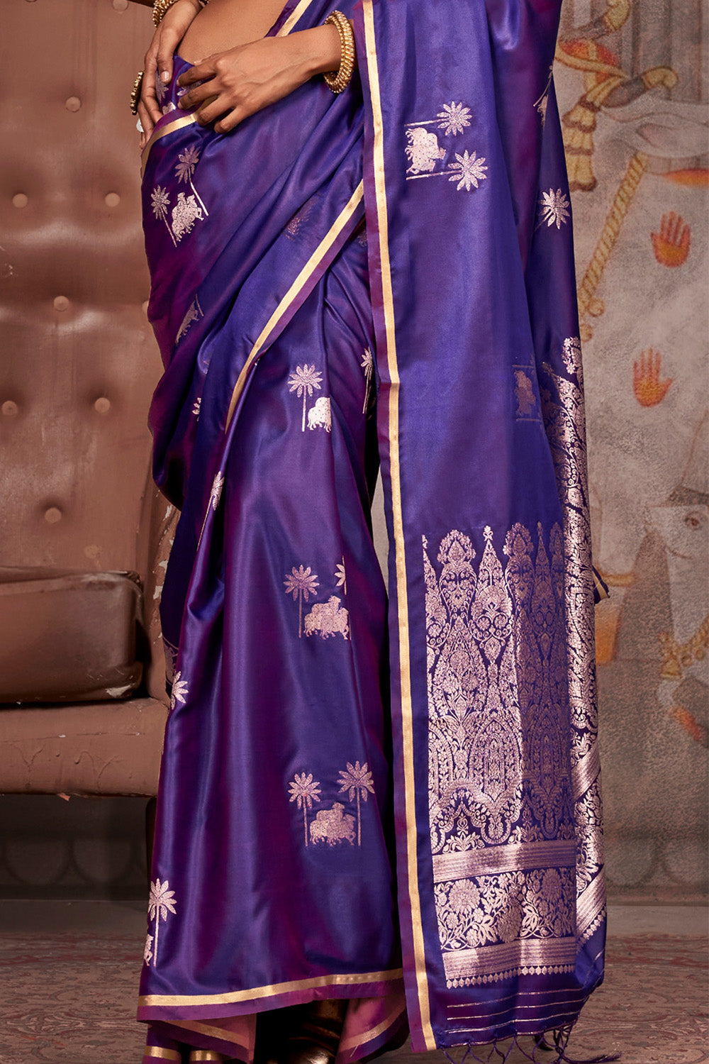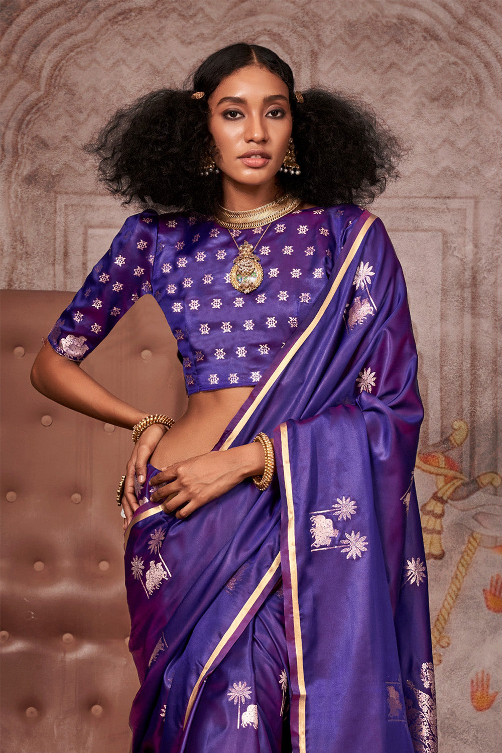 ब्रोकेड ब्लाउज के साथ रॉयल पर्पल साटन पिचवाई साड़ी