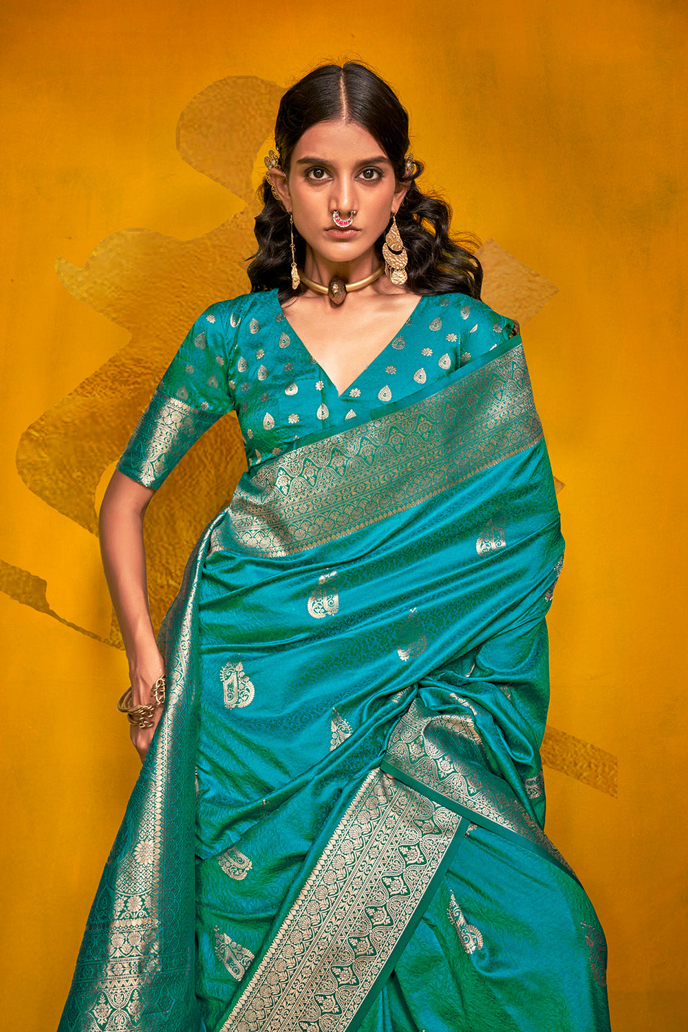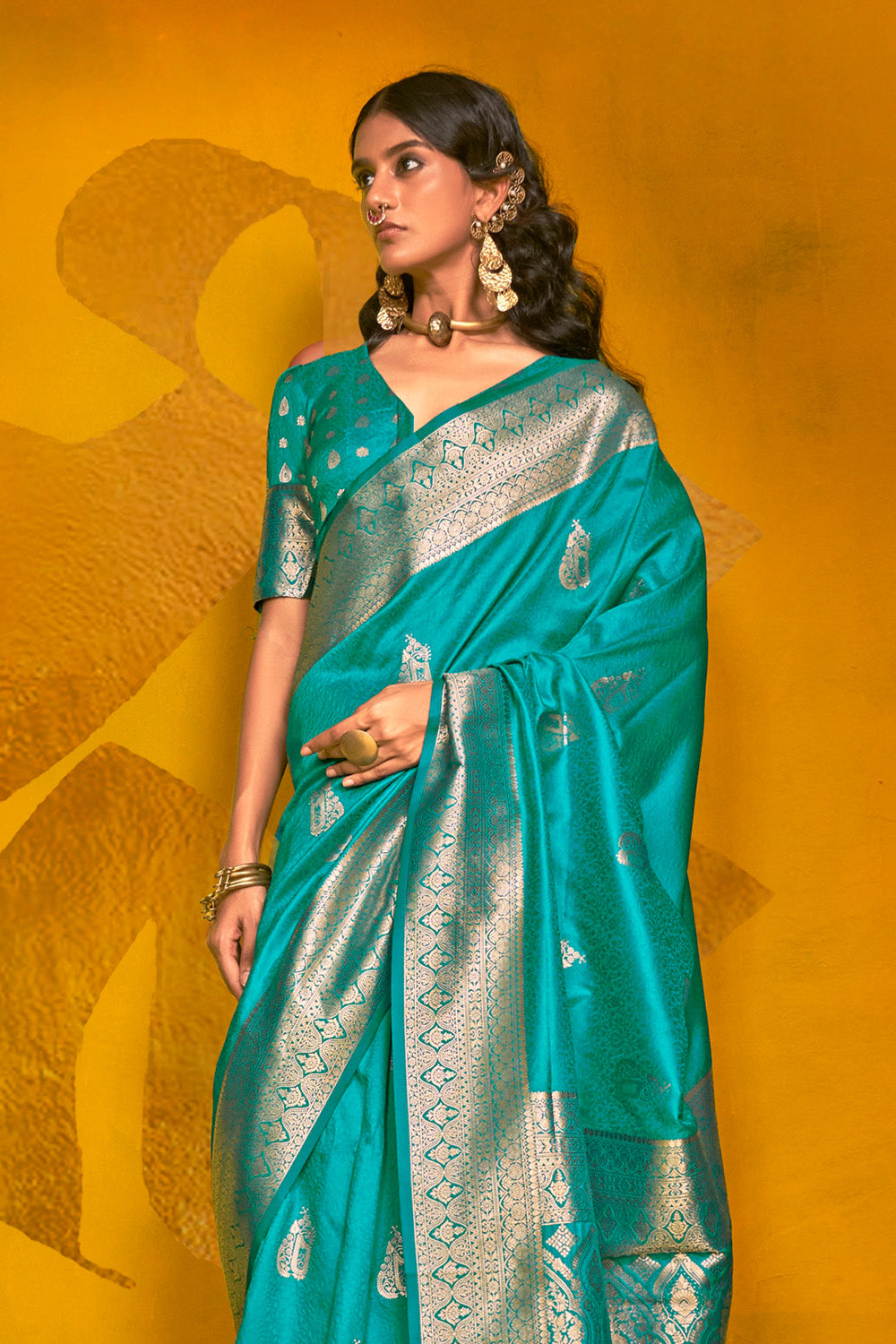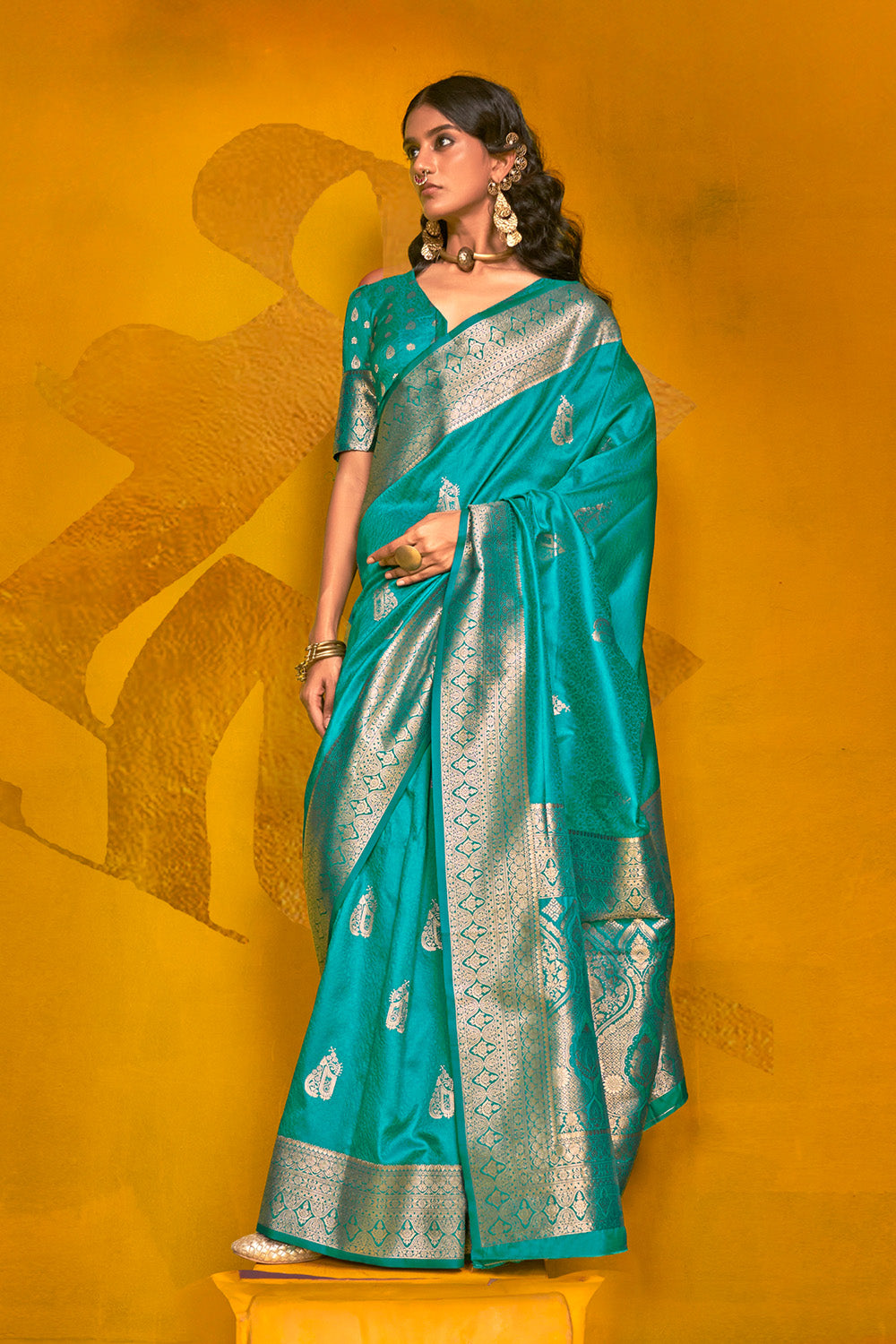 पल्लू और ब्लाउज के साथ समुद्री हरे रंग की बनारसी साड़ी