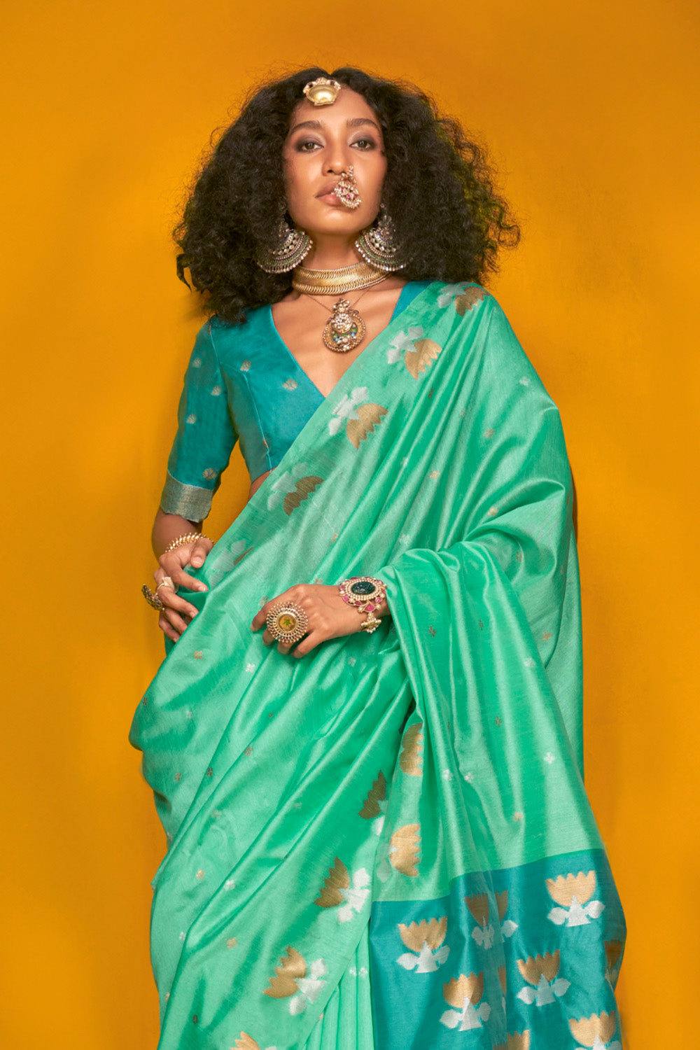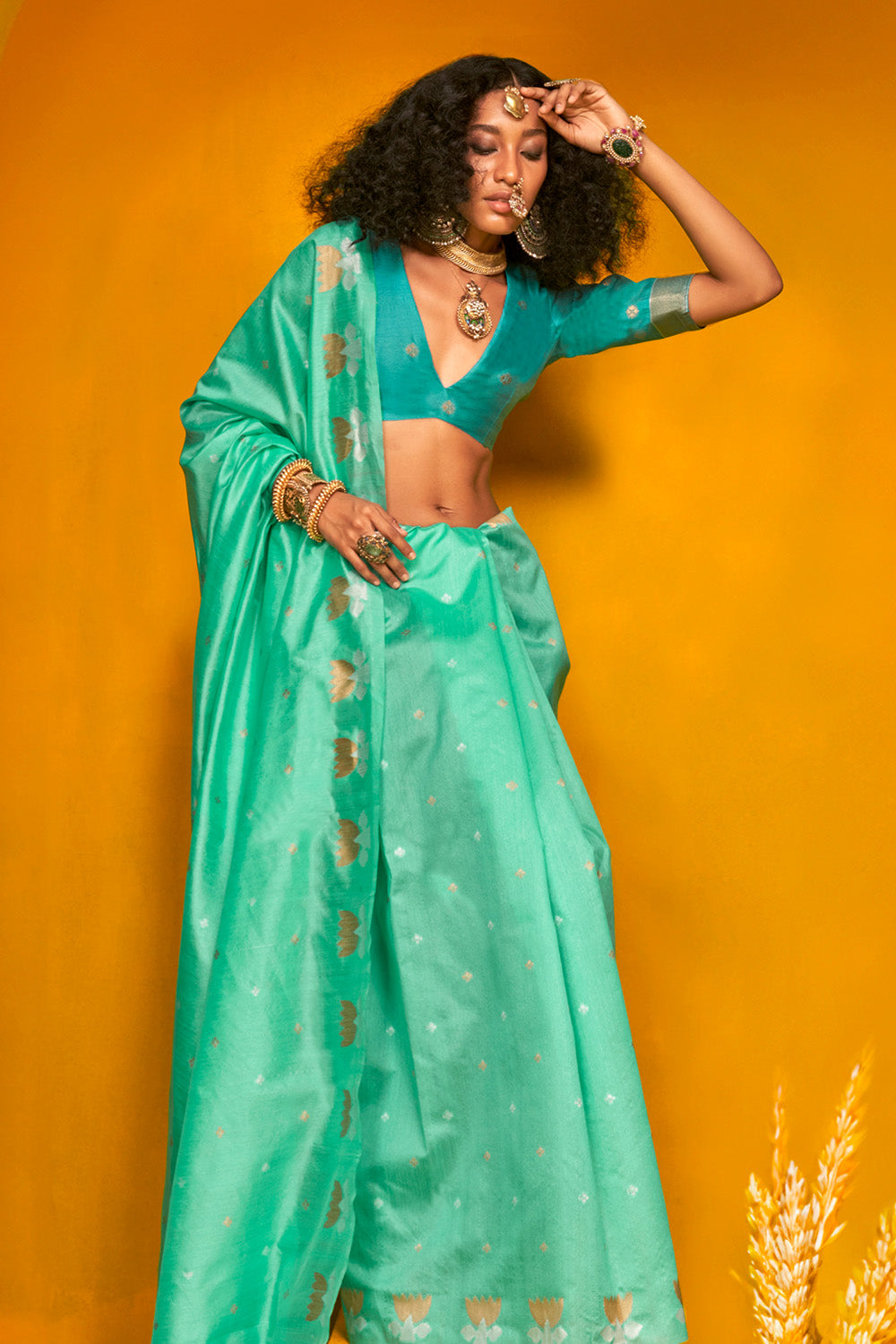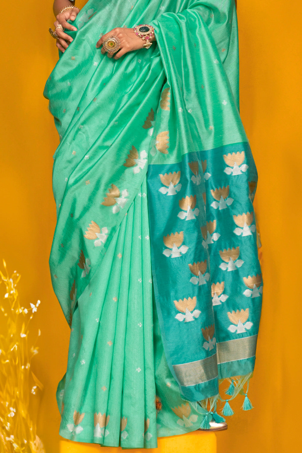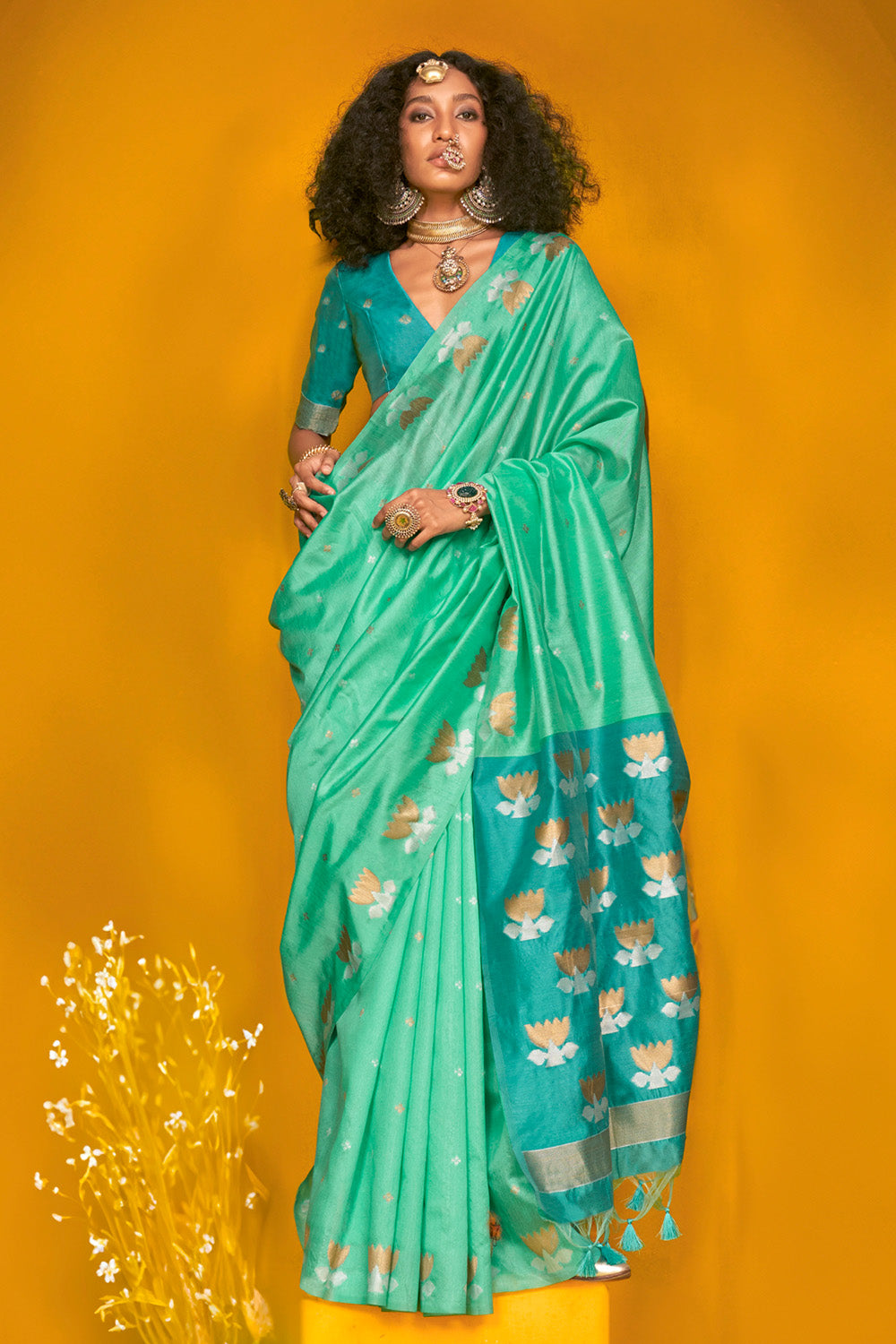 ब्लाउज के साथ समुद्री हरे रंग की साड़ी कमल डिजाइन कंट्रास्ट पल्लू