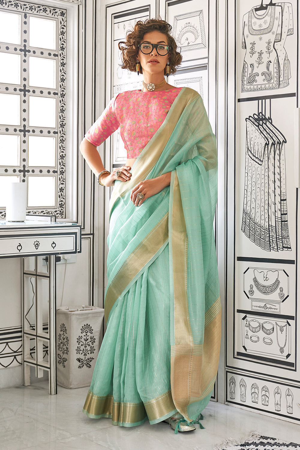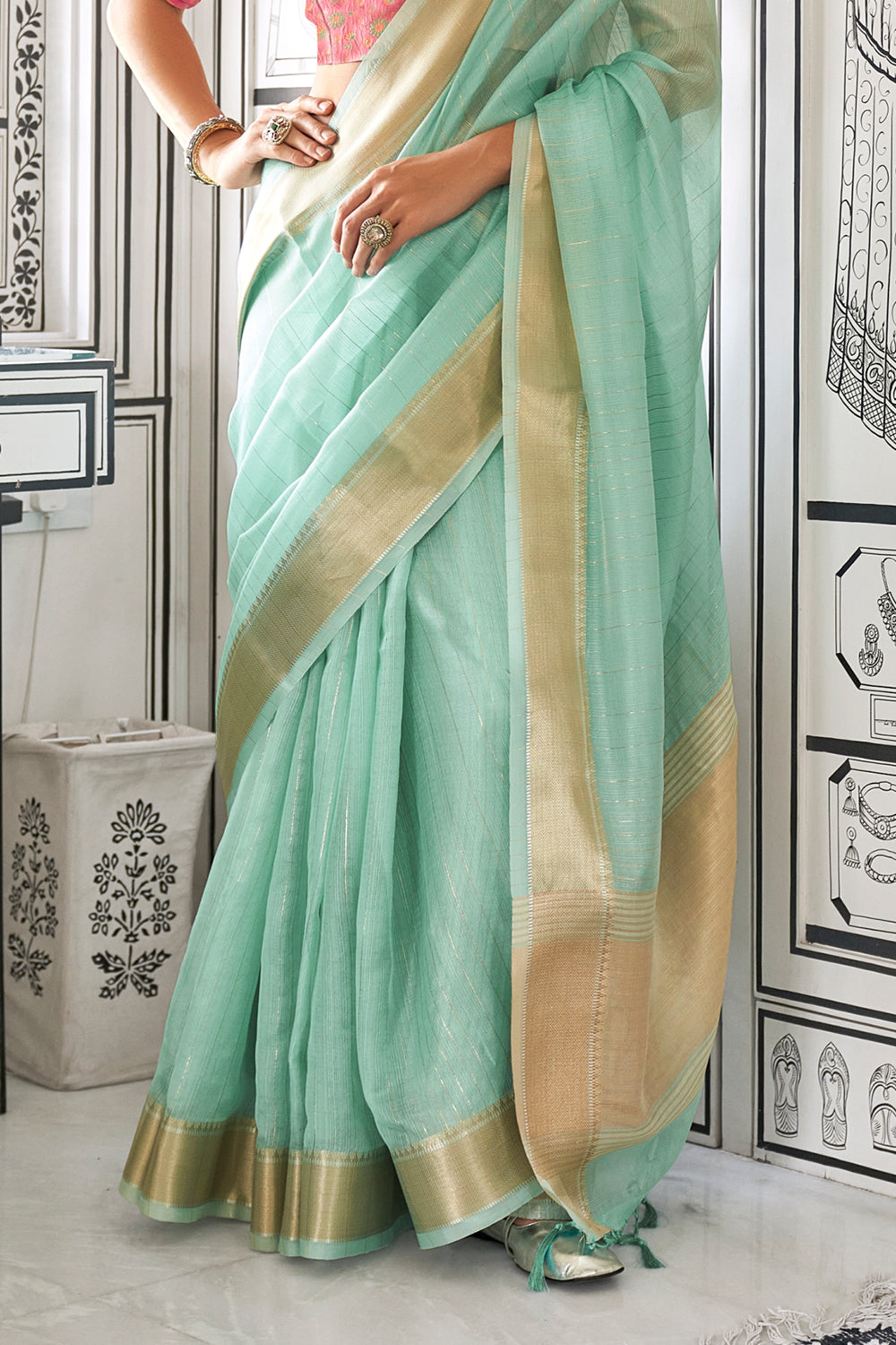 ब्लाउज के साथ समुद्री हरा सॉलिड मॉस शिफॉन जैक्वार्ड साड़ी