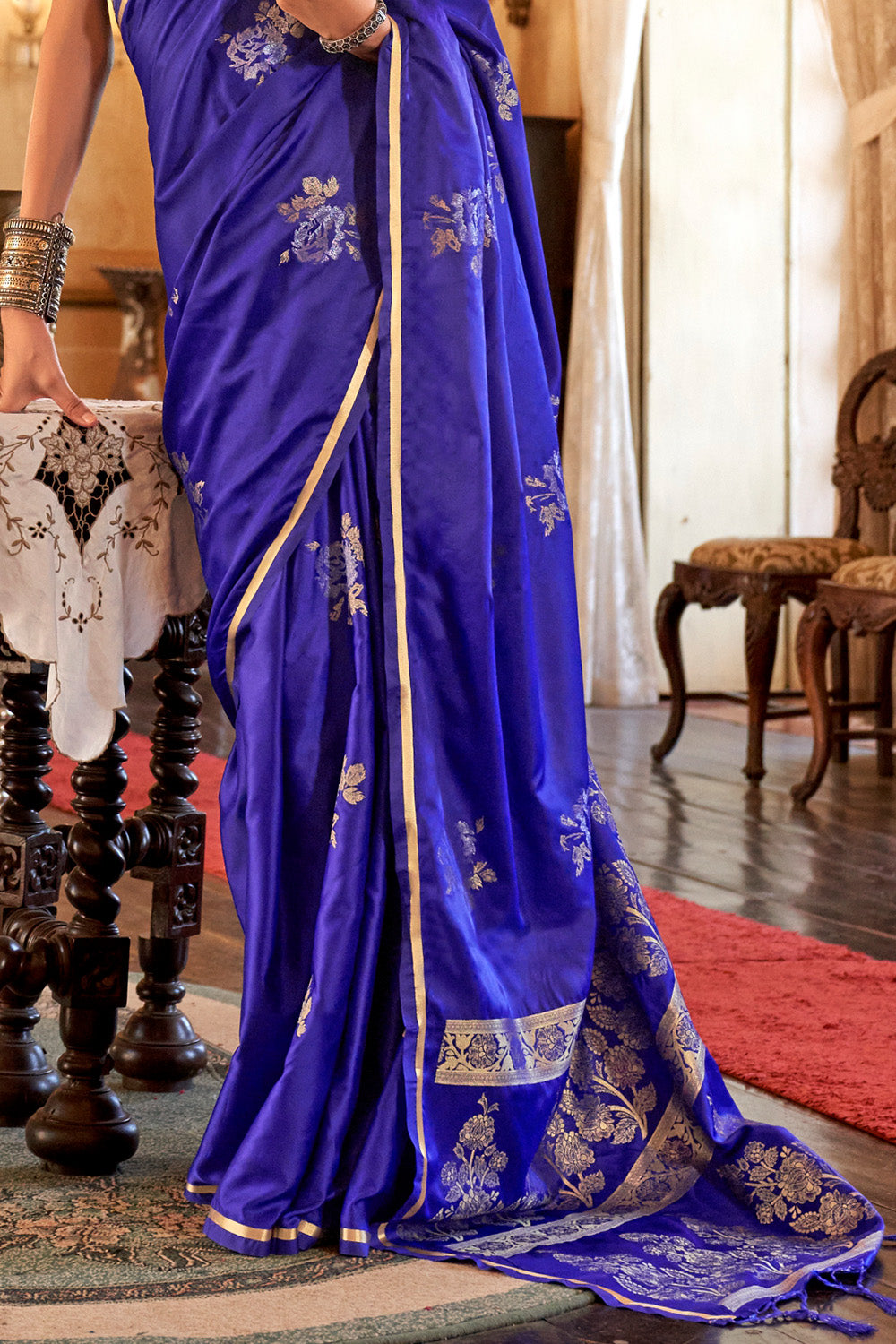 ब्रोकेड ब्लाउज के साथ वायलेट साटन बुनाई साड़ी