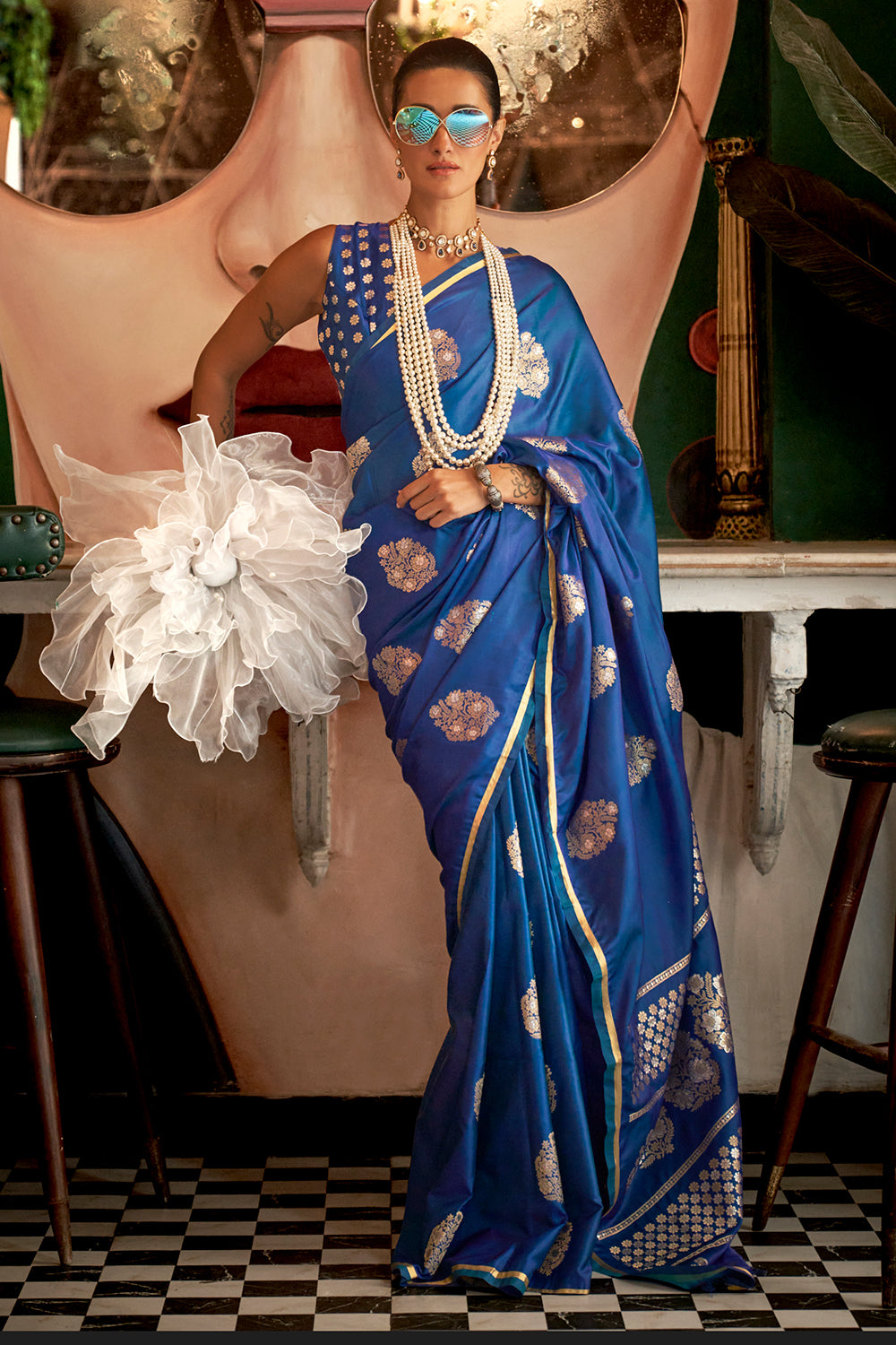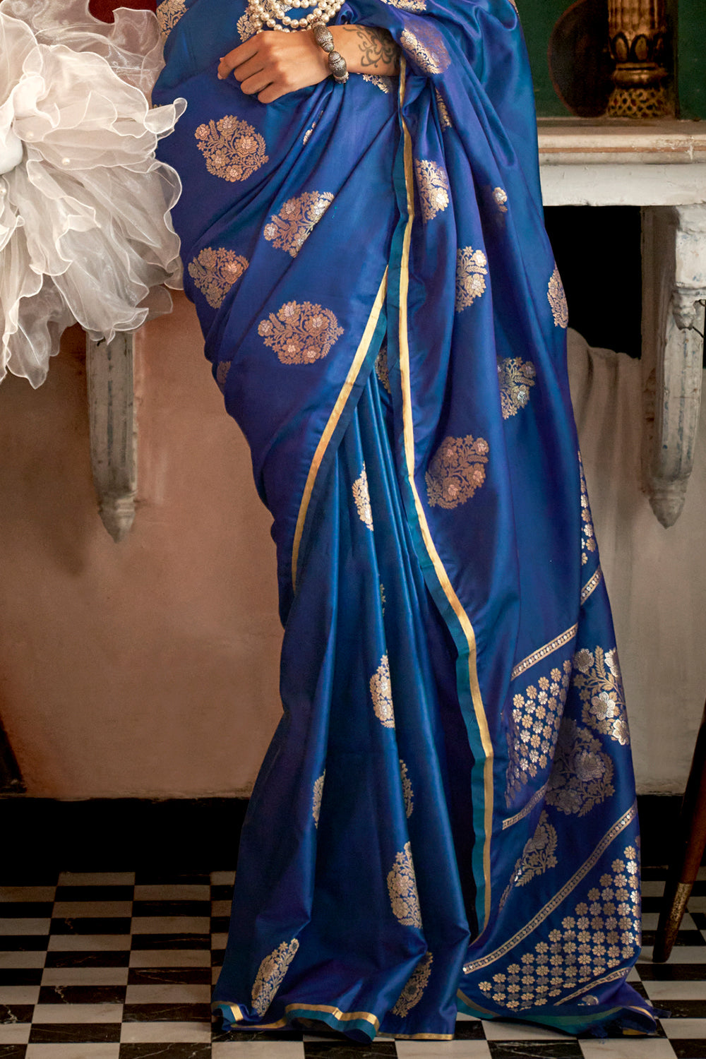 Bark Blue Satin Saree With Pallu And Brocade Blouse