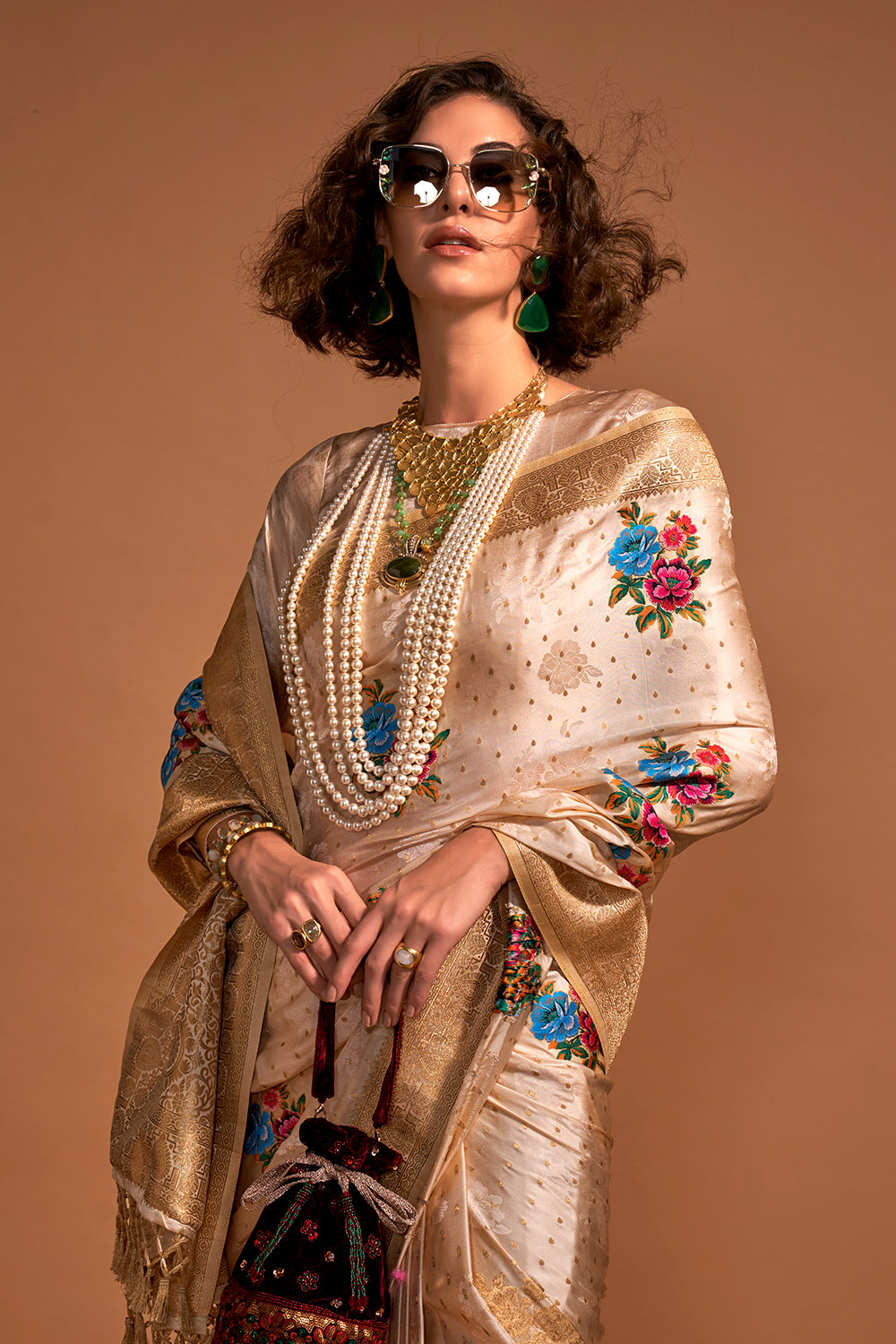 Introducing the beige satin multicolor flower print saree with blouse - a beautiful and elegant addition to any wardrobe. Made with high quality satin and featuring a stunning floral print, this saree is perfect for any occasion. The matching blouse completes the look, making it a versatile and stylish choice.