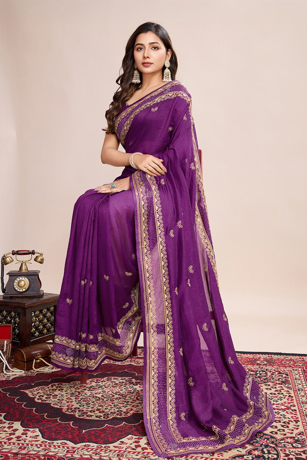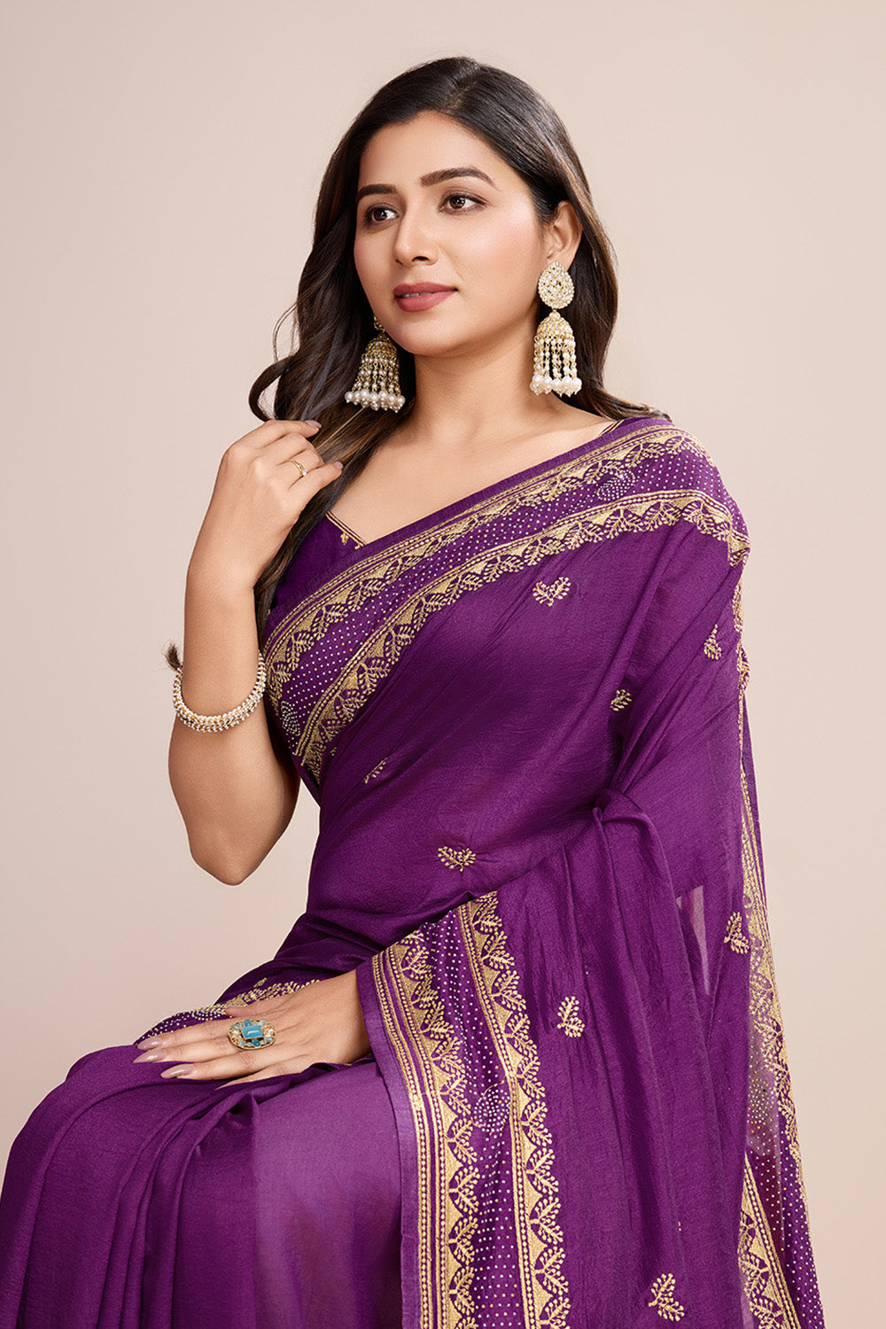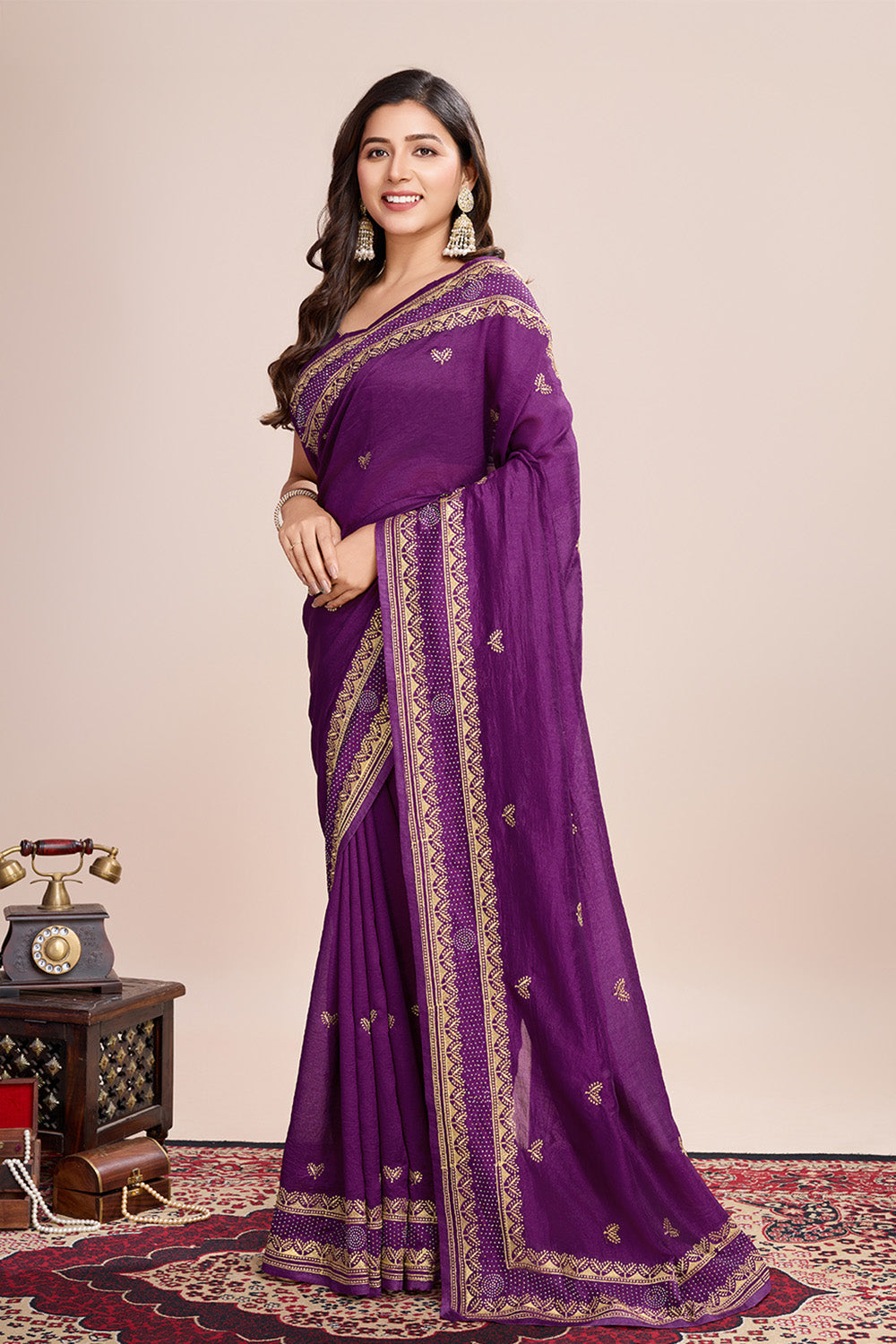 This Bengani color saree showcases intricate floral embroidery. The delicate detailing adds a touch of elegance, making it perfect for special occasions. Elevate your ethnic wardrobe with this must-have piece, designed to impress with its understated yet luxurious charm.