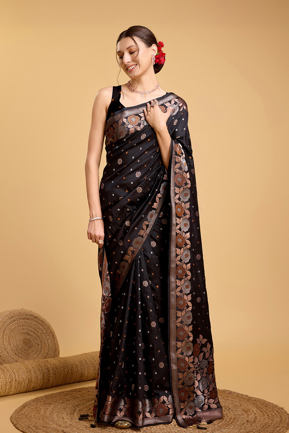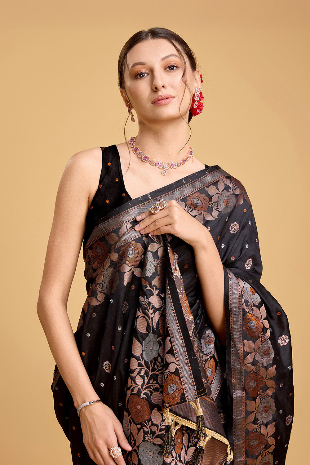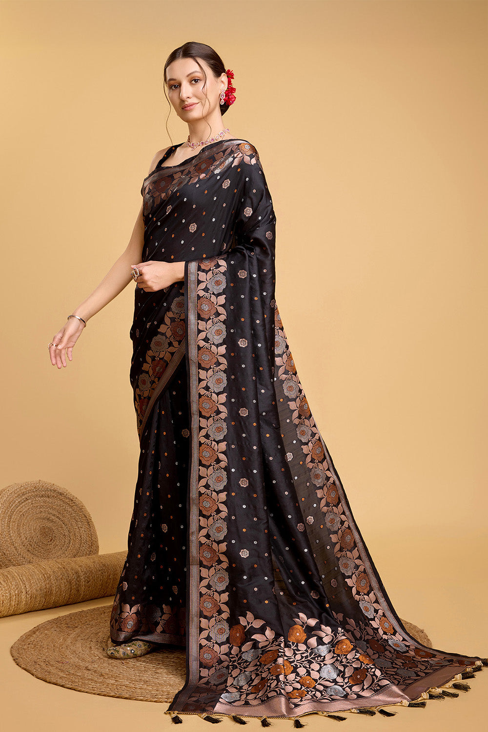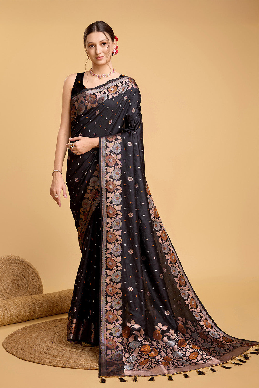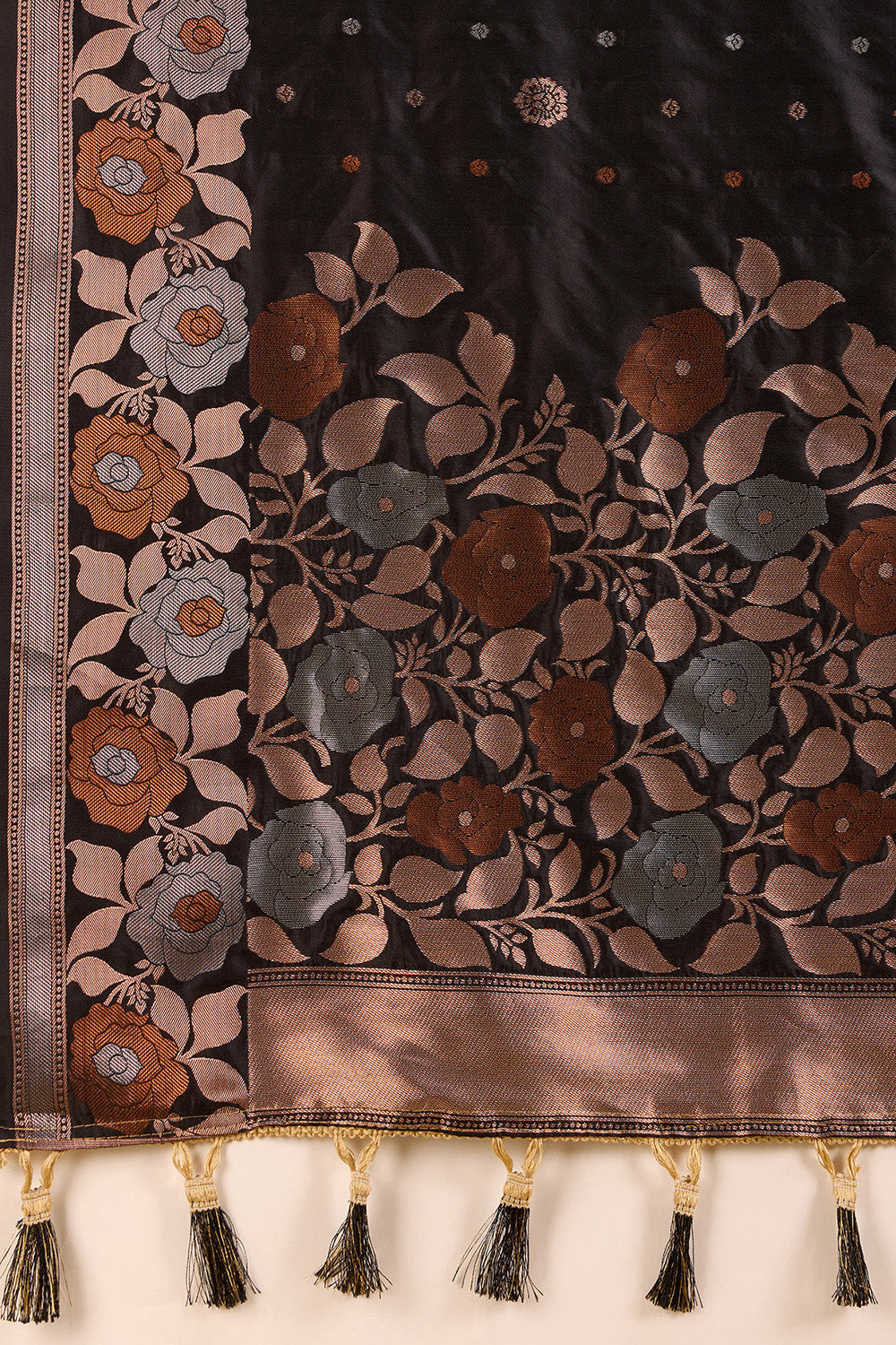 Discover the elegance of the Black Floral Motif Saree. Its delicate tassel and intricate floral design exude a timeless and sophisticated charm. Enjoy the versatility of this saree, perfect for any occasion. Complete the look with the included blouse. Elevate your style game with this beautiful piece.