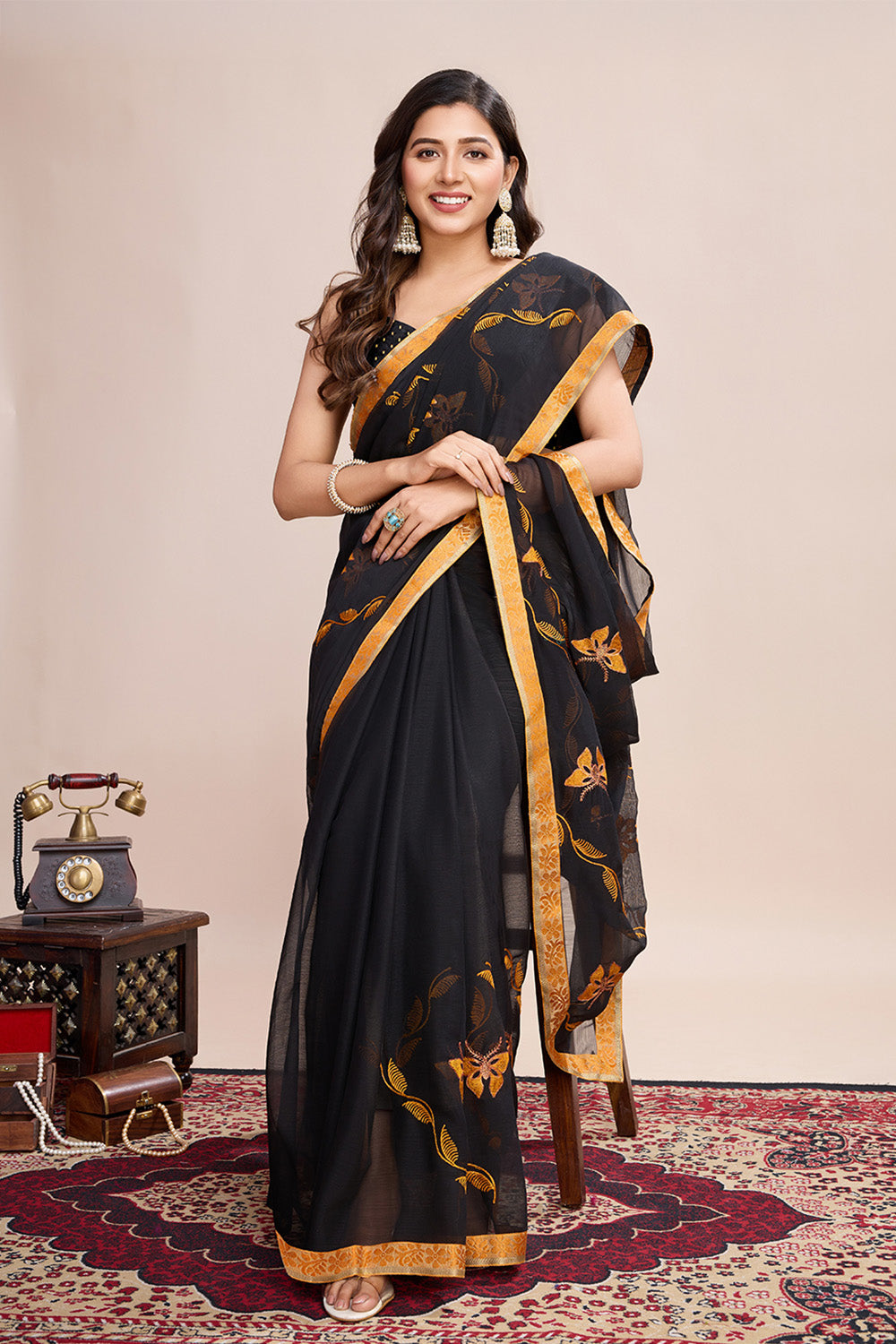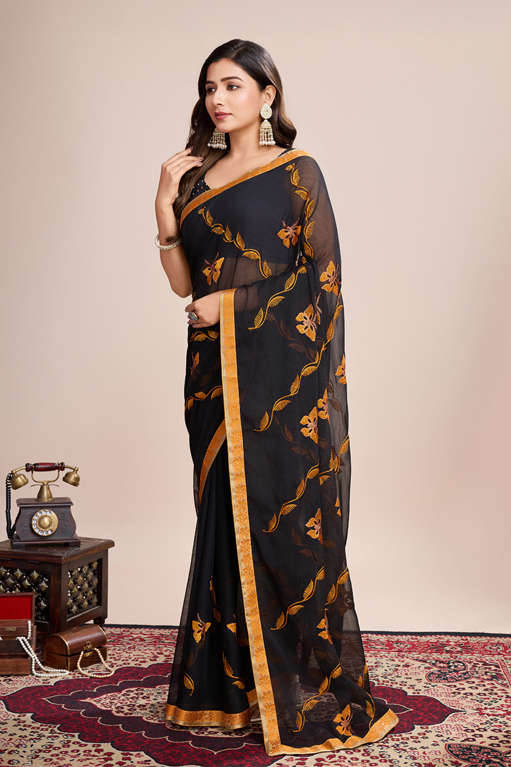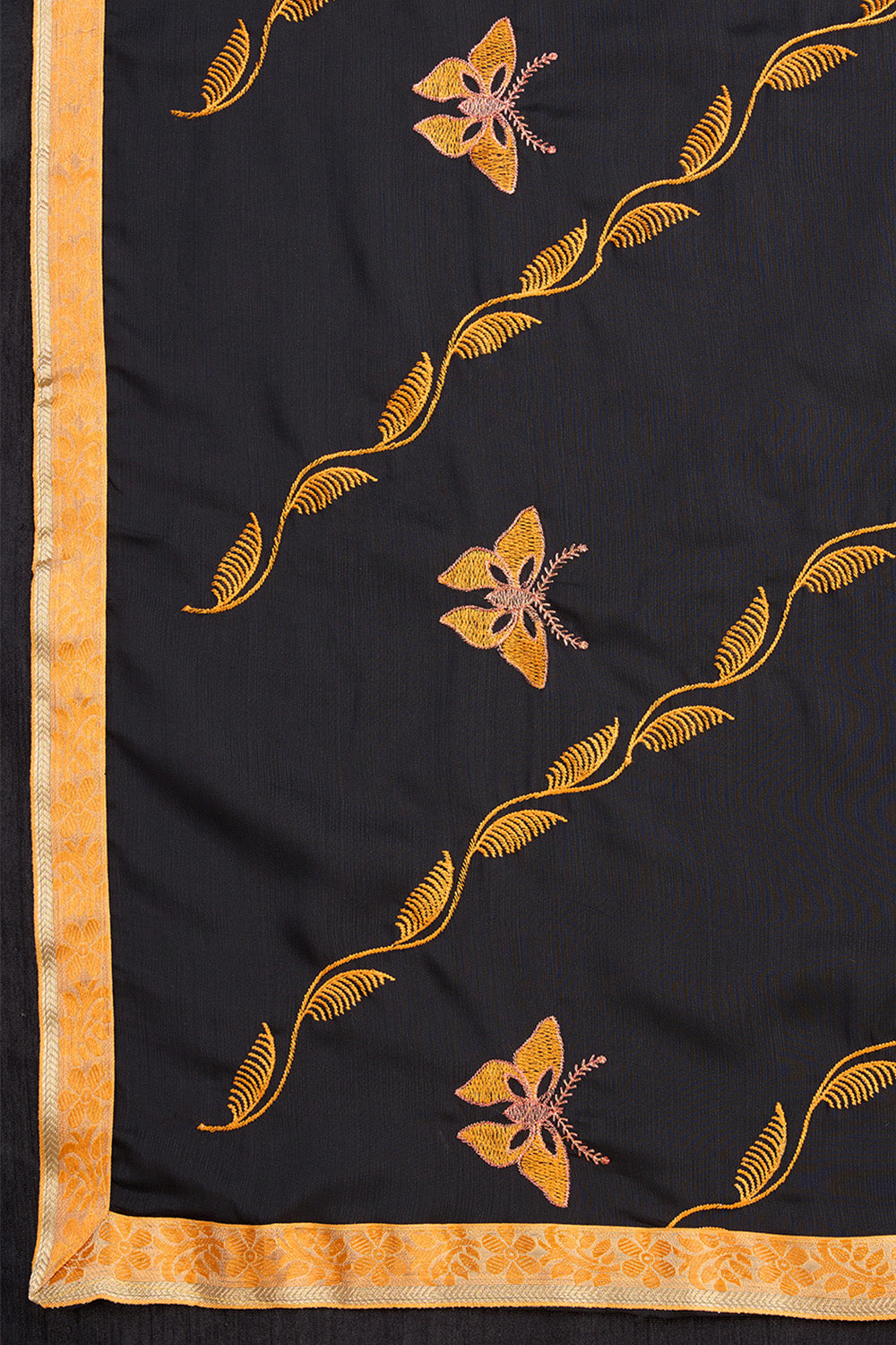 This stunning black georgette Saree features soft pastel yellow embroidery, adding a touch of elegance to this traditional garment. Made with high-quality georgette fabric, this saree offers comfort and durability. Perfect for any formal occasion, it is sure to make you stand out in the crowd.