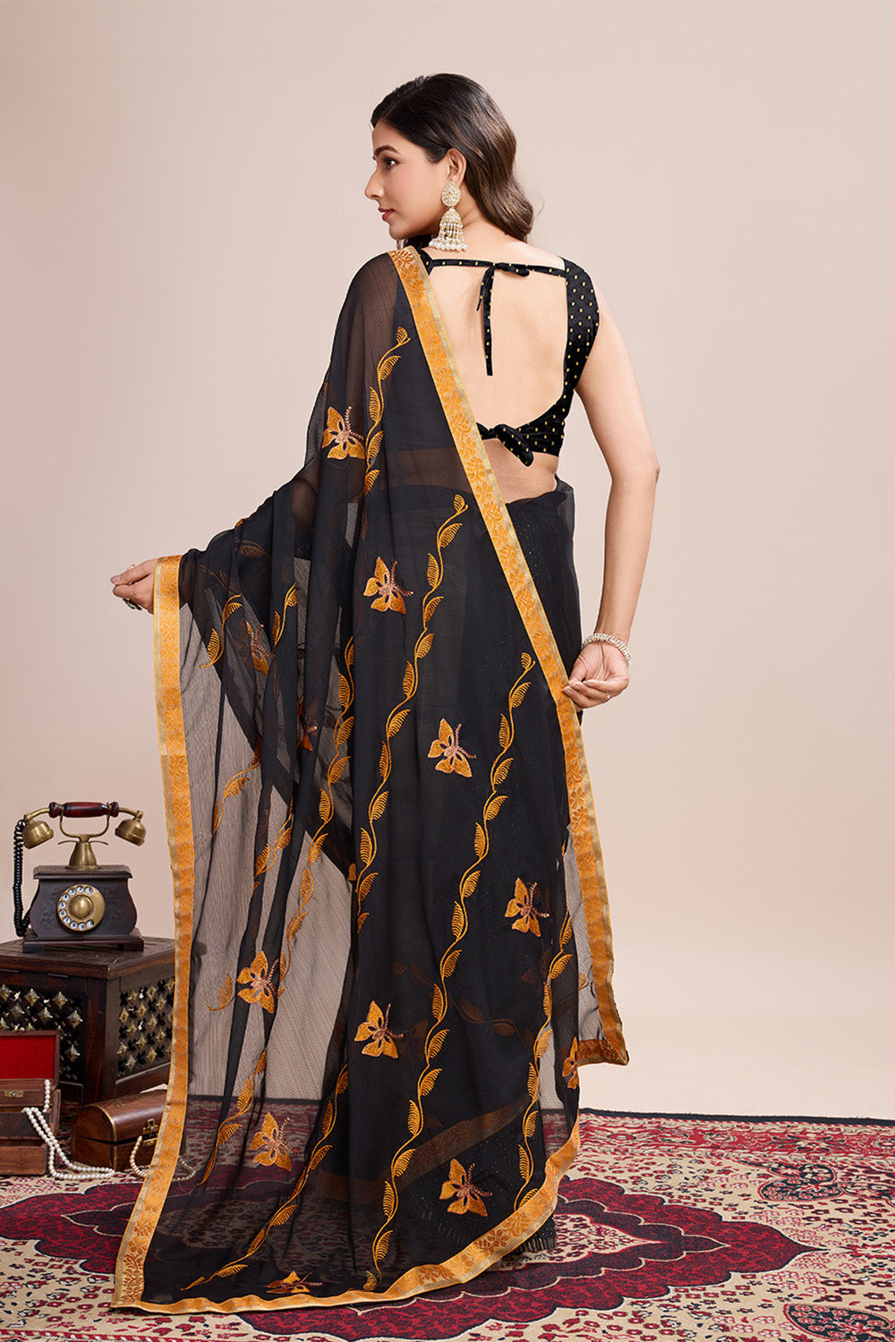 Black Georgette Saree Soft Pastel Yellow Embroidery