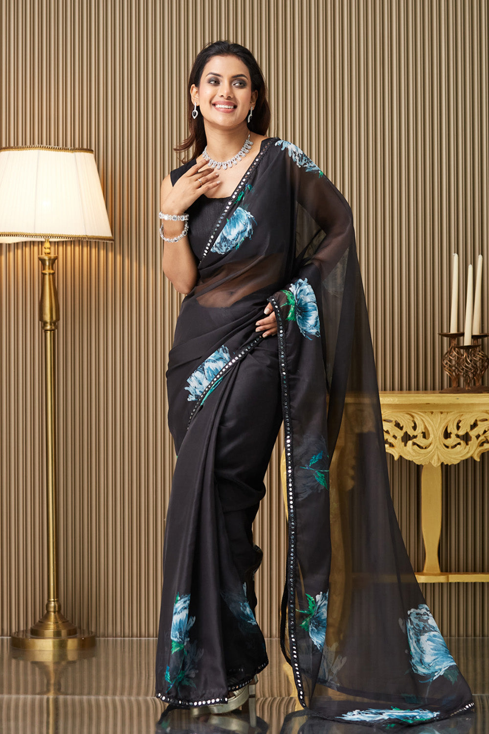 Elevate your wardrobe with this Black Printed Organza Saree, paired with a matching blouse. Crafted from lightweight organza fabric, it offers a delicate sheen and graceful drape, perfect for formal occasions. The intricate black print adds a sophisticated touch, while the included blouse ensures a coordinated, polished look. Ideal for those seeking elegance combined with comfort.
