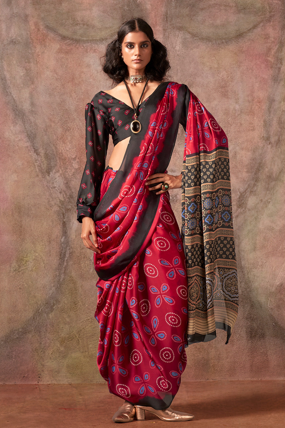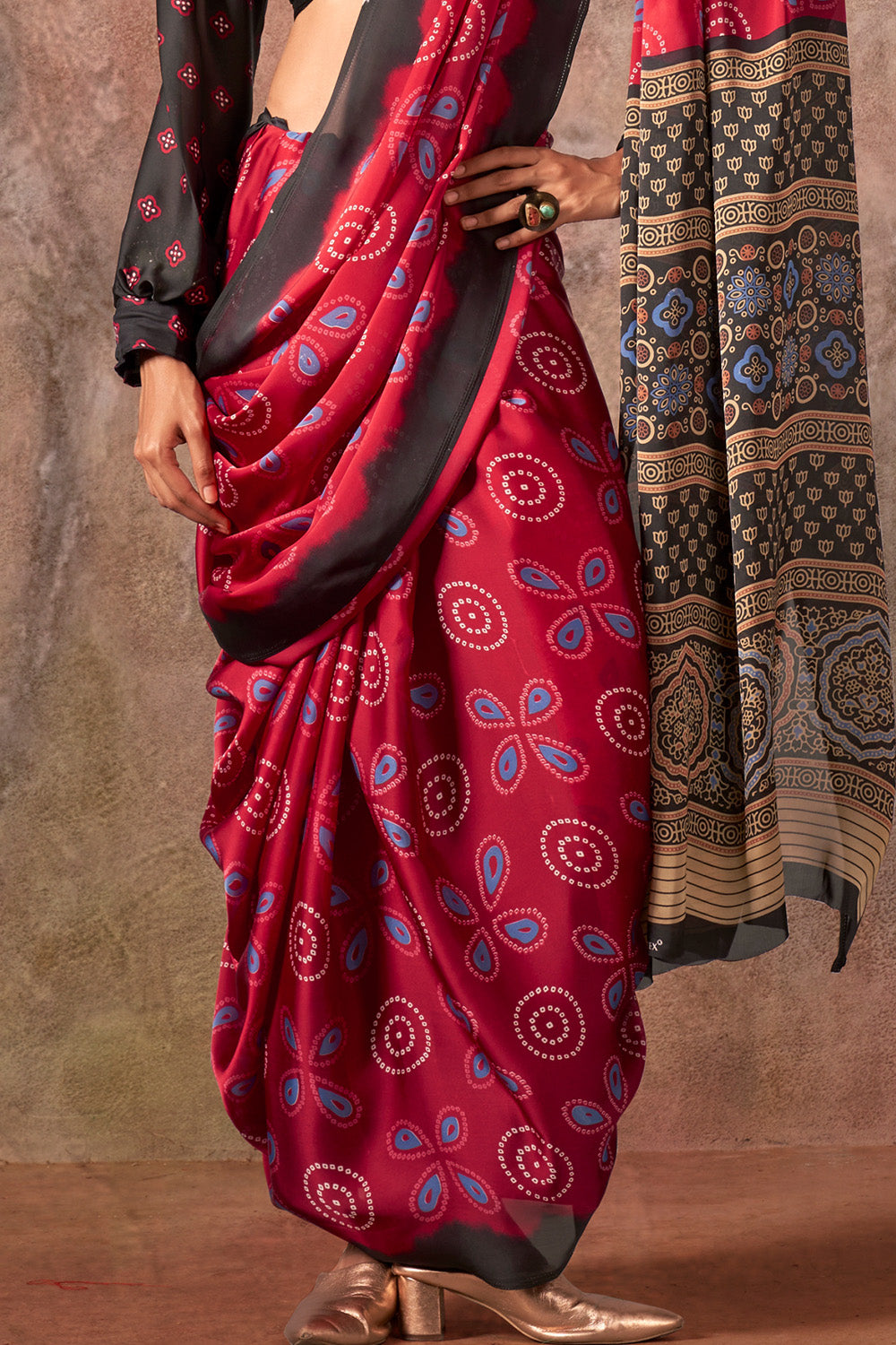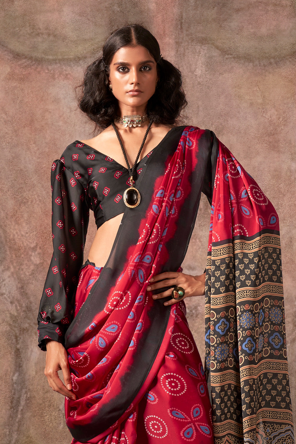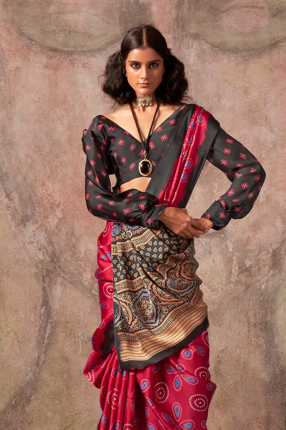 Black Red Ajrakh Print Satin Georgette Saree With Blouse