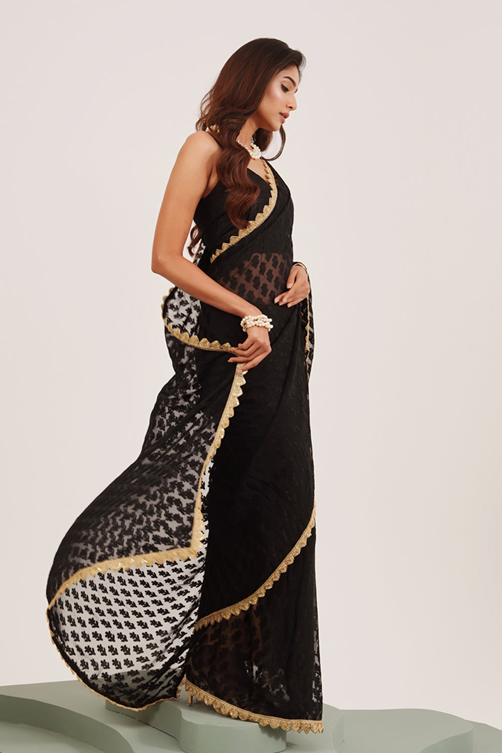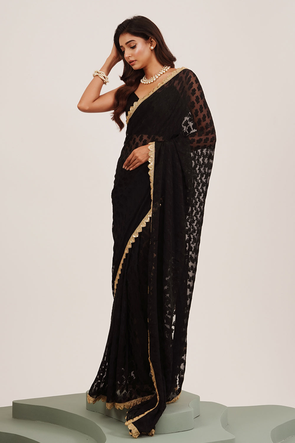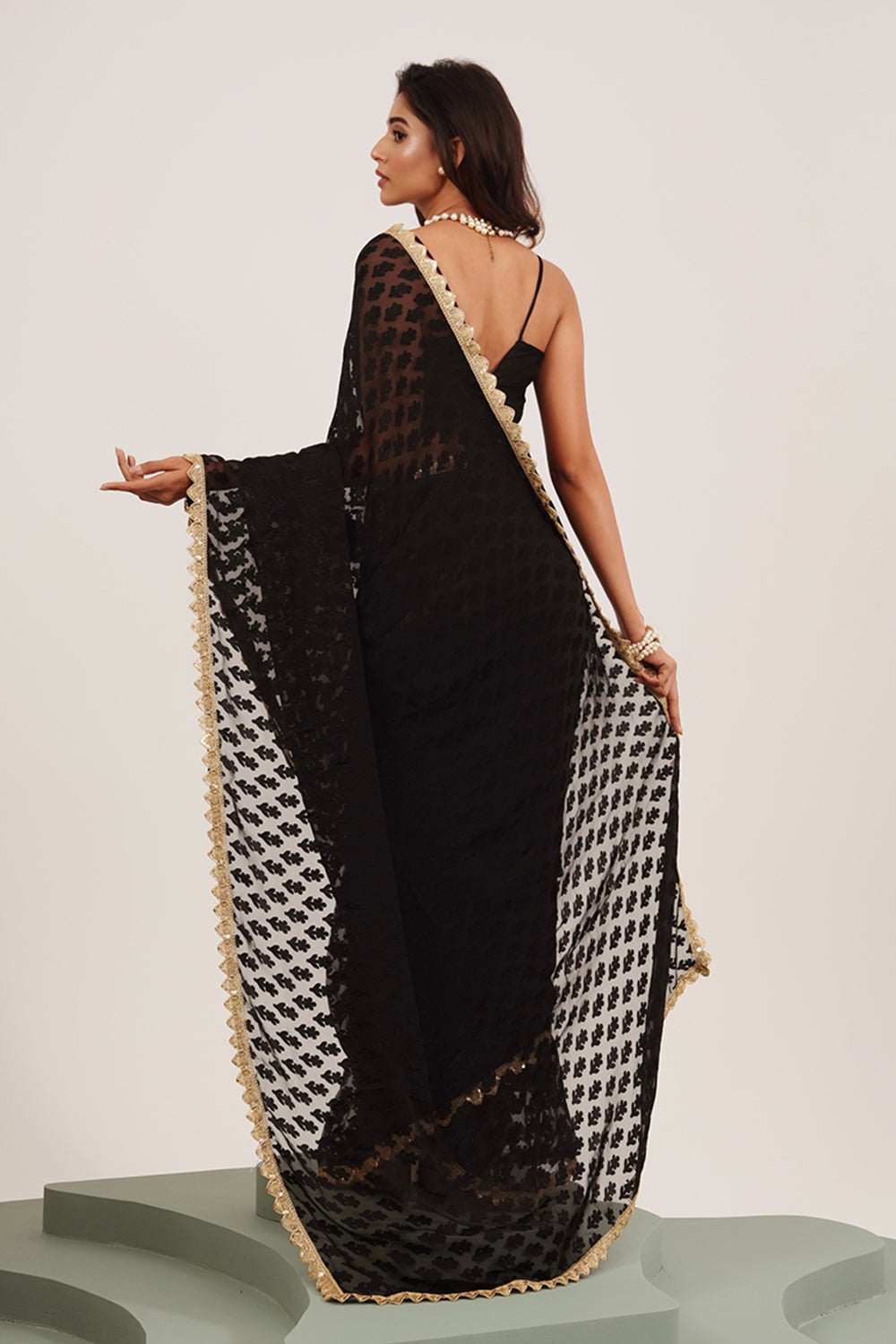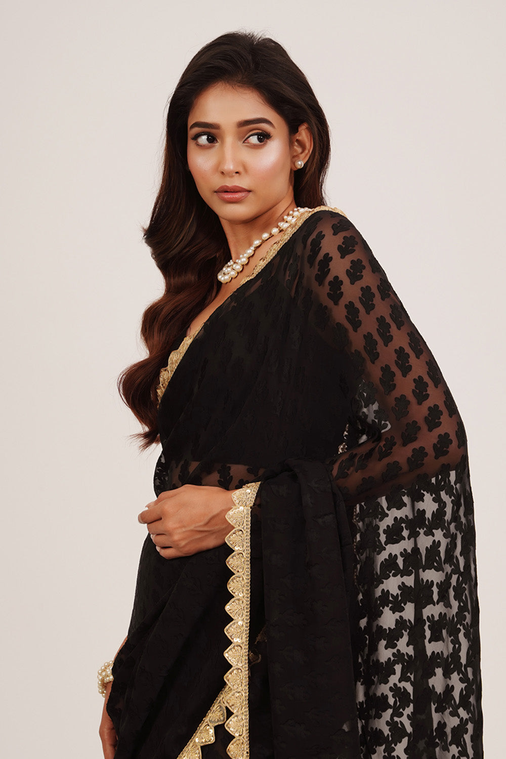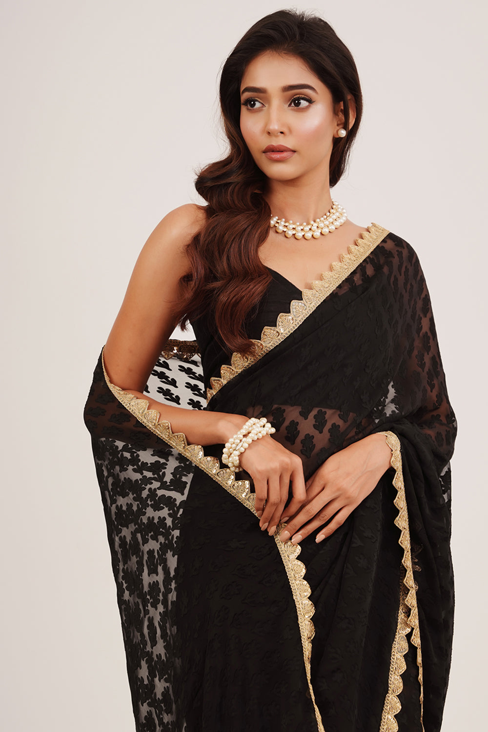 Elevate your ethnic wardrobe with this Black Sequinned Brasso Saree, paired with a matching blouse. Crafted from lightweight brasso fabric, it features intricate sequinned detailing that adds a subtle shimmer, perfect for evening occasions. The saree drapes gracefully, offering both comfort and elegance, while the blouse complements the look with a tailored fit. Ideal for festive events or formal gatherings, this ensemble combines traditional charm with contemporary style.