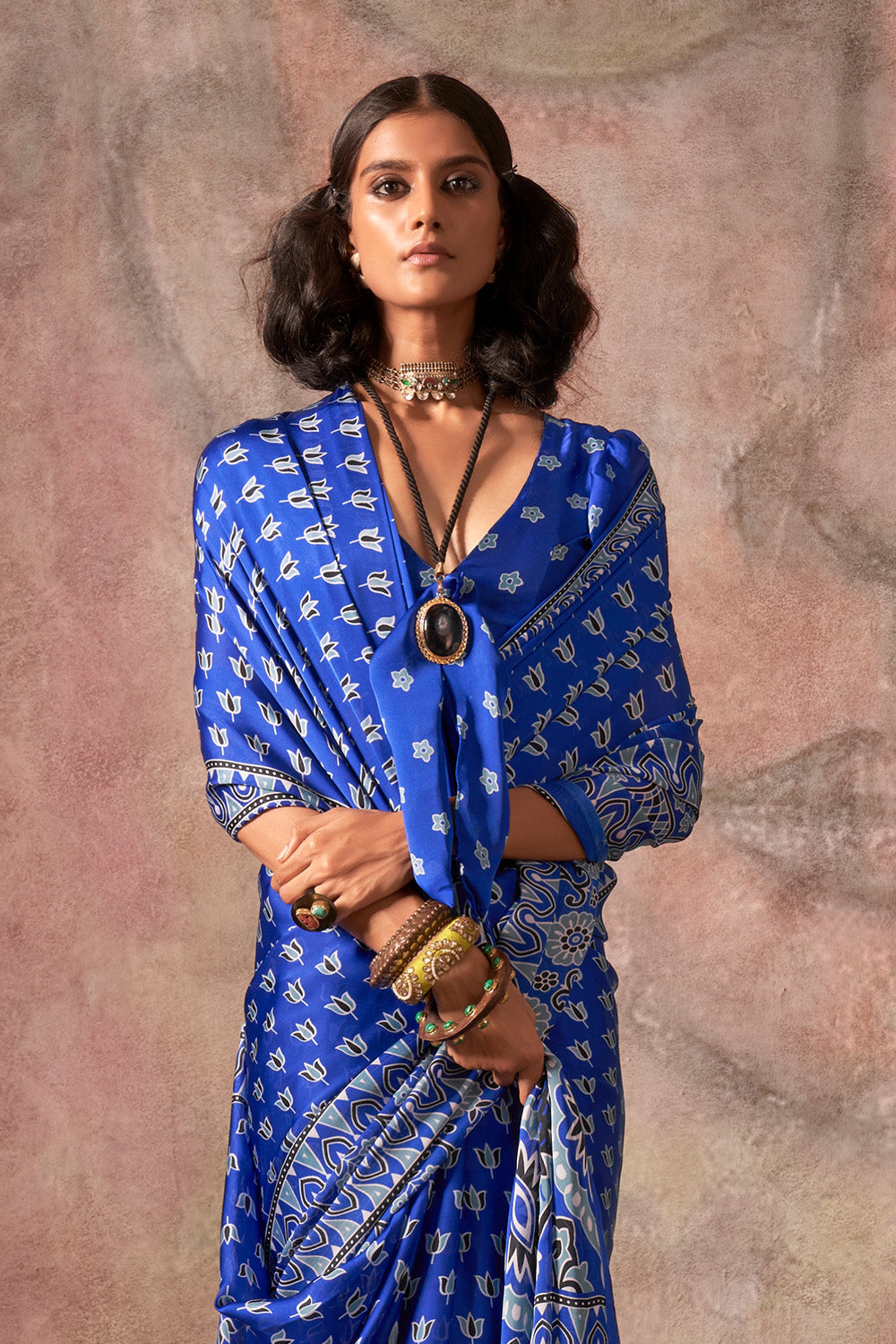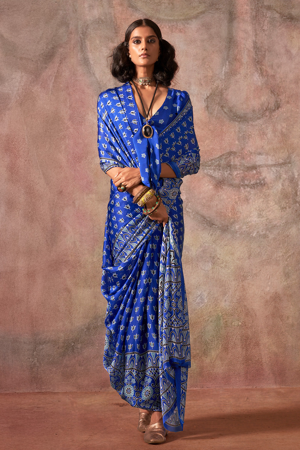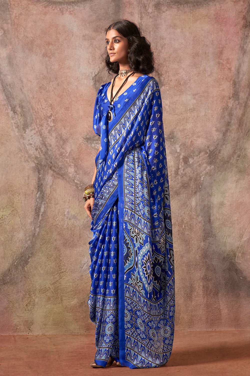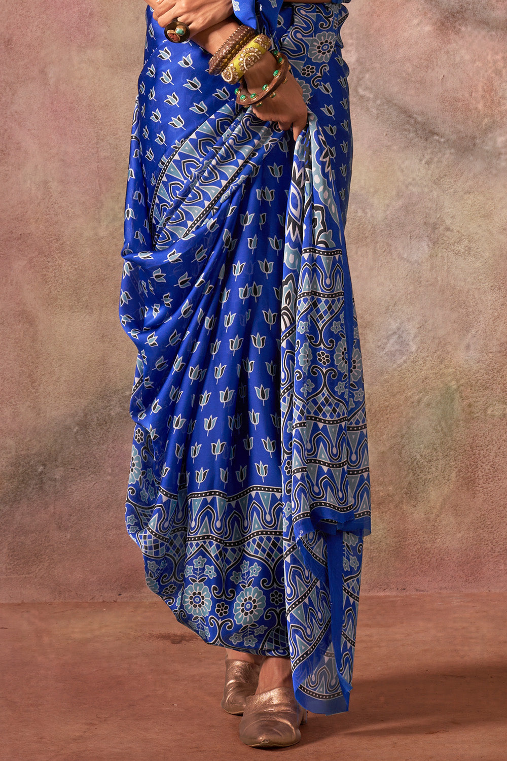 Blue Ajrakh Print Satin Georgette Saree With Blouse