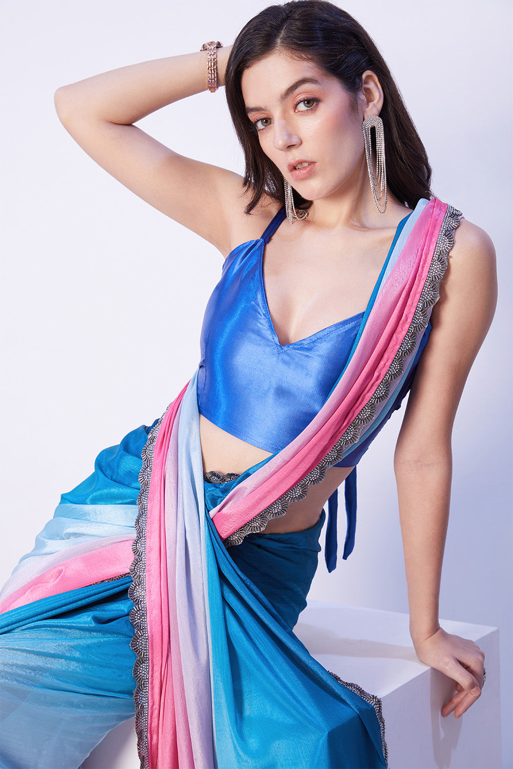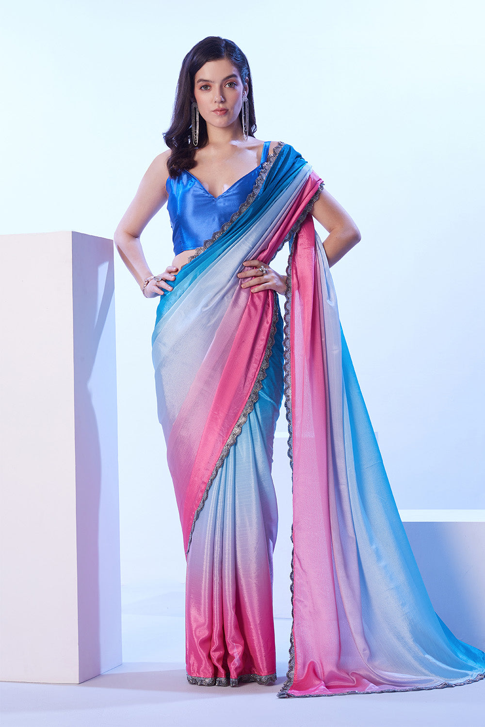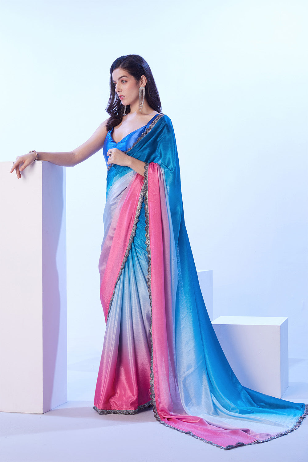 This blue chinon saree features a designer lace and comes with an unstitched blouse. Crafted with high-quality material and elegant design, this saree provides a flattering and comfortable fit for any occasion. Elevate your wardrobe with this versatile and sophisticated piece.