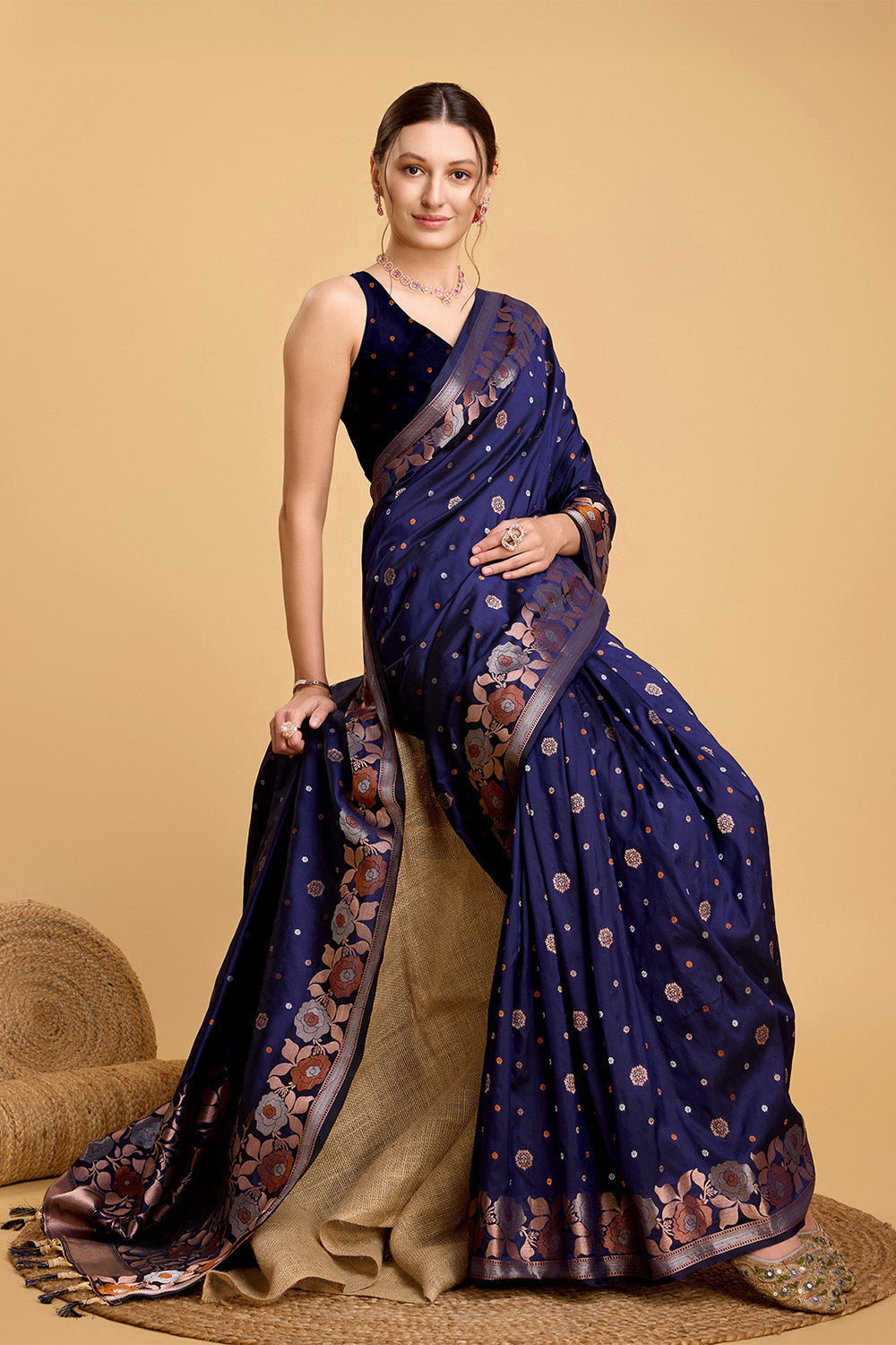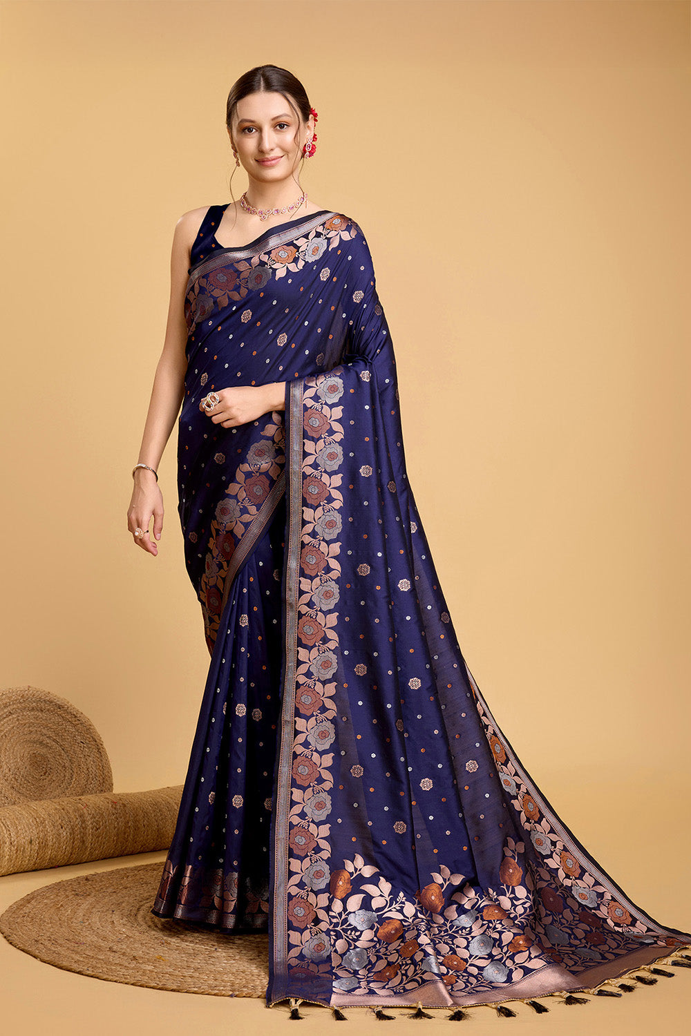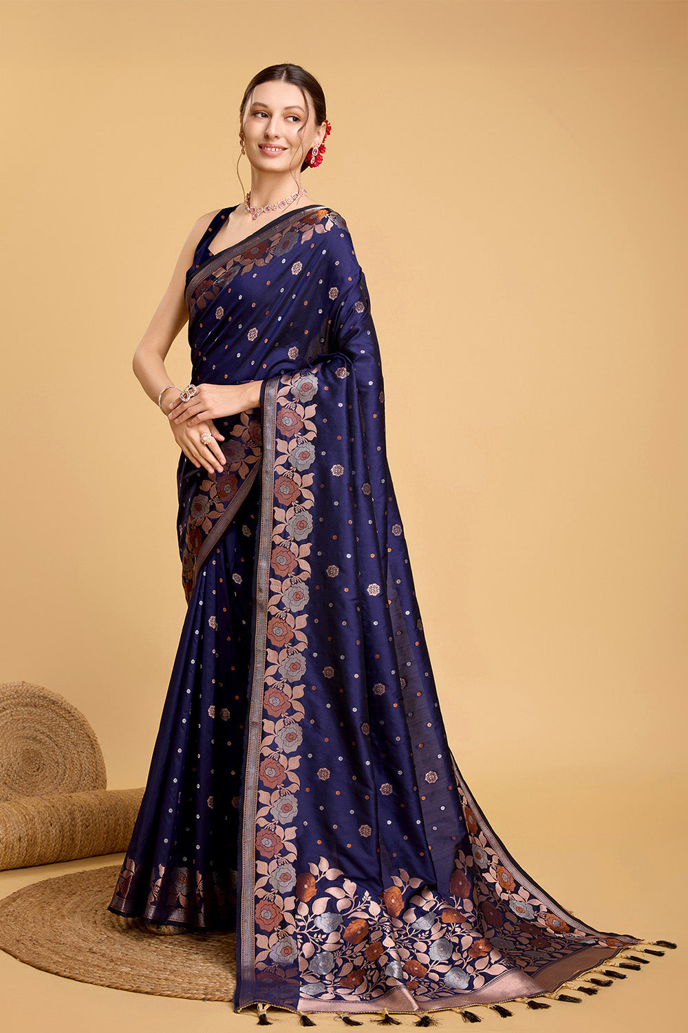 This elegant Blue Floral Motif Saree is adorned with a delicate tassel and comes with a beautiful blouse. The intricate floral design adds a touch of sophistication, perfect for any special occasion. Made from high-quality fabric, it offers comfort and style. Elevate your wardrobe with this must-have piece.