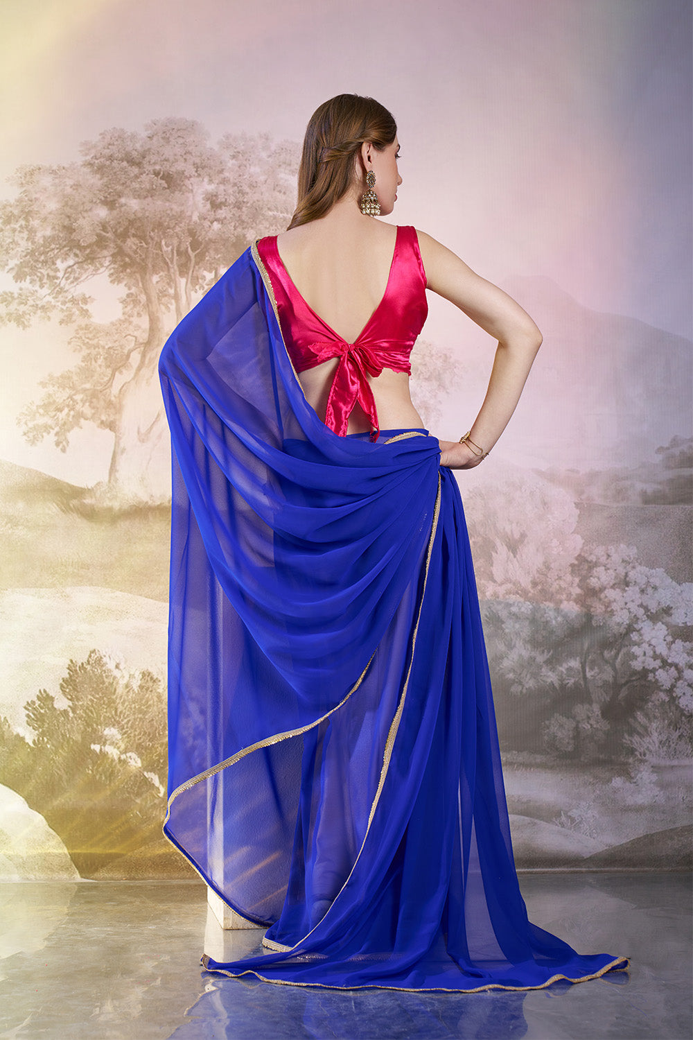 This Blue Georgette Saree comes with beautiful lace detailing and an unstitched blouse. The georgette fabric gives it a lightweight and flowy feel, perfect for any occasion. Elevate your wardrobe with this timeless and versatile piece.