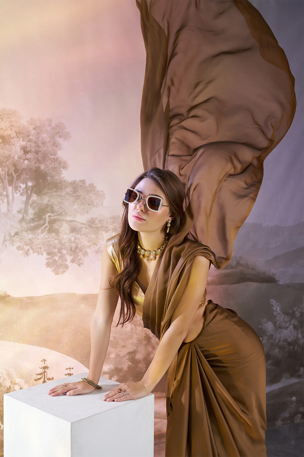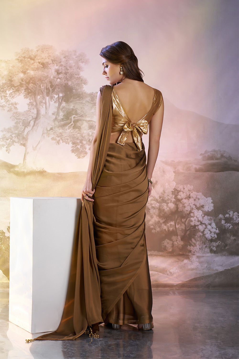 Experience elegance and luxury with our Brown Satin Saree. Made from premium quality satin, this saree features delicate tassels and comes with an unstitched blouse for a customizable fit. Upgrade your wardrobe with this timeless and versatile piece.