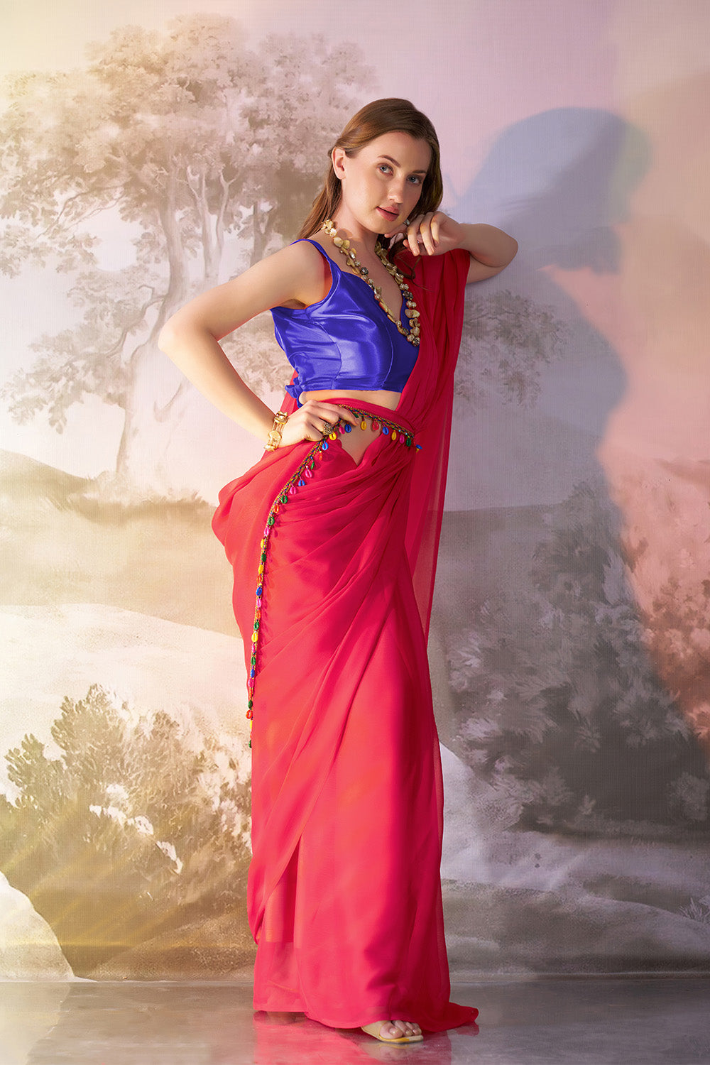 Crimson Red Chiffon Saree With Tassel And Blouse
