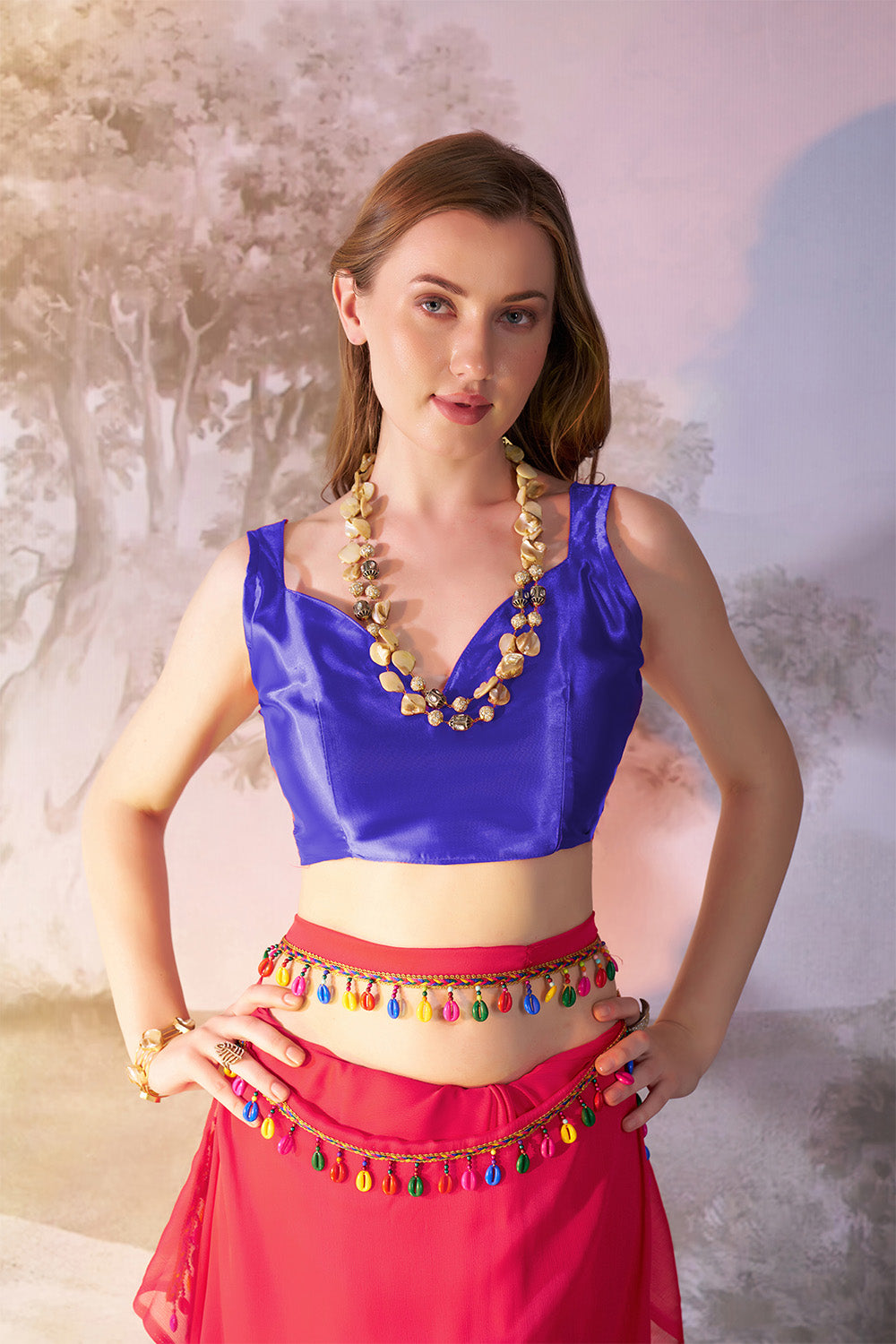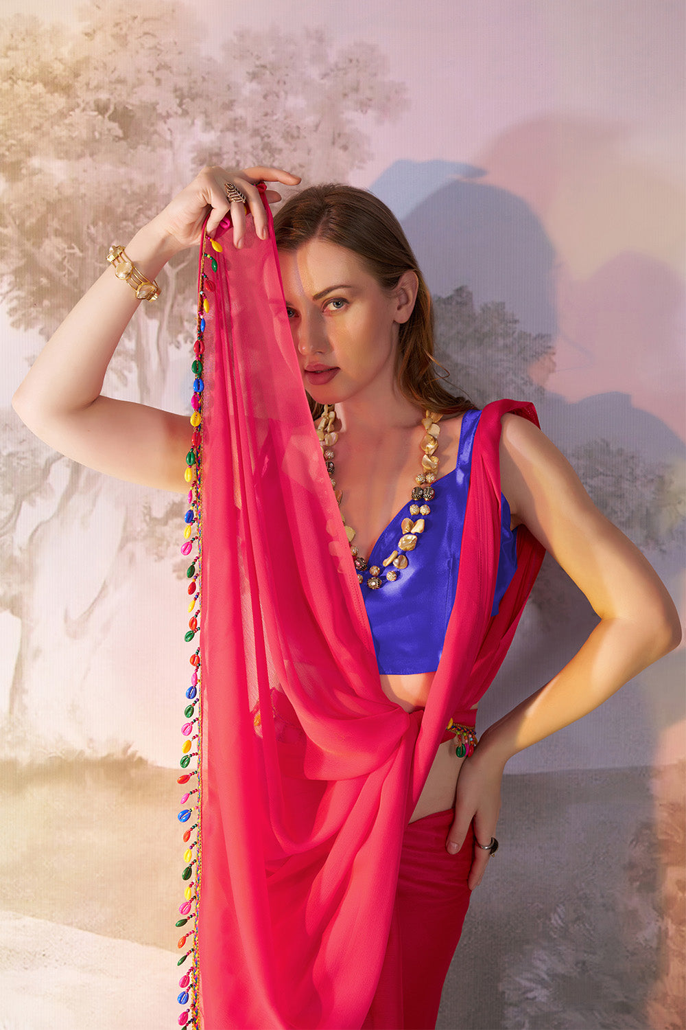 Expertly crafted with a vibrant, deep crimson red chiffon fabric, this saree boasts a touch of elegance with its delicate tassel detailing. The unstitched blouse allows for a customizable fit, making it a versatile addition to any wardrobe. Elevate any occasion with this statement piece.