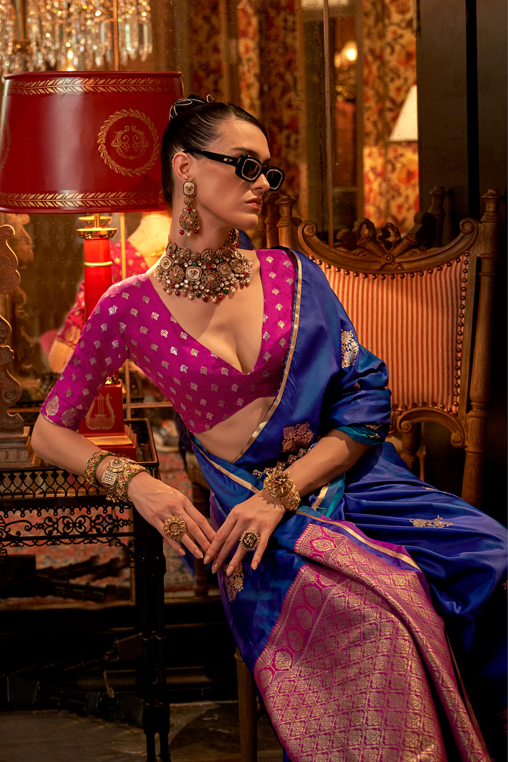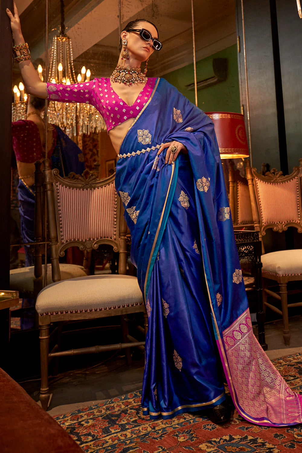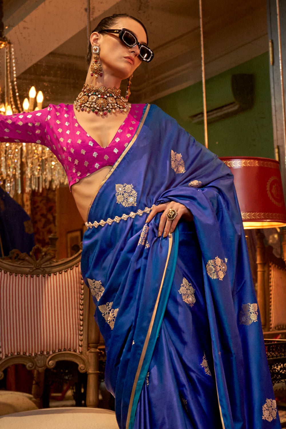 Dark Blue Satin Saree With Contrast Pallu & Blouse