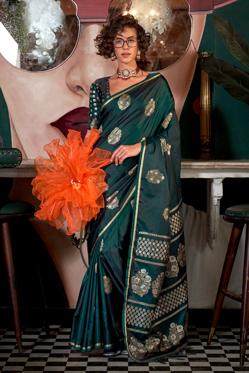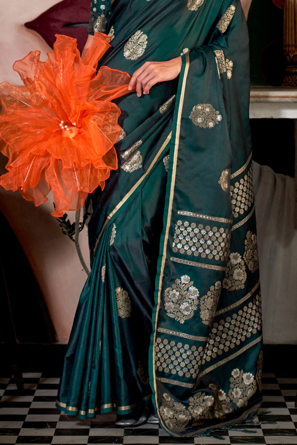 Dark Green Satin Saree With Pallu And Brocade Blouse