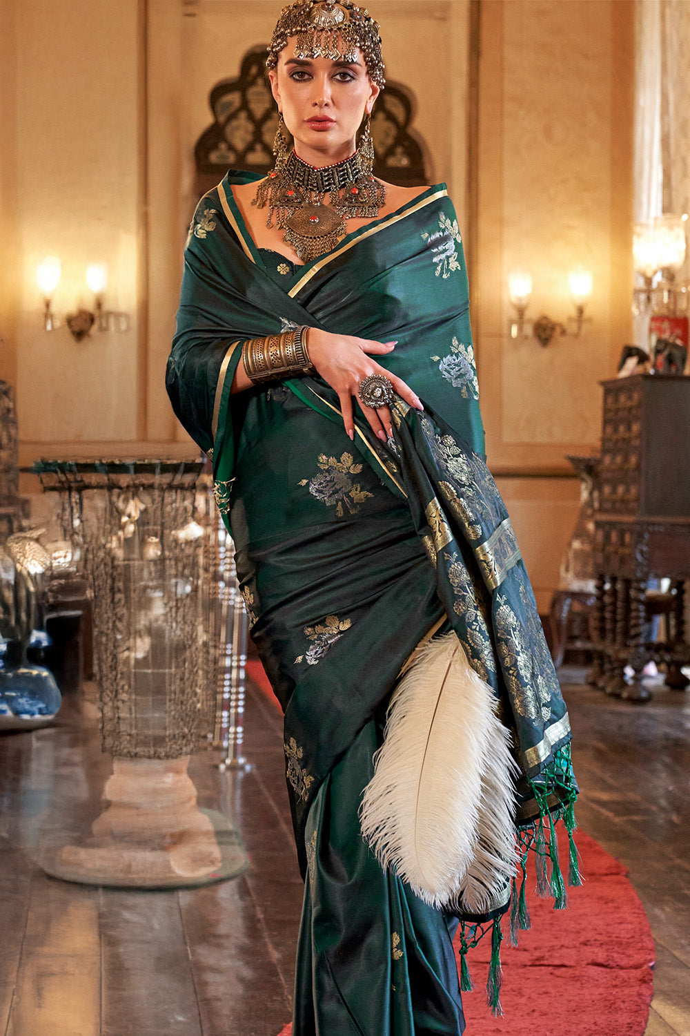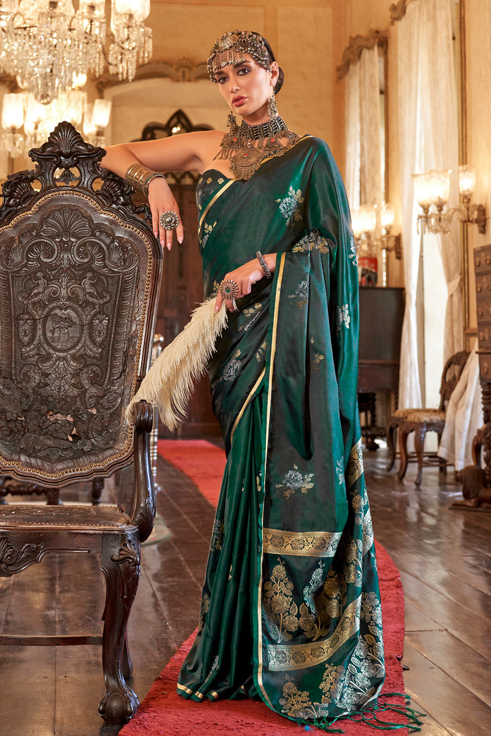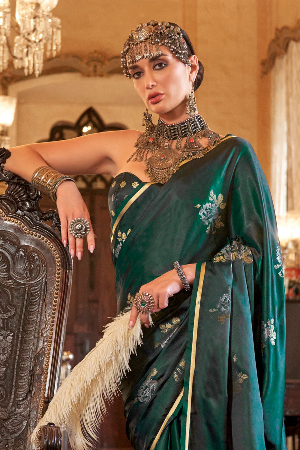 This elegant dark green saree features a luxurious satin weave, highlighting its rich and smooth texture. Paired with a stunning brocade blouse, this saree exudes sophistication and style. Perfect for any occasion, this saree is a versatile addition to your wardrobe.