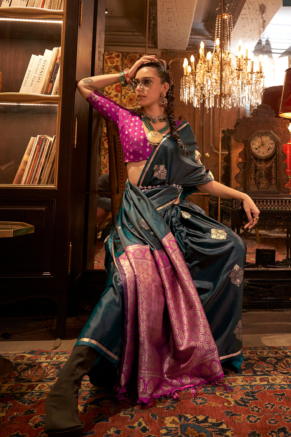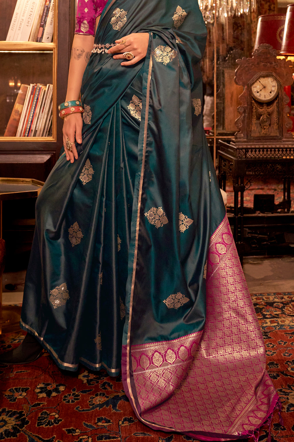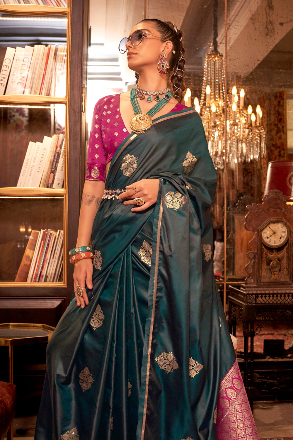 Dark Green Satin Saree With Contrast Pallu & Blouse