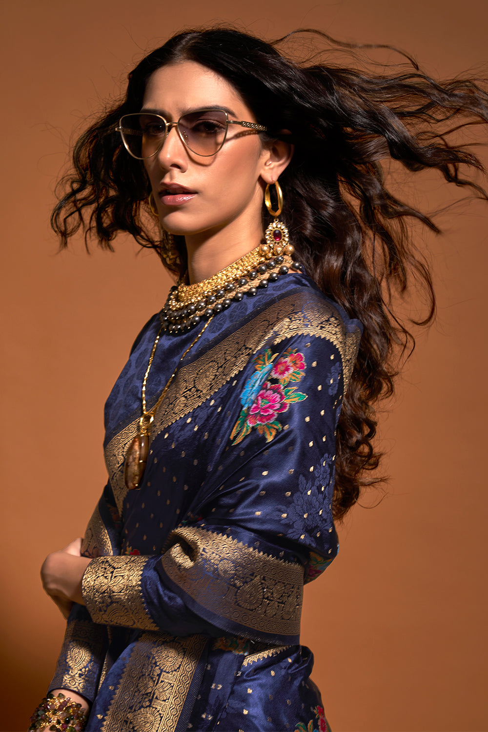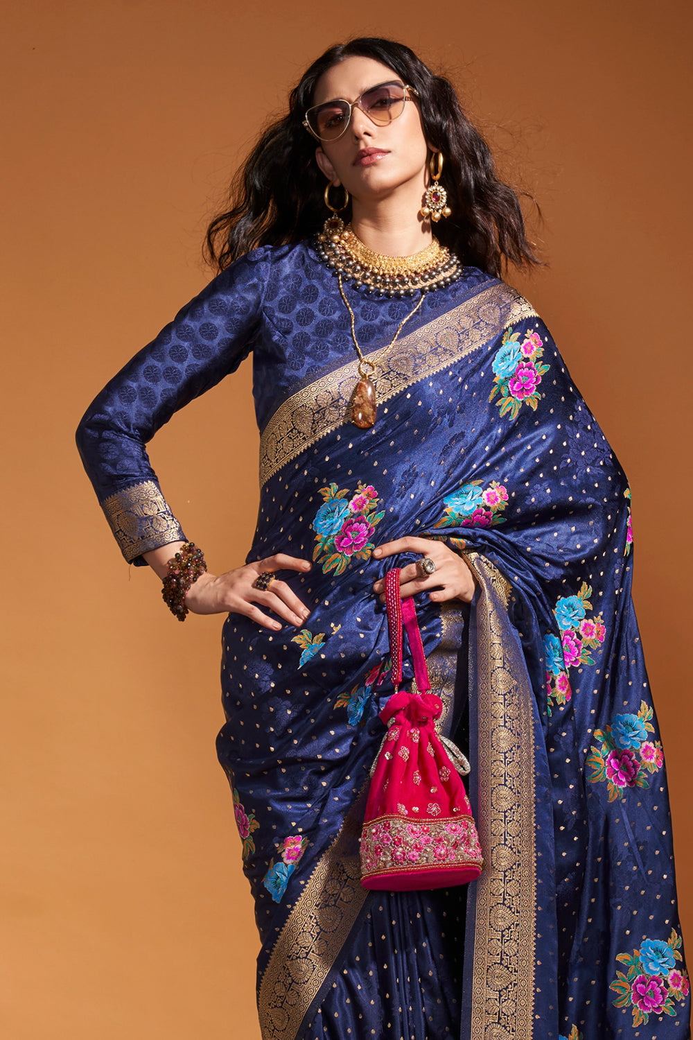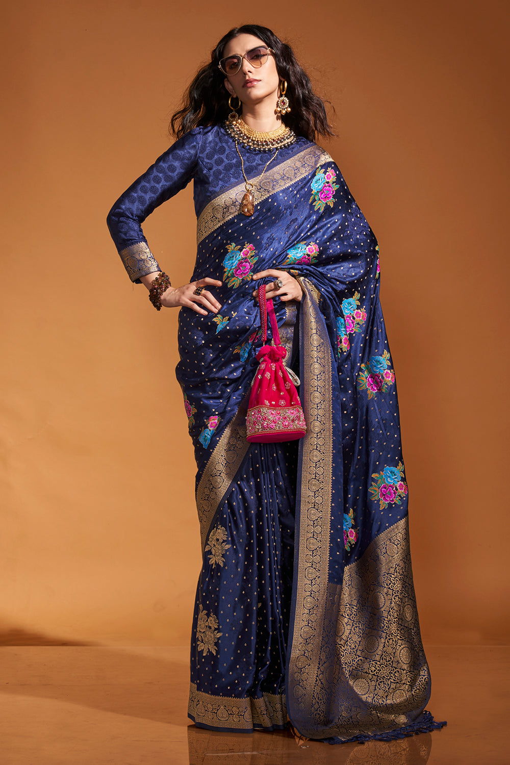 Expertly crafted from high-quality satin, this deep blue multicolor flower print saree will elevate your style game. The intricate flower print adds a touch of elegance and femininity. Comes with a matching blouse for a complete look. Perfect for weddings, parties, or any special occasion.