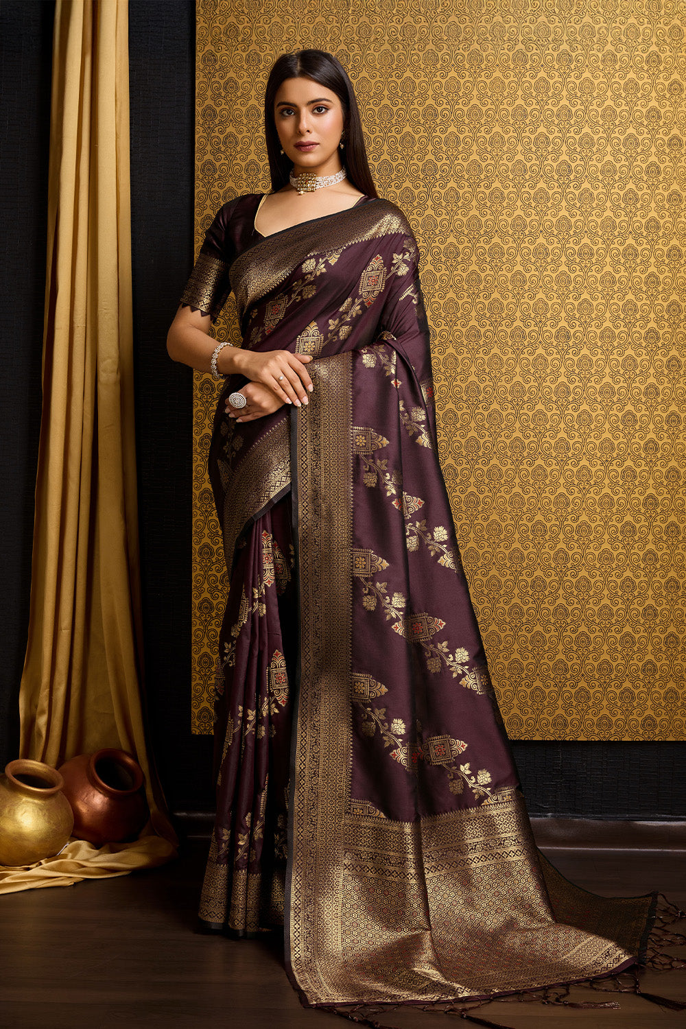 Elevate your traditional wardrobe with this Deep Maroon Banarasi Sari featuring an intricate bel design. Crafted with rich silk, it showcases the timeless elegance and craftsmanship Banarasi saris are known for. The deep maroon shade adds sophistication, making it perfect for festive occasions and formal events. Its detailed bel motifs enhance the fabric's texture, offering a luxurious drape and a regal appeal that stands out effortlessly.