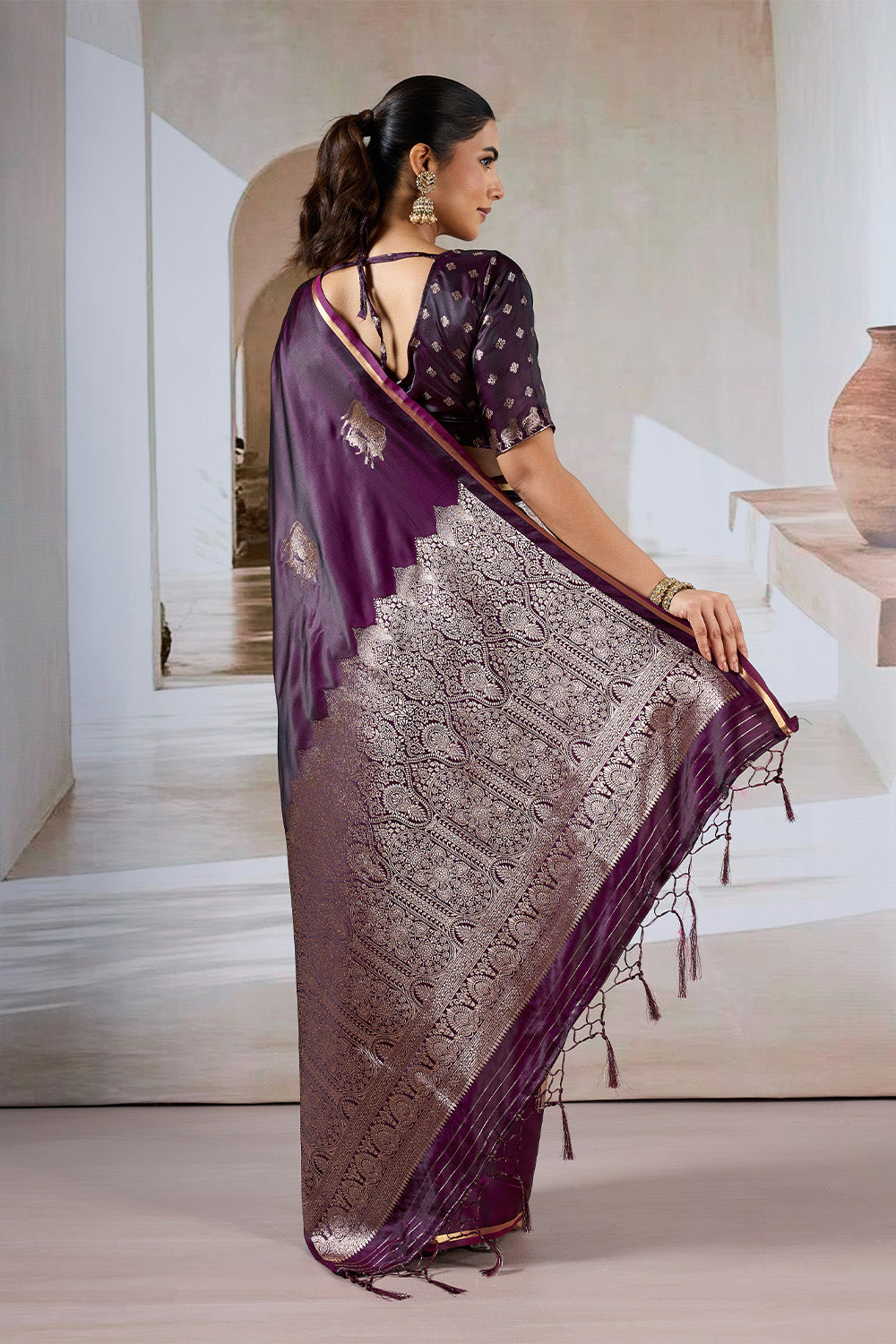 Deep Purple Cow Motif Satin Weave Saree With Blouse