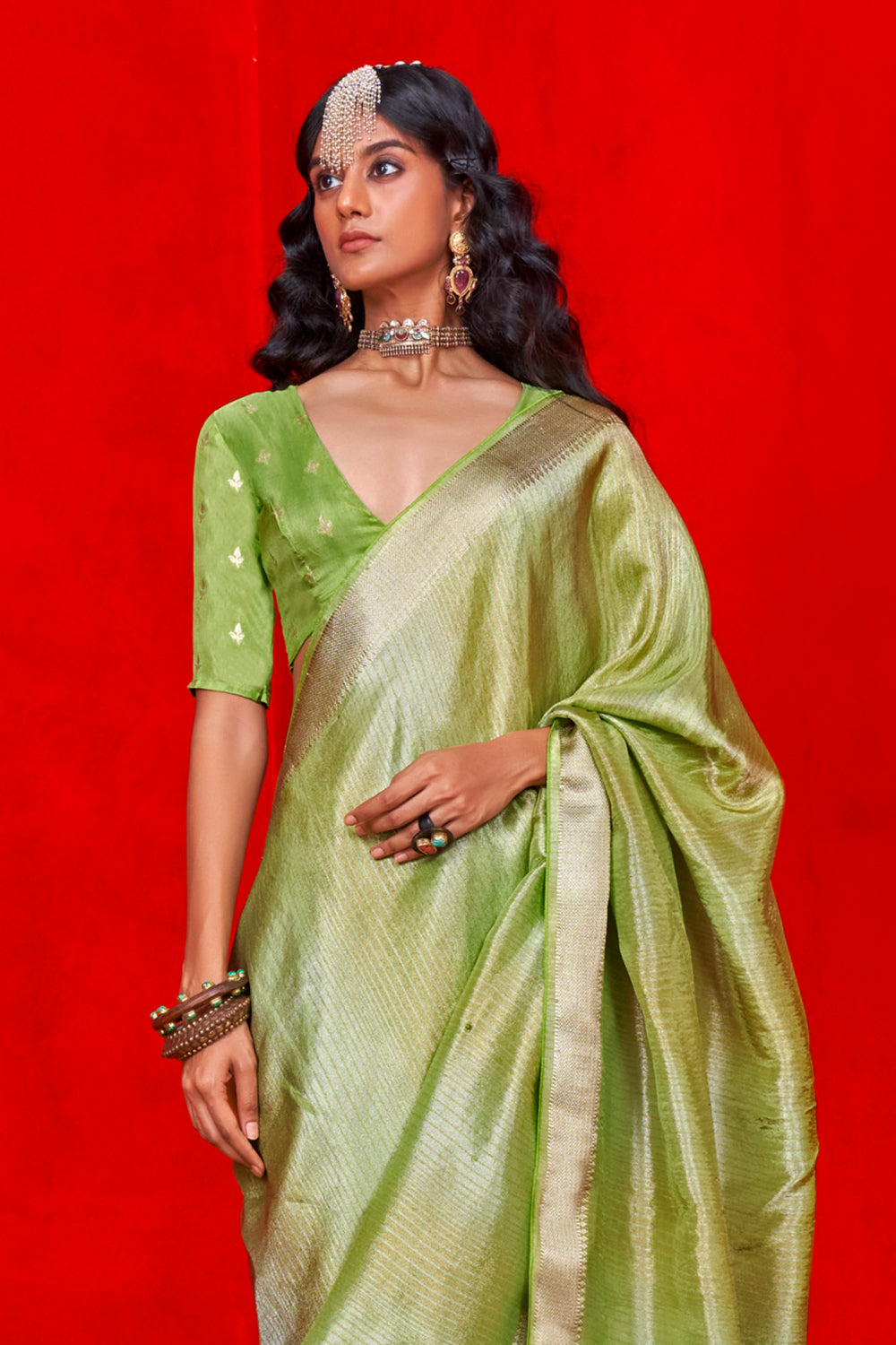 Dusty Green Viscose Zari Tissue Saree With Blouse