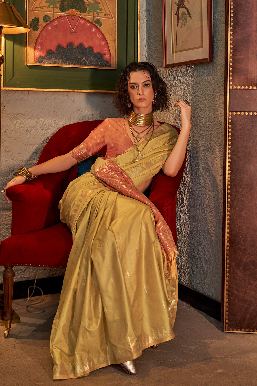 Dusty Yellow Saree With Contrast Ikkat Pallu And Blouse