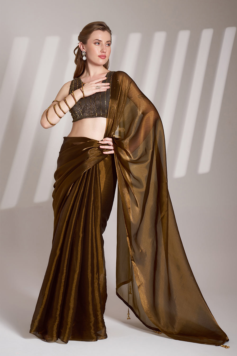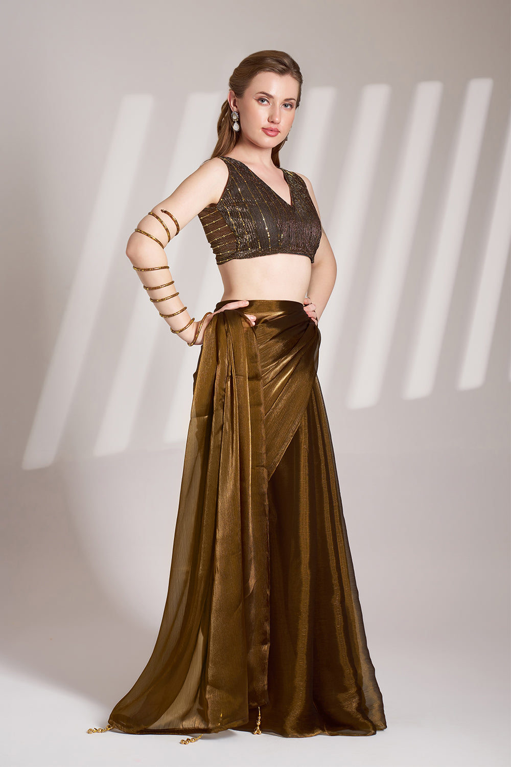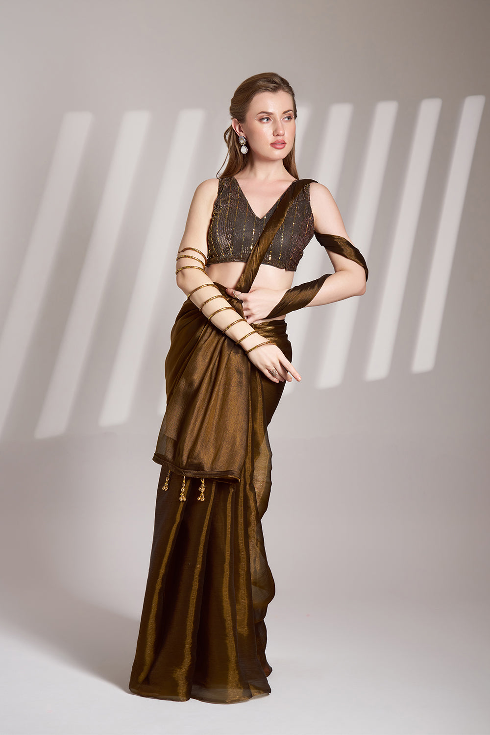 Expertly crafted with delicate gold organza and accented with intricate lace, this saree offers a timeless elegance. It comes with an unstitched blouse, giving you the freedom to create your own unique style. Elevate your wardrobe with this luxurious and versatile piece.