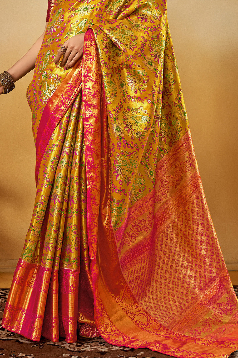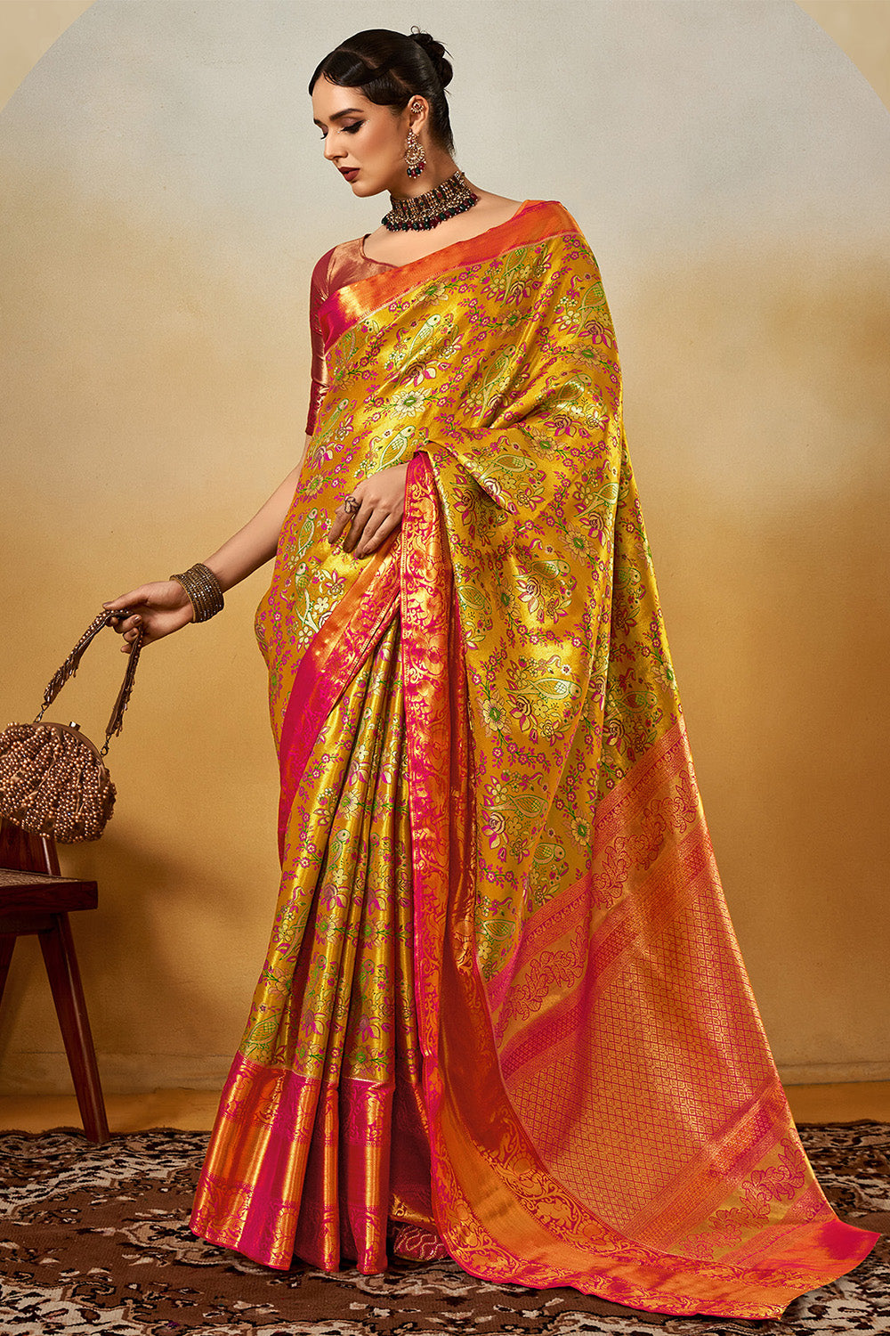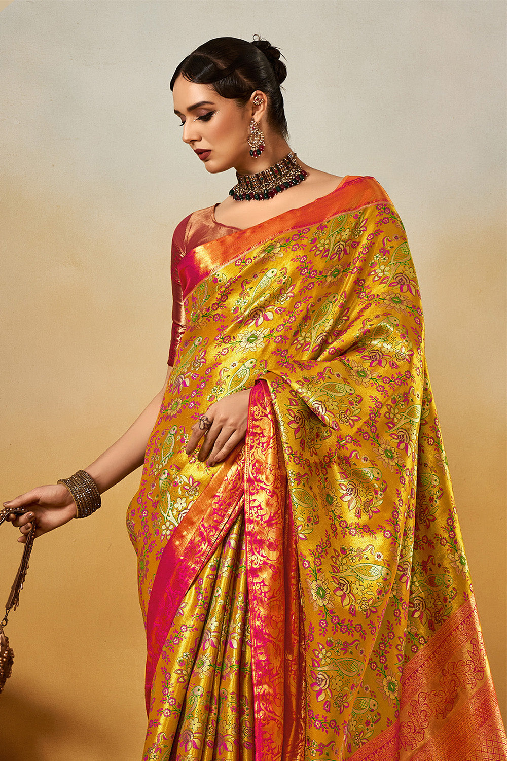 This elegant Golden Dual Tone Jaquard Saree With Blouse is a must-have for any wardrobe. Made with high-quality jacquard fabric, it offers a sophisticated look with its dual tone design. Perfect for any occasion, this saree is sure to make you stand out.