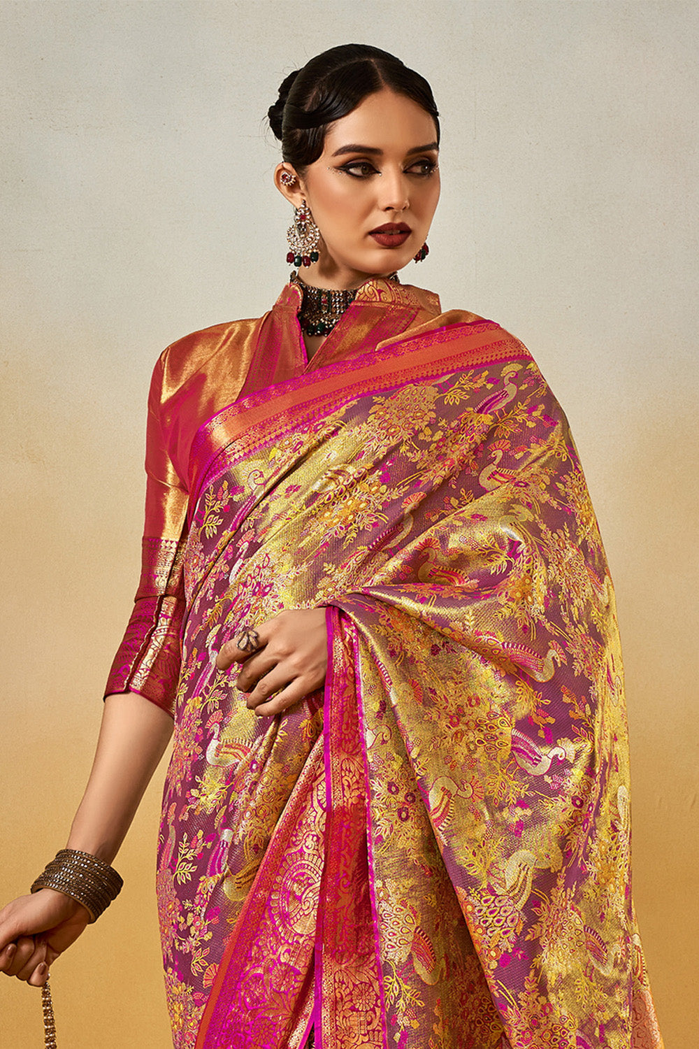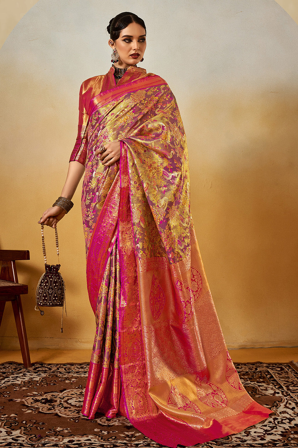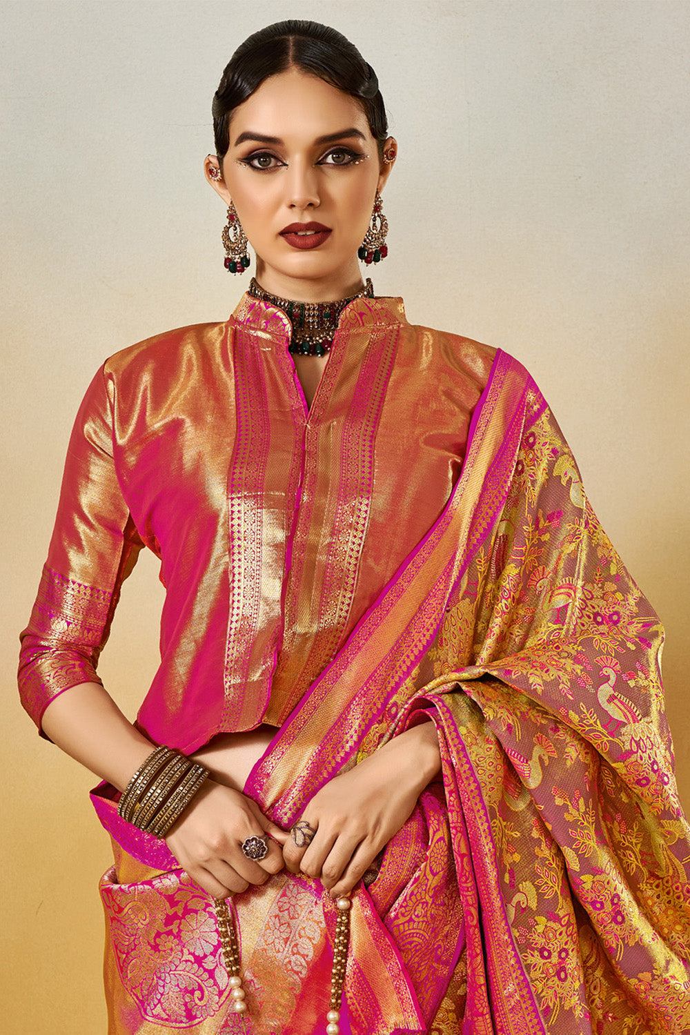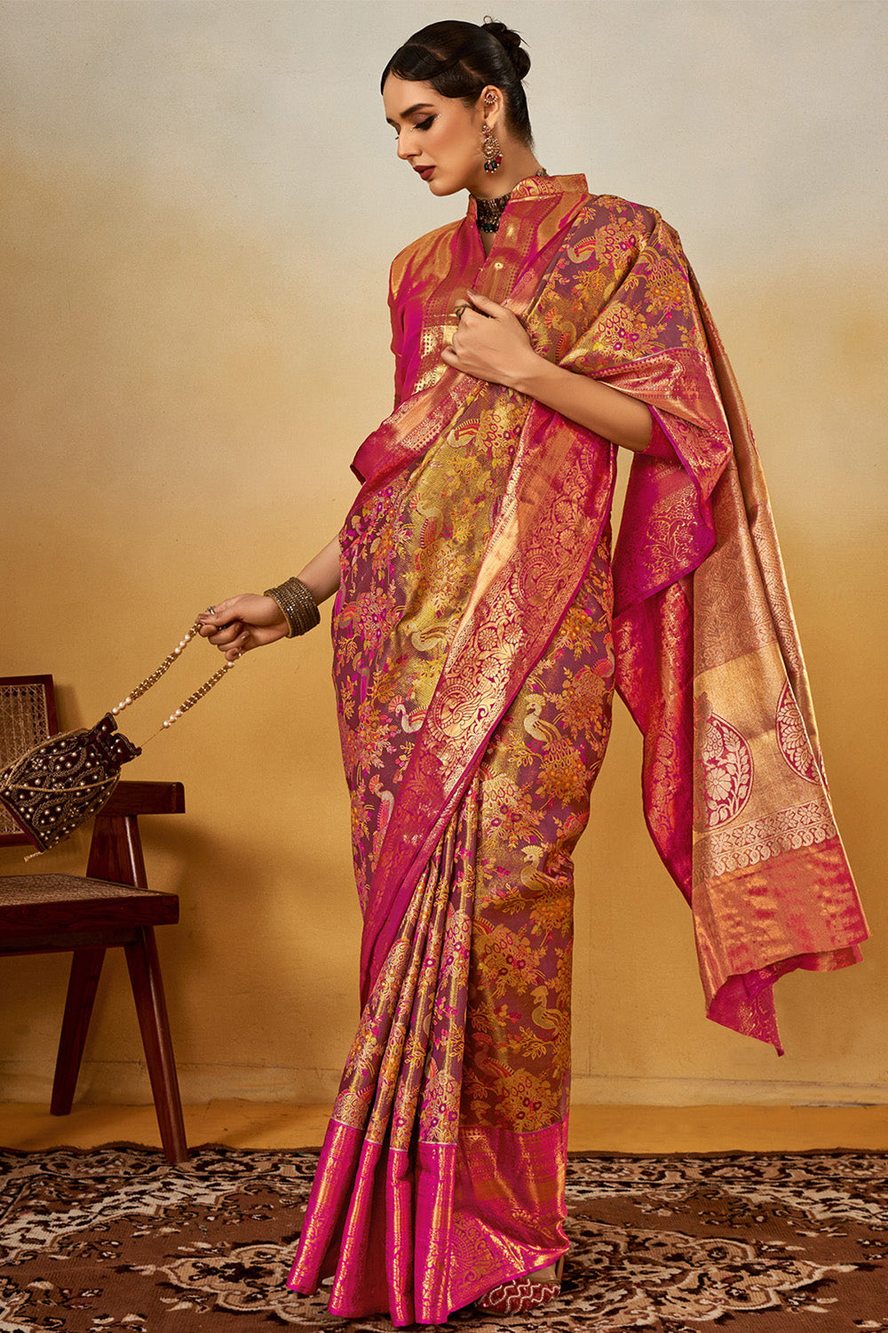 Elevate your style with our Golden Dual Tone Jaquard Saree with Blouse. Crafted with expertise, this saree features a unique dual tone effect that adds depth and richness to the golden fabric. Stand out from the crowd with this elegant and versatile piece that can be dressed up or down for any occasion.