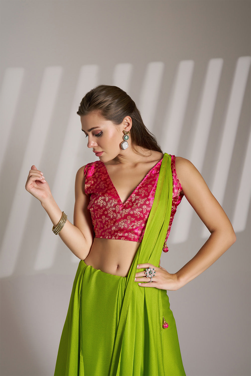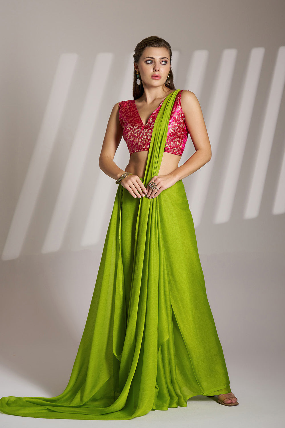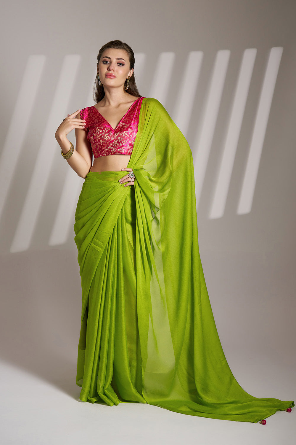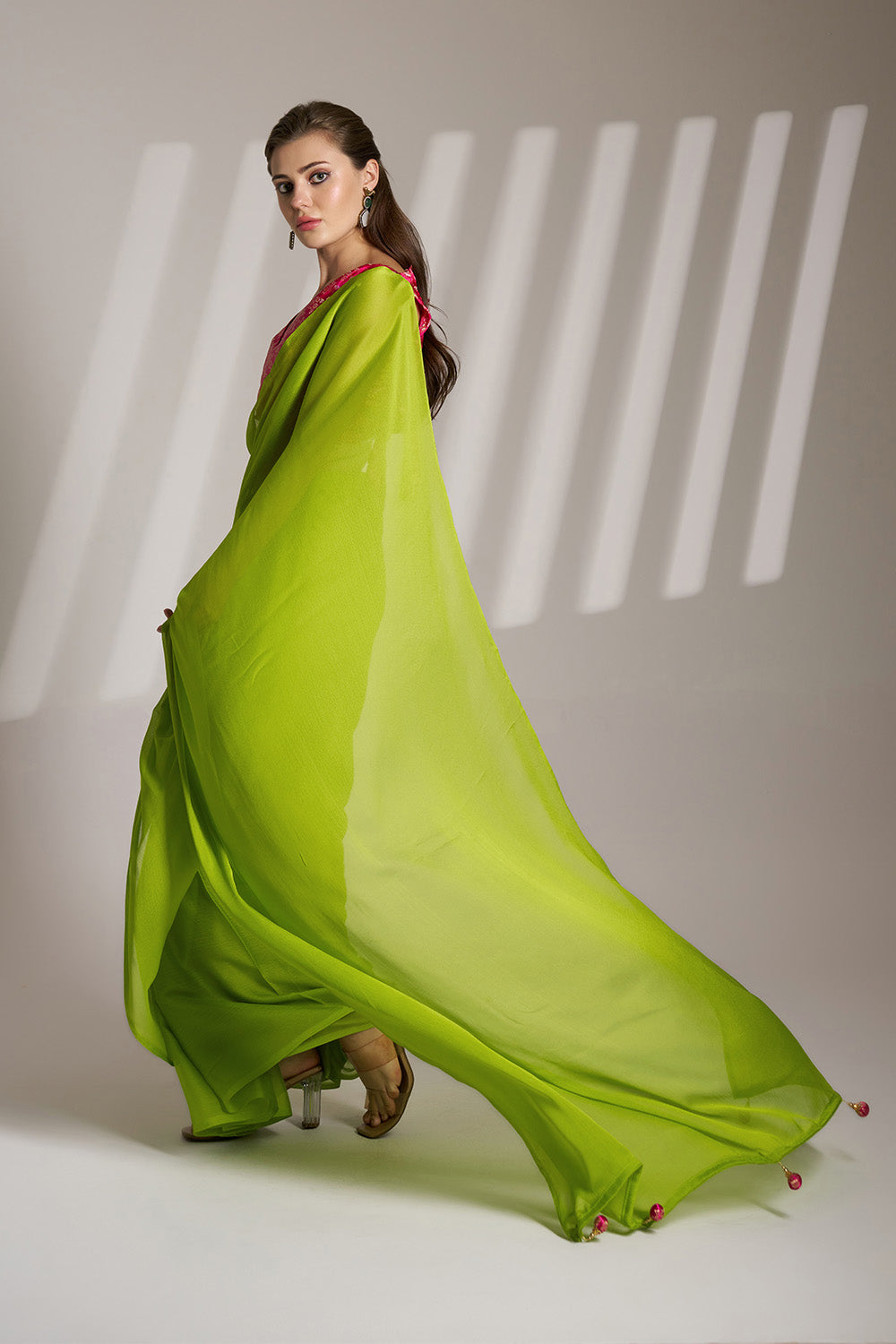 Expertly crafted from high-quality chiffon, this green saree features elegant tassels and comes with an unstitched blouse. Elevate your traditional wardrobe with this versatile and timeless piece. Made to last, the saree drapes beautifully and offers a comfortable fit. Perfect for any occasion, this saree is a must-have for saree lovers.