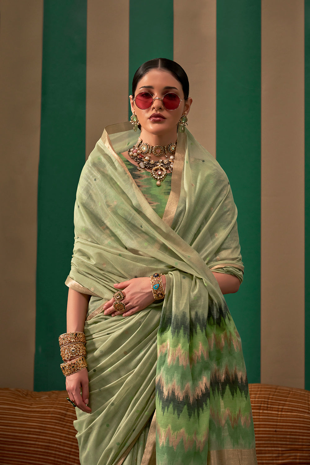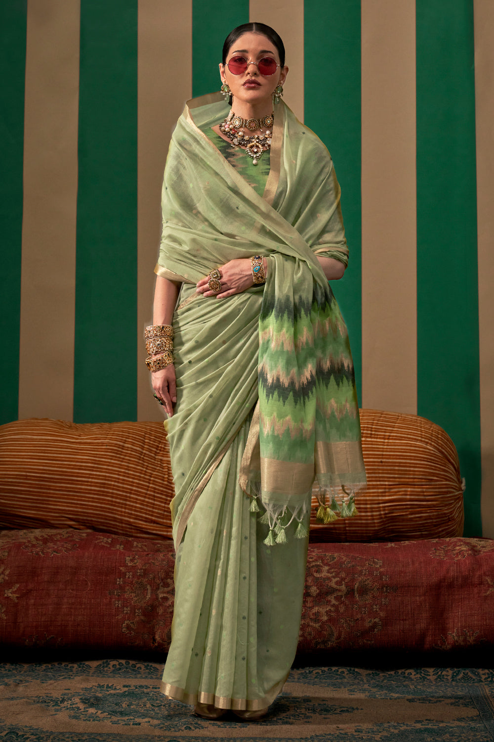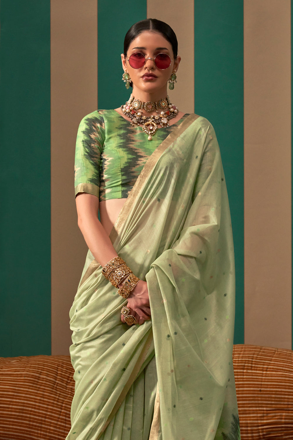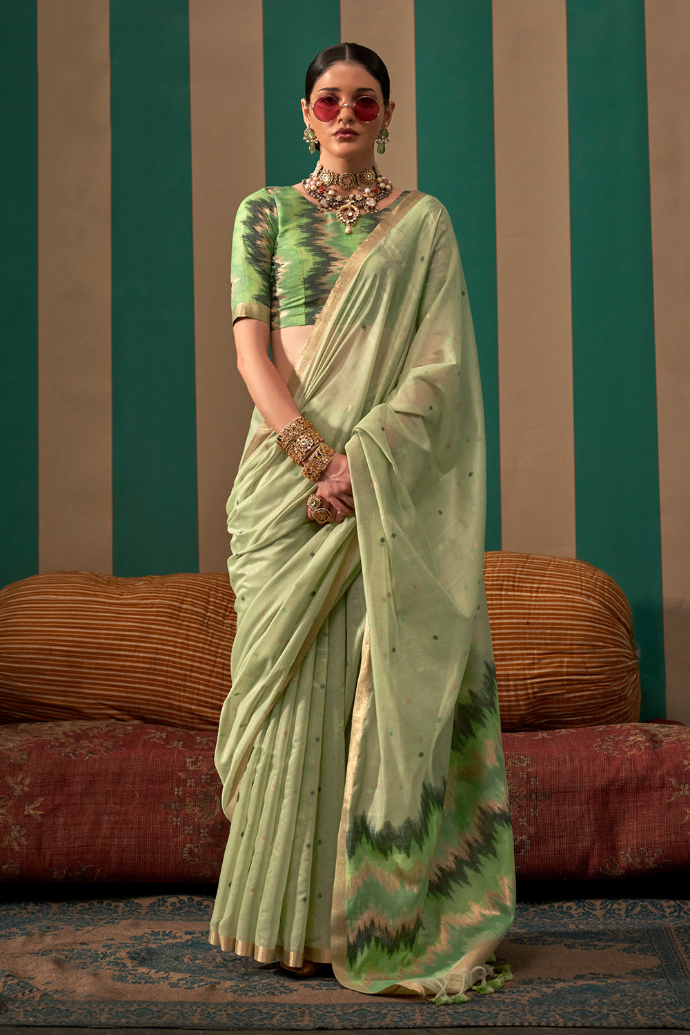 This elegant ikkat saree in green offers a stunning blend of traditional charm and modern sophistication. Its intricate pattern and vibrant color make it a perfect choice for any occasion. Complete with a matching blouse, this saree will add a touch of grace and style to your wardrobe.