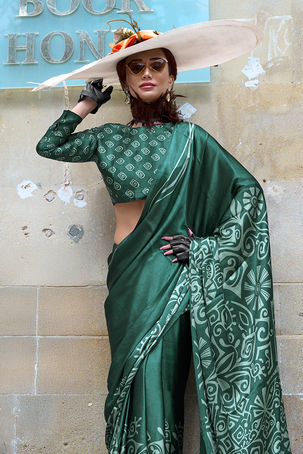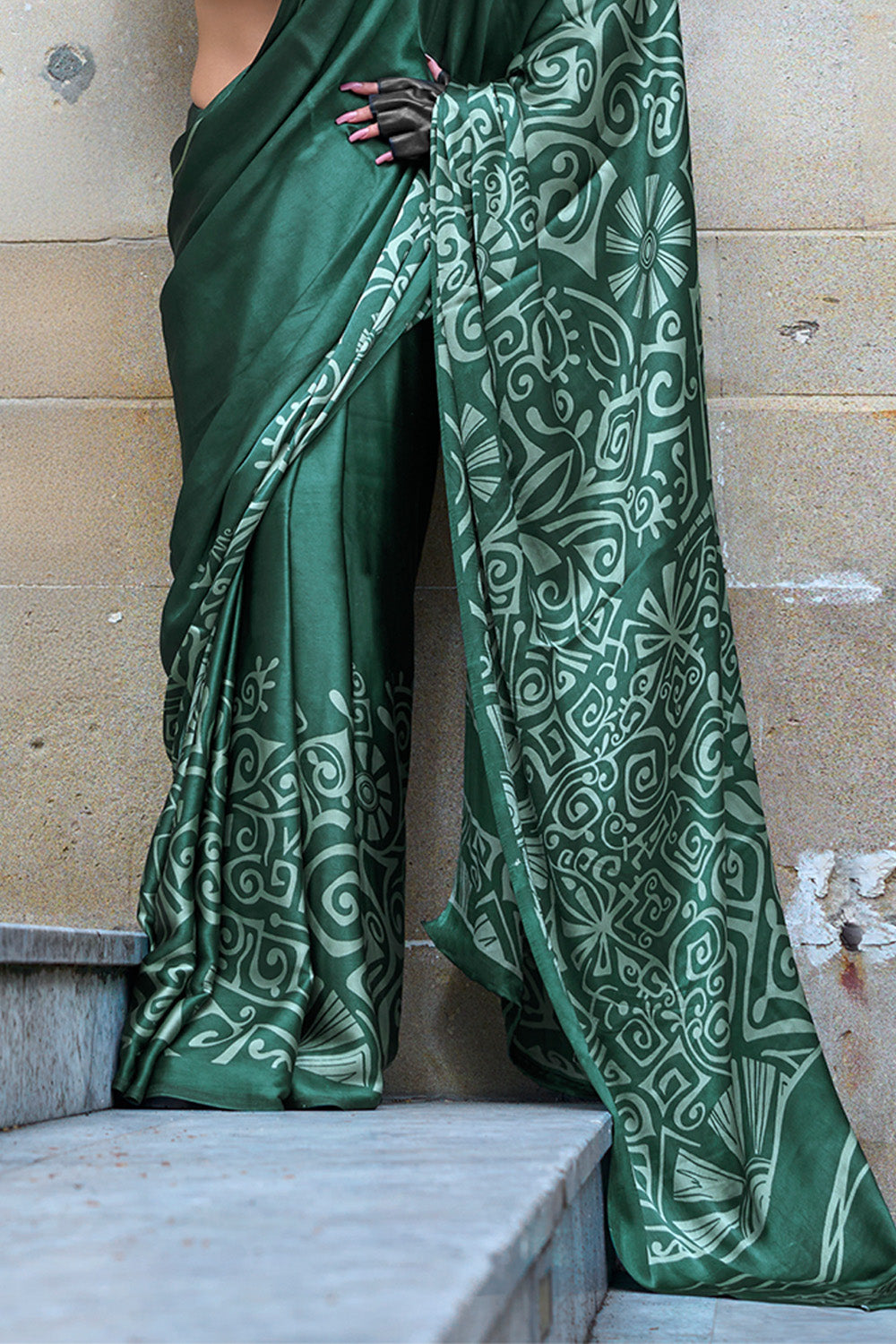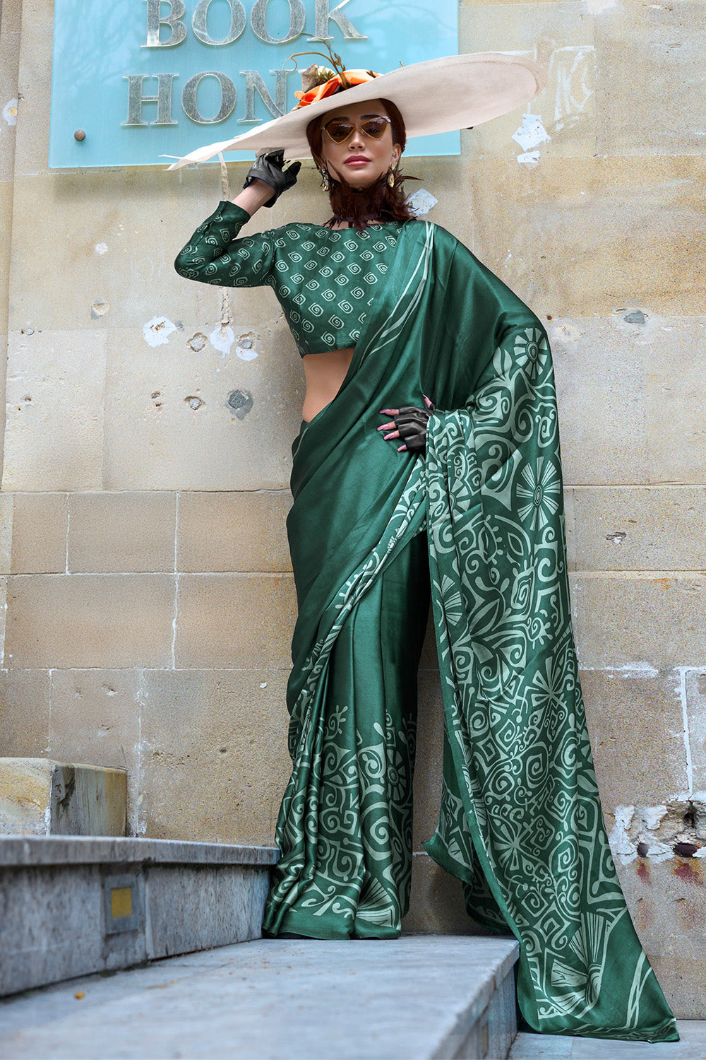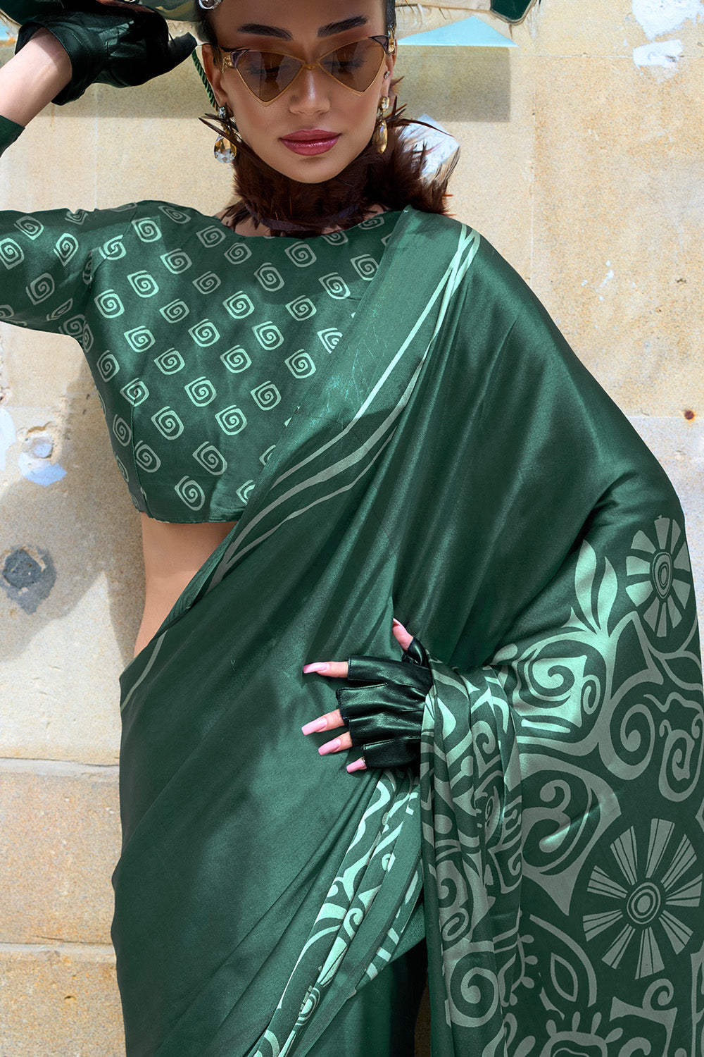 Green Print Satin Crepe Sarees With Blouse