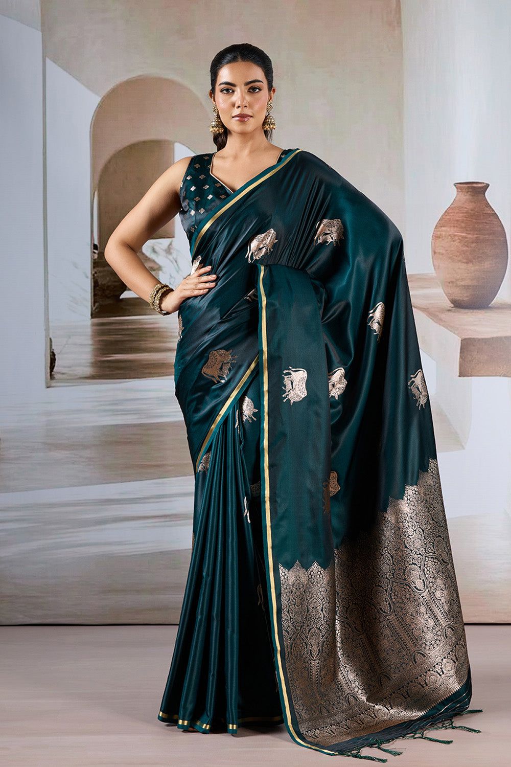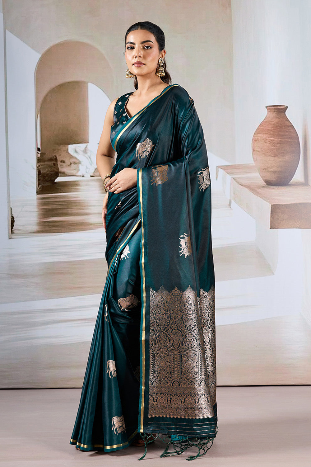 This Green Satin Weave Saree, featuring an intricate cow motif and paired with a matching blouse, combines traditional elegance with luxurious comfort. The smooth satin weave fabric ensures a graceful drape and a soft, refined texture. Its rich green hue enhances the saree’s sophisticated appeal, while the culturally significant motif adds a unique artistic touch, making it perfect for festive occasions and formal events. An excellent choice for those who appreciate heritage craftsmanship presented with contemporary style.