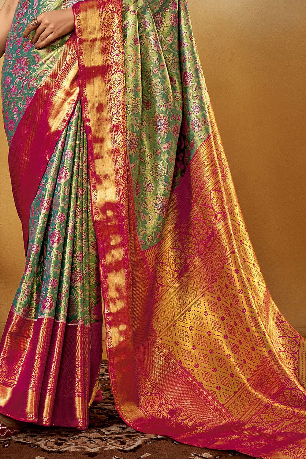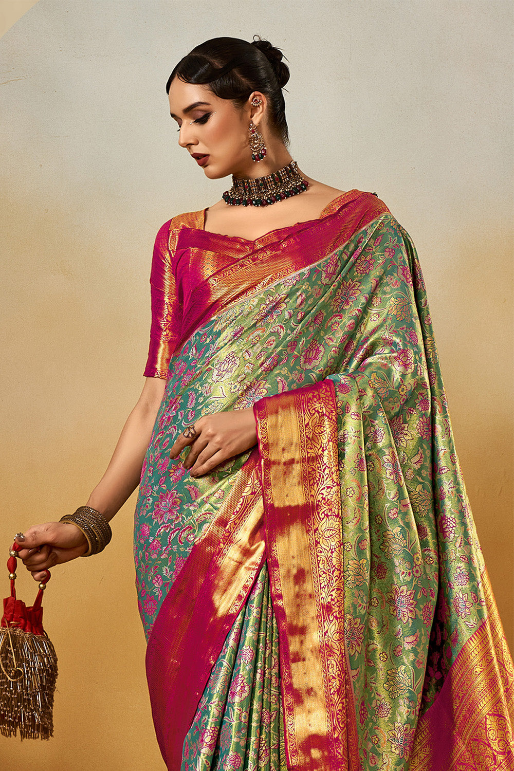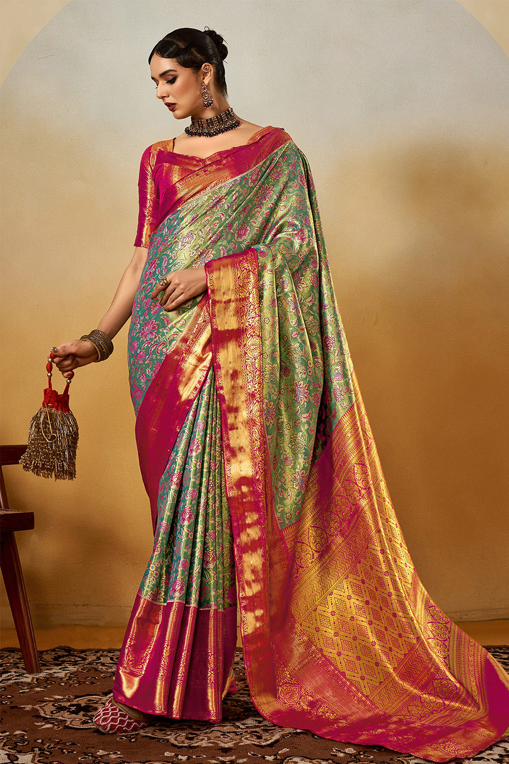 Crafted with intricate Jaquard weaving, this Green Dual Tone Saree exudes elegance and style. The unique dual tone and contrasting border add a touch of sophistication. Complemented with a matching blouse, this saree is perfect for any occasion. Elevate your wardrobe with this exquisite piece.