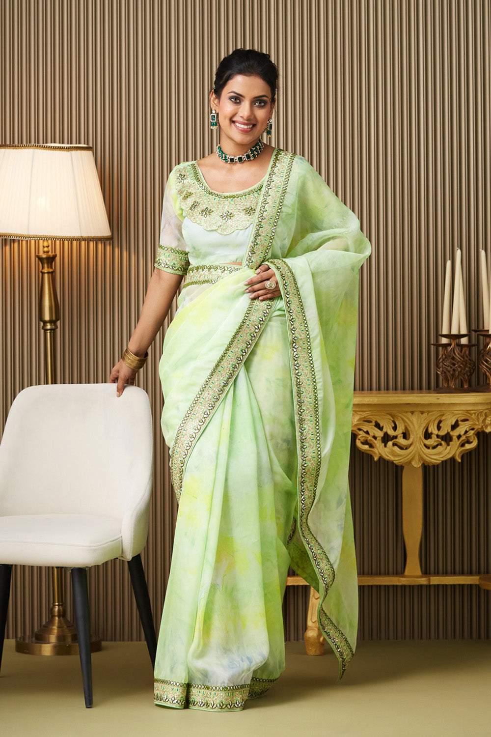 Elevate your ethnic wardrobe with this Green Embroidered Organza Saree, paired with a matching blouse. Crafted from delicate organza fabric, it features intricate embroidery that adds a refined touch of elegance. Lightweight and breathable, this saree ensures comfort while making a sophisticated statement at any occasion. Perfect for festive events or formal gatherings, it combines traditional charm with contemporary style.