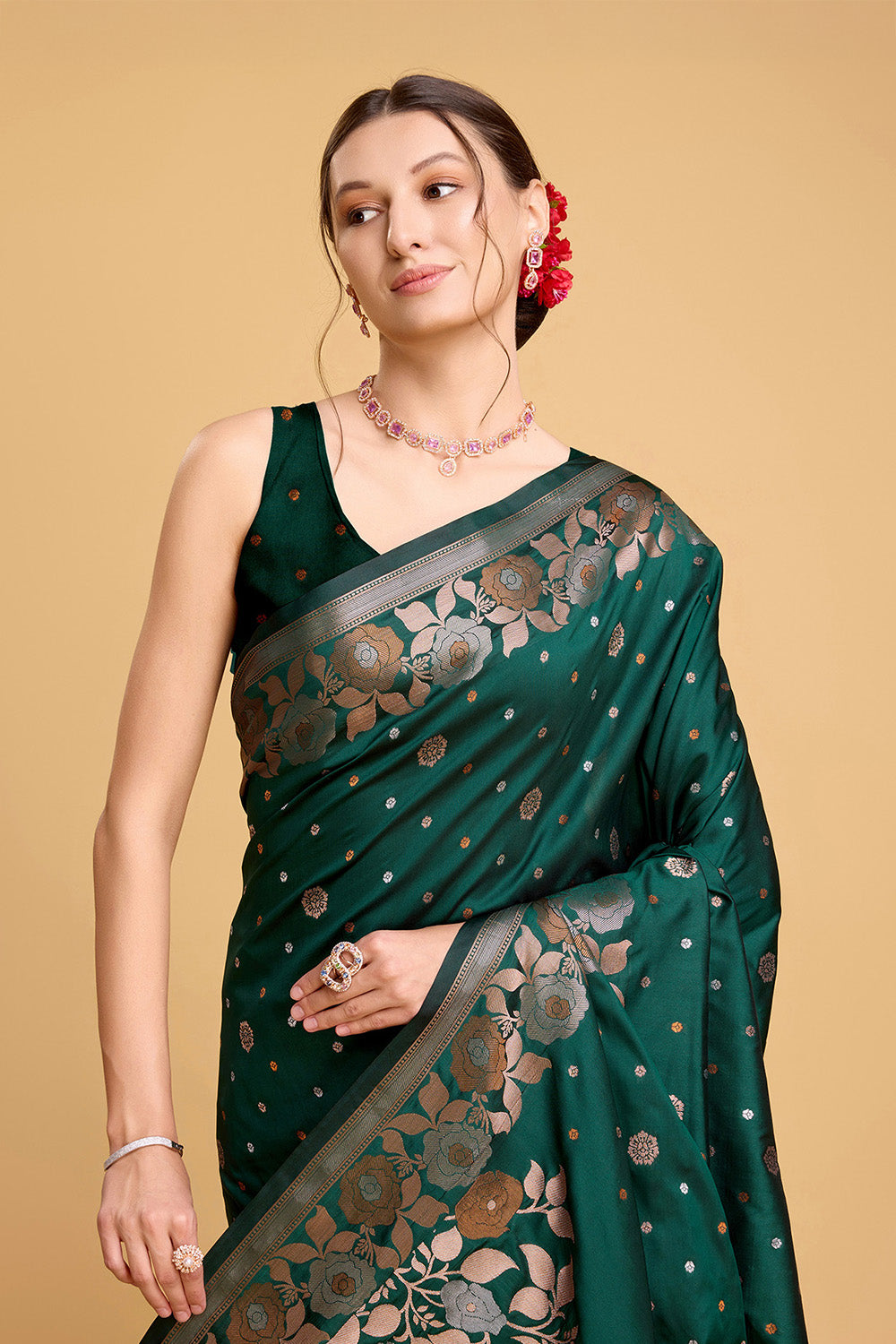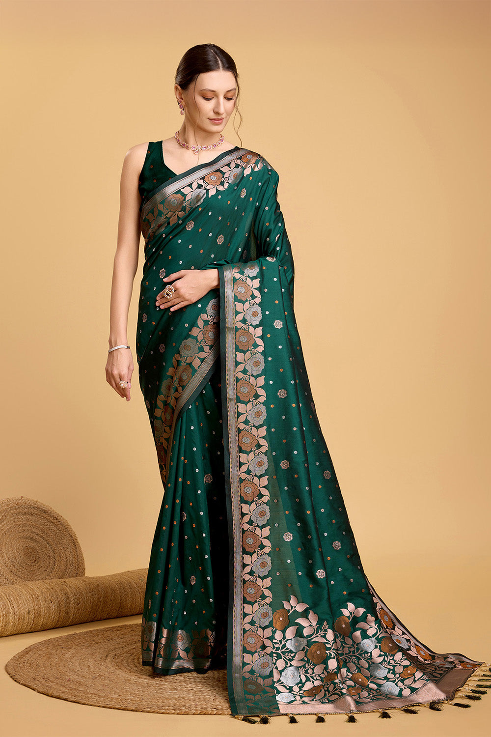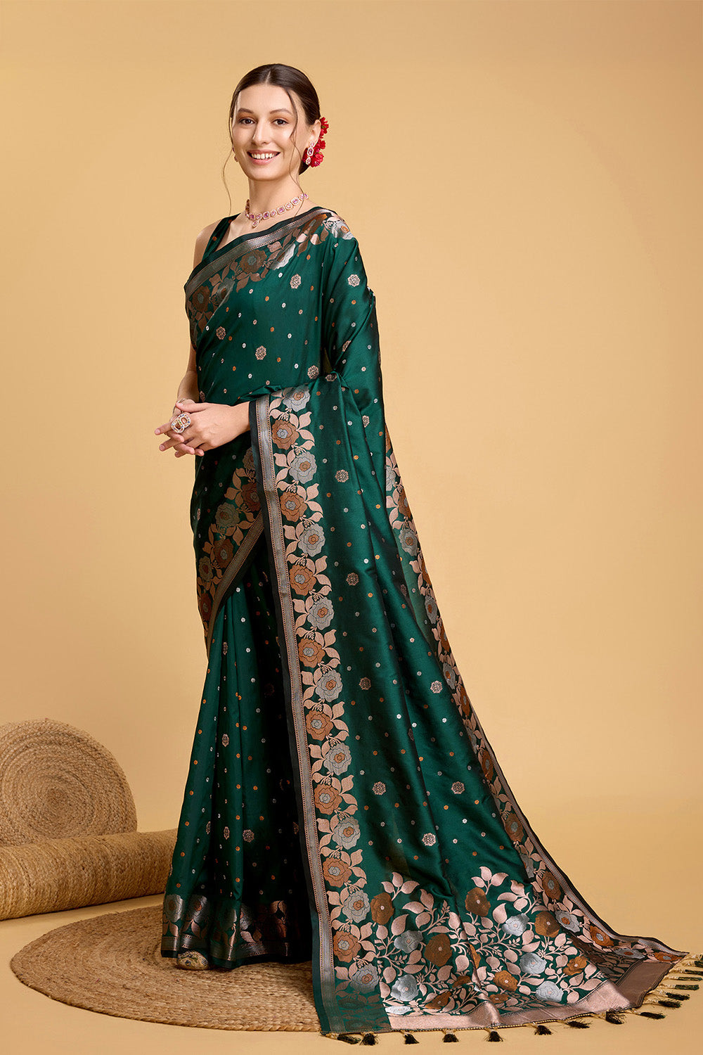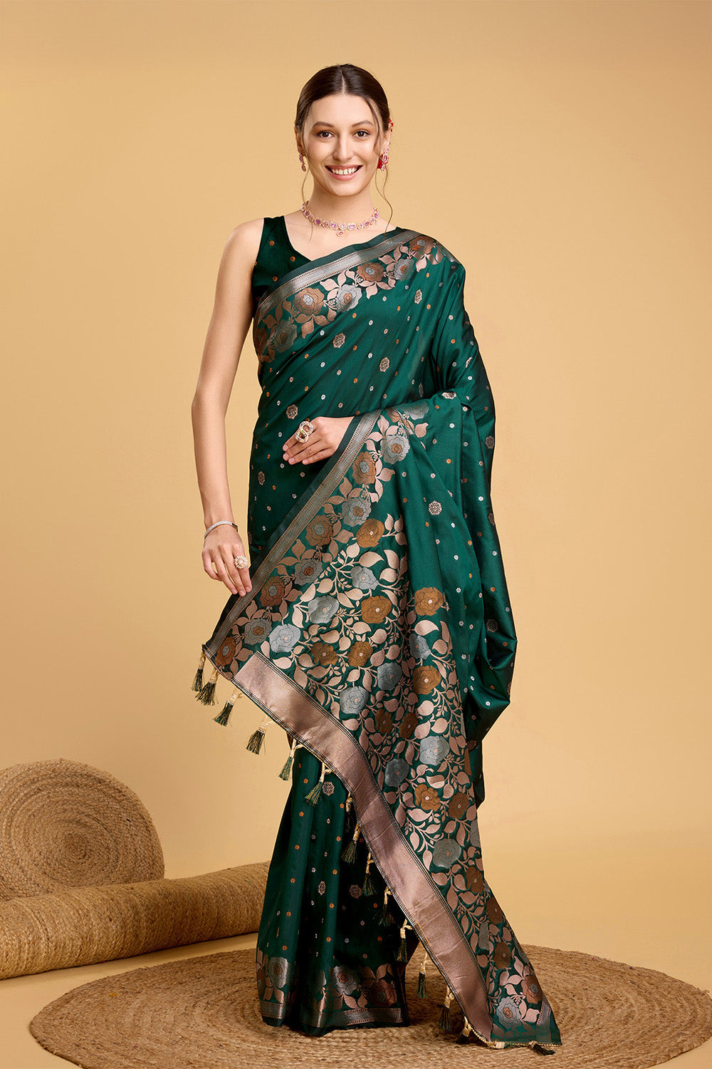 This beautiful Green Floral Motif Saree is a perfect addition to your wardrobe. The intricate floral pattern adds a touch of elegance, while the tassel detailing adds a playful element. The included blouse completes the look, making it a versatile and stylish choice for any occasion.