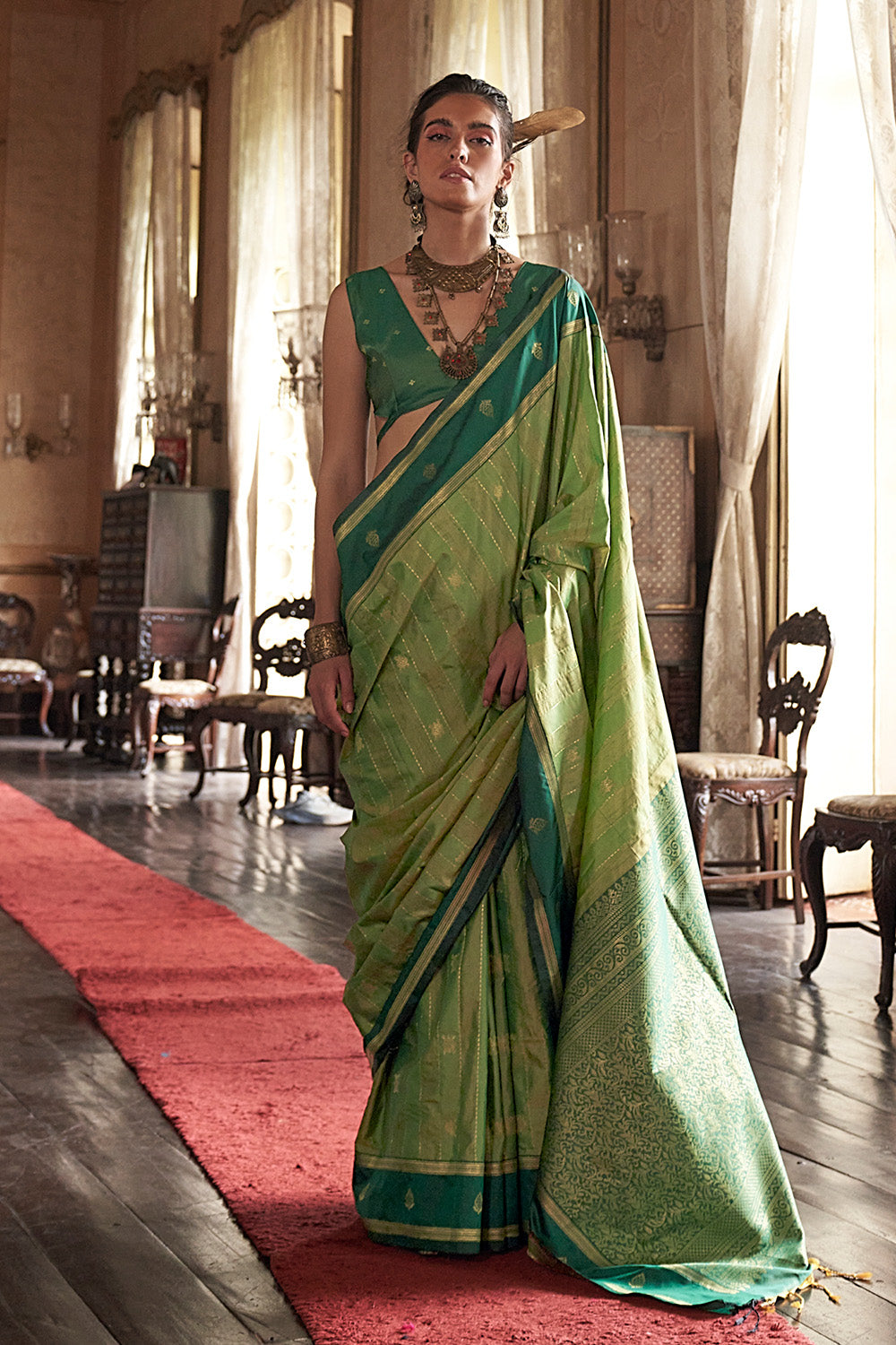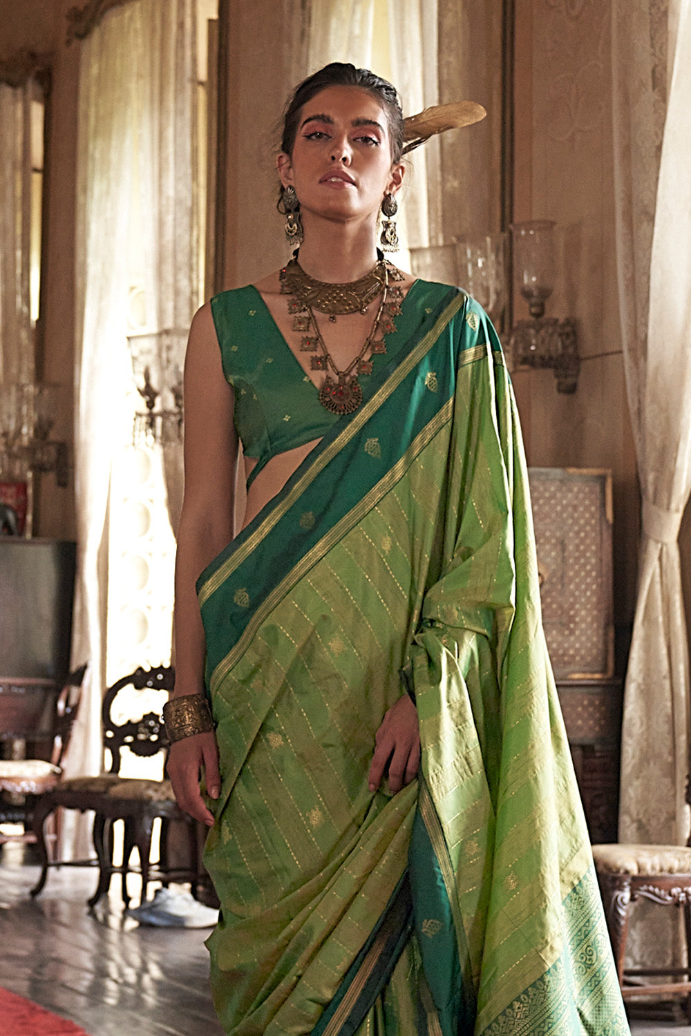 This Green Leheriya Stripes Saree, paired with a matching blouse, showcases the timeless charm of traditional Leheriya dyeing techniques. The saree features elegant striped patterns in vibrant green tones, creating a dynamic yet graceful appearance. Crafted for a fluid drape and comfortable wear, it is perfect for festive occasions and cultural celebrations. Combining heritage craftsmanship with contemporary style, this ensemble delivers both sophistication and effortless elegance.