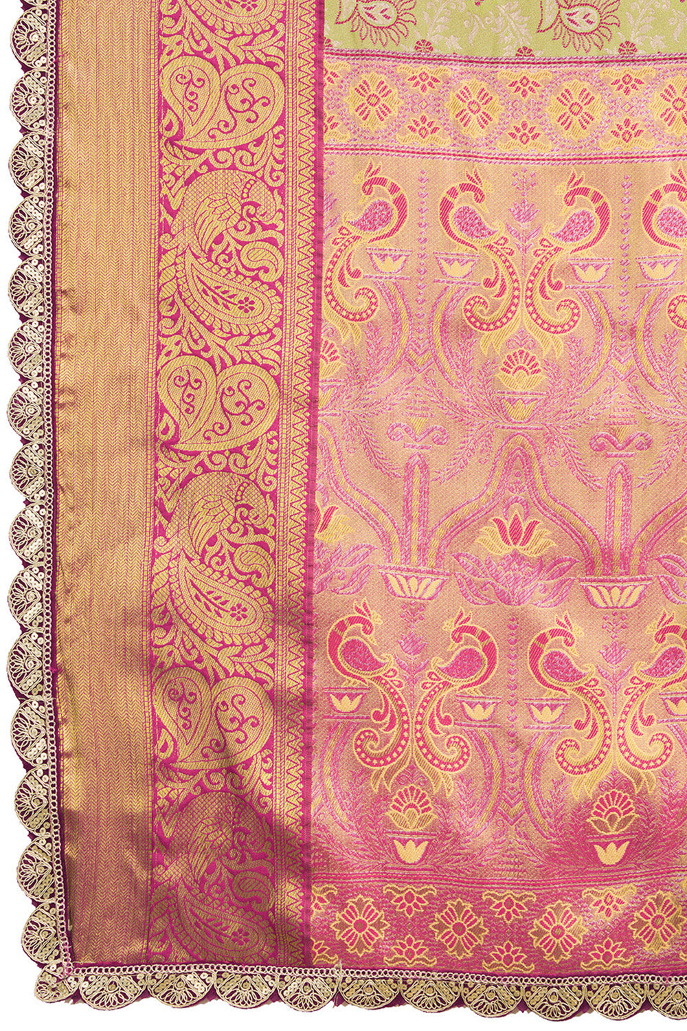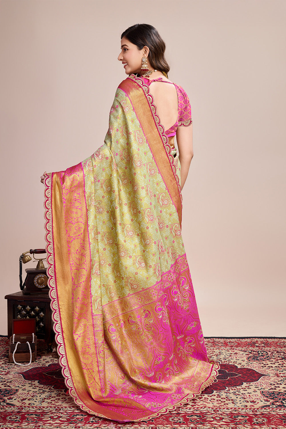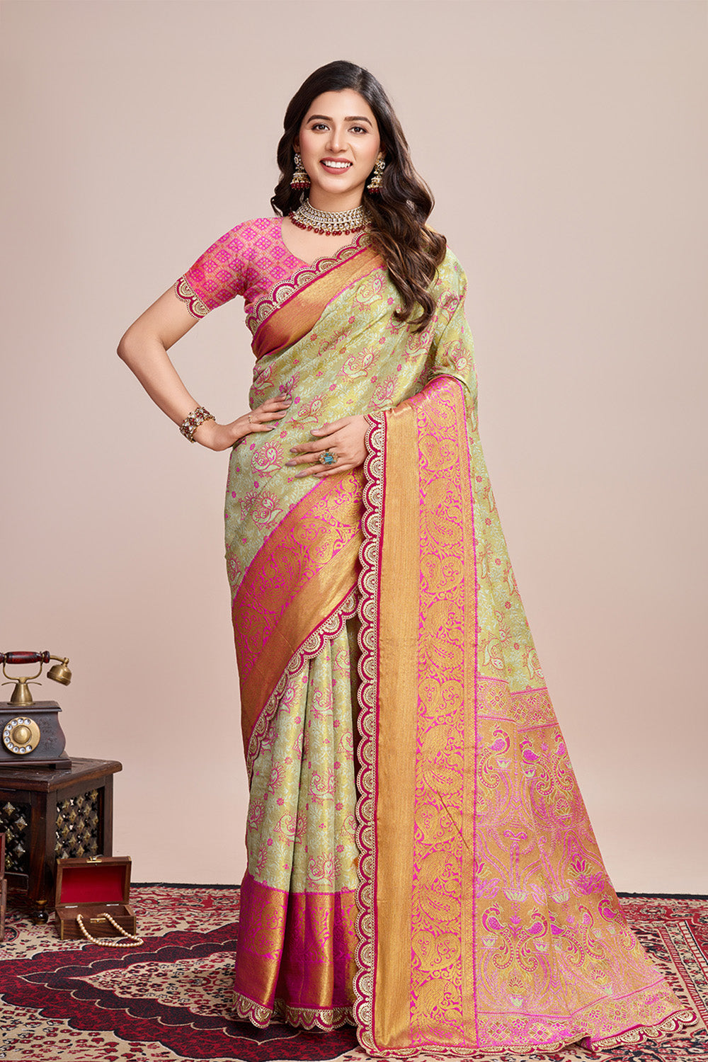 This Green Orange All Over Zari Saree features a stunning weave and a rich, embellished pallu. Handcrafted with care, this saree is perfect for any special occasion. The vibrant colors and intricate details are sure to make a statement and stand out in the crowd. Experience true elegance and luxury in this saree.