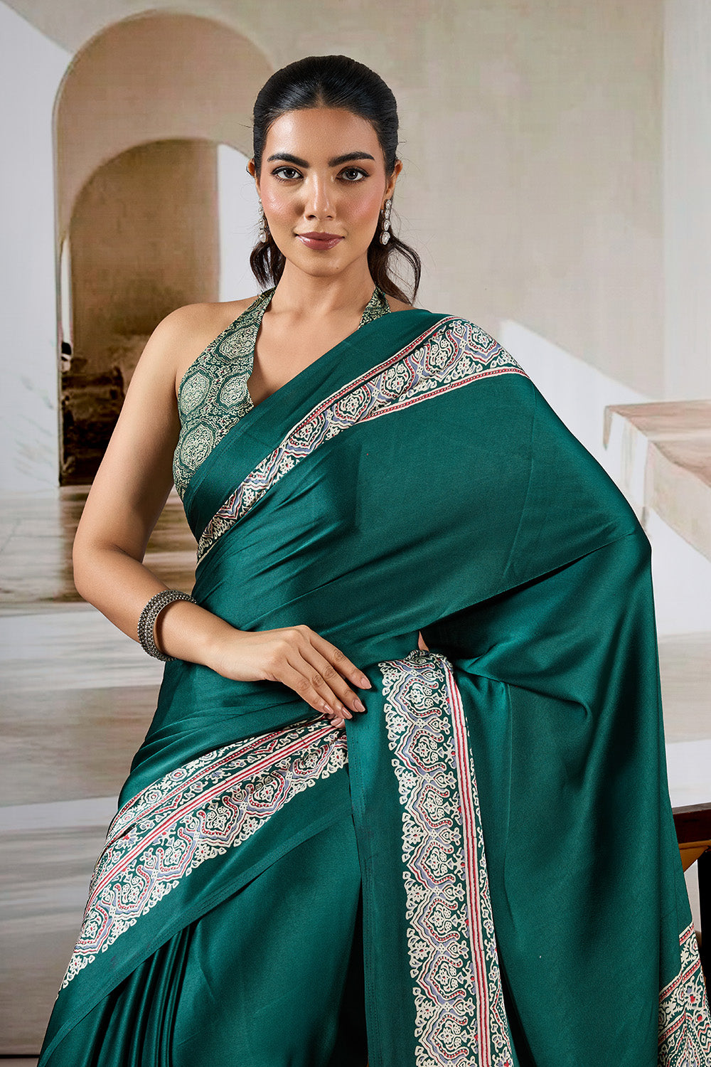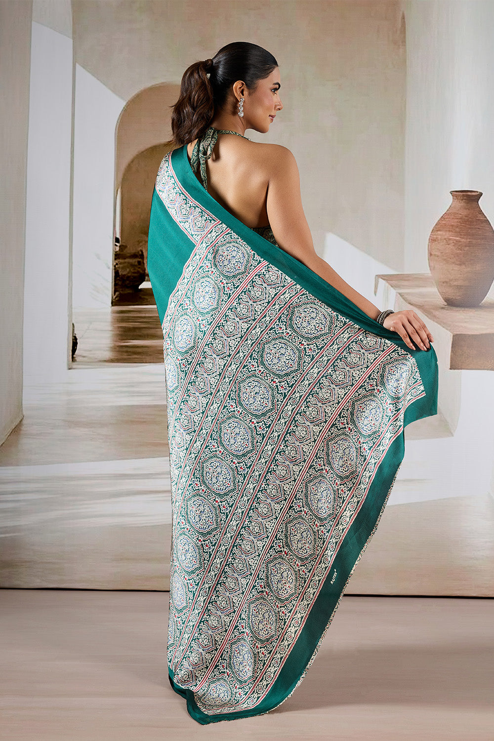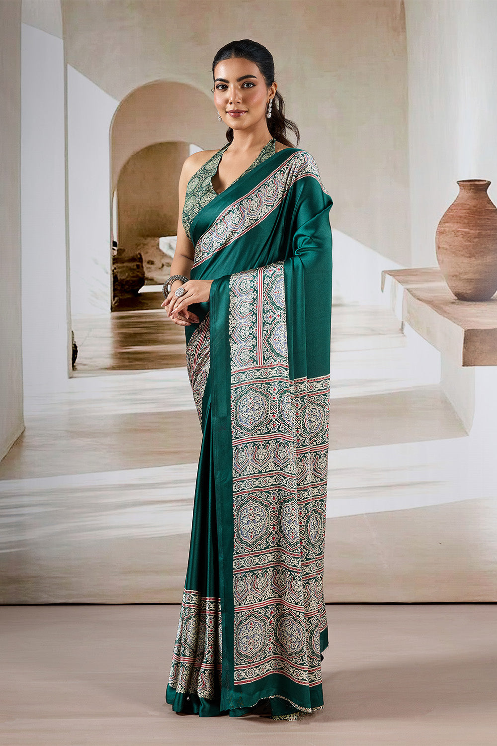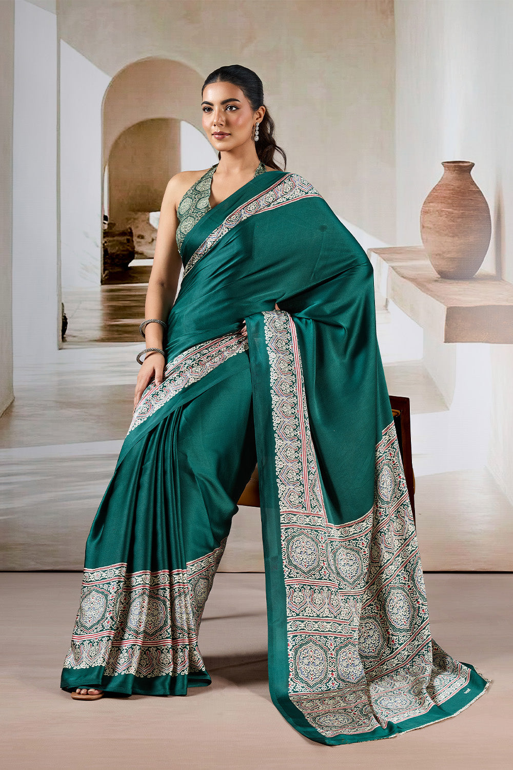 Green Printed Ajarakh Satin Crepe Saree