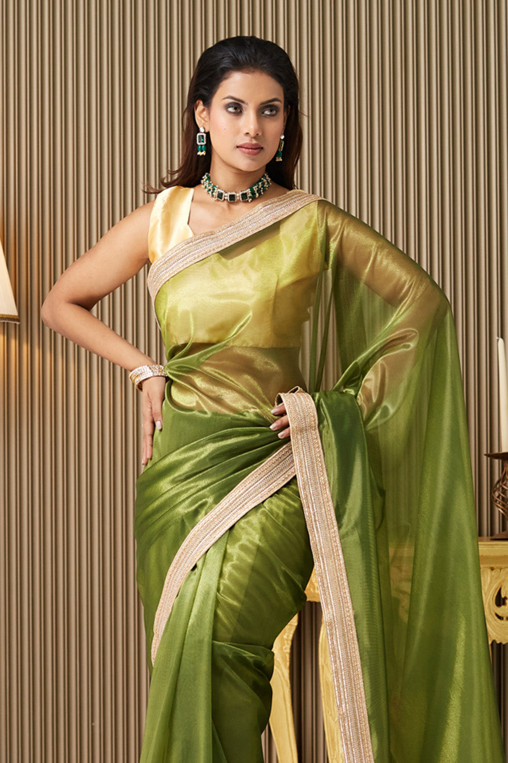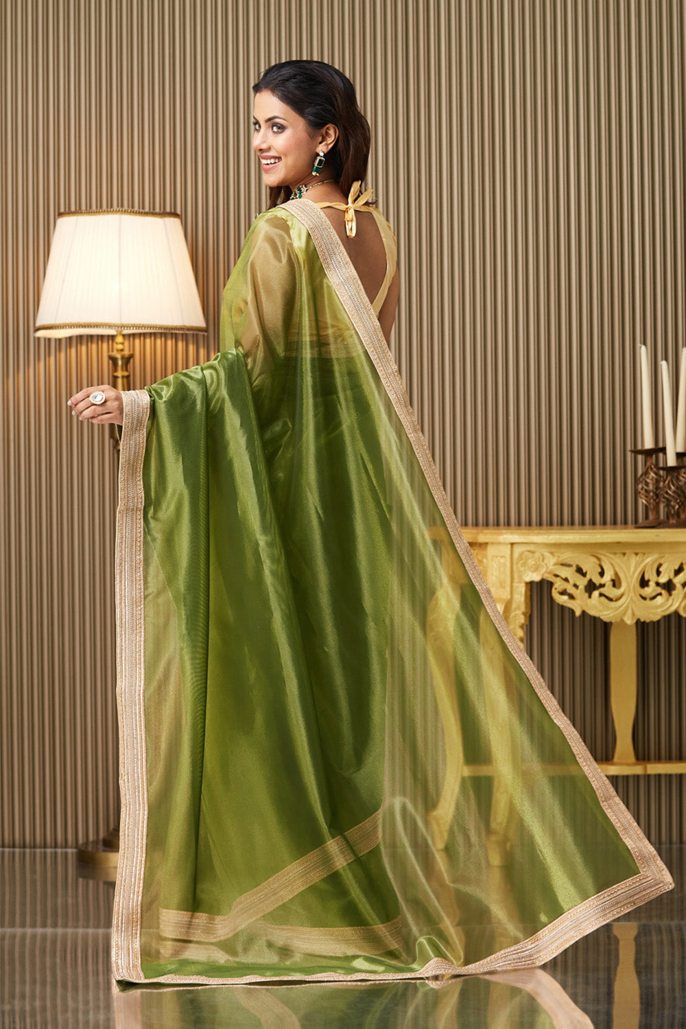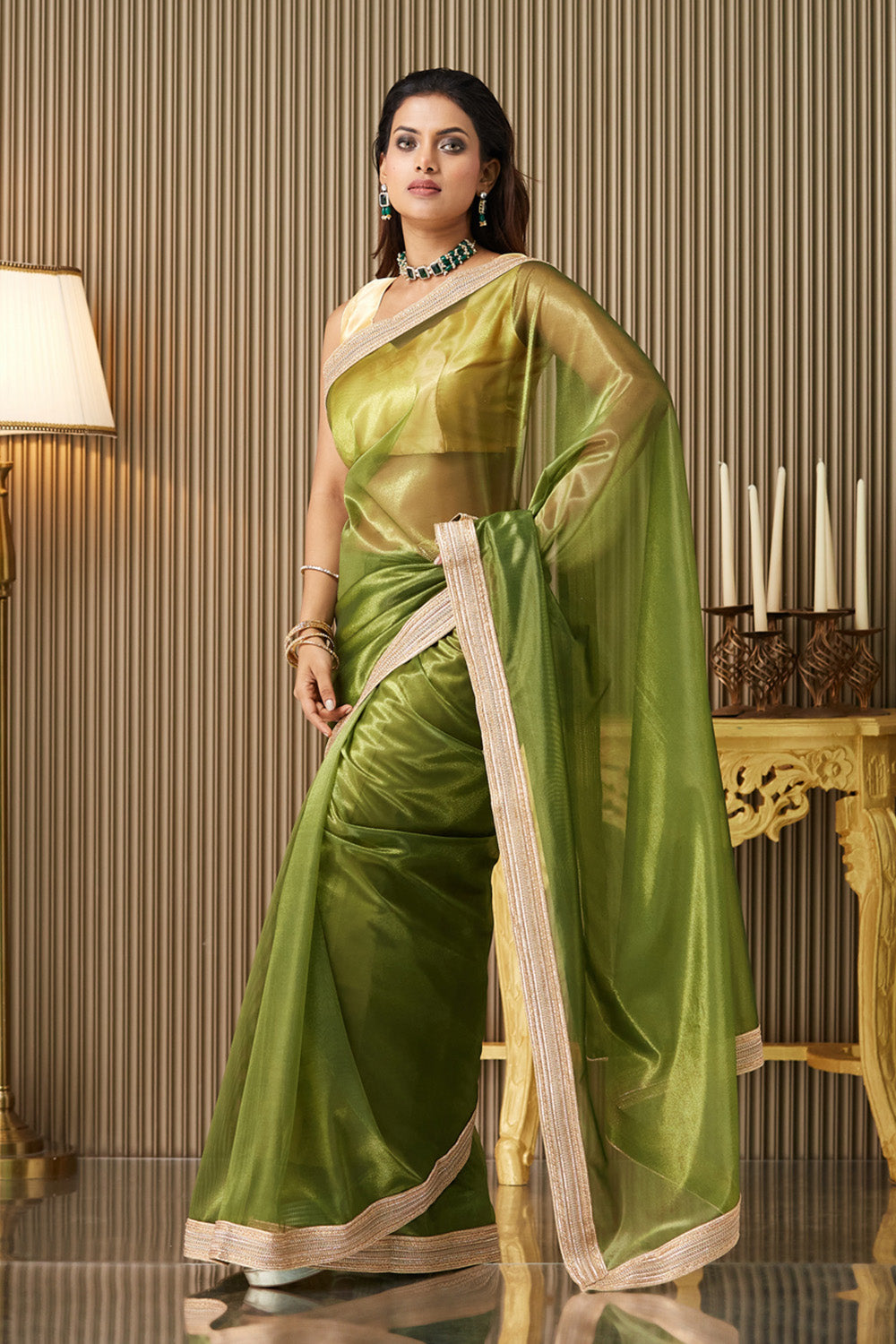 Green Solid Net Saree With Blouse
